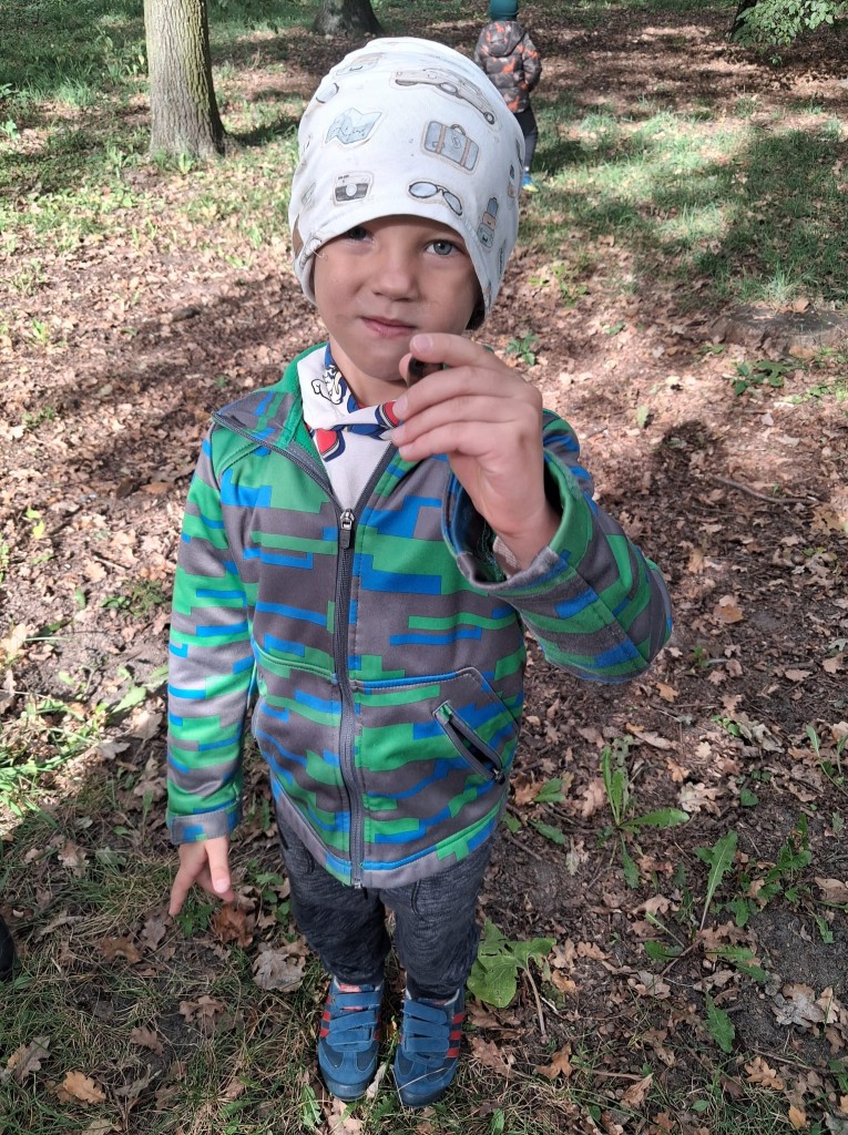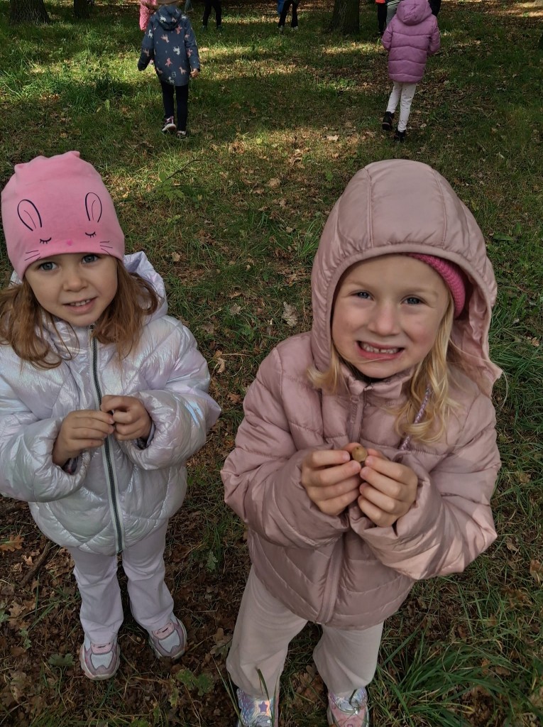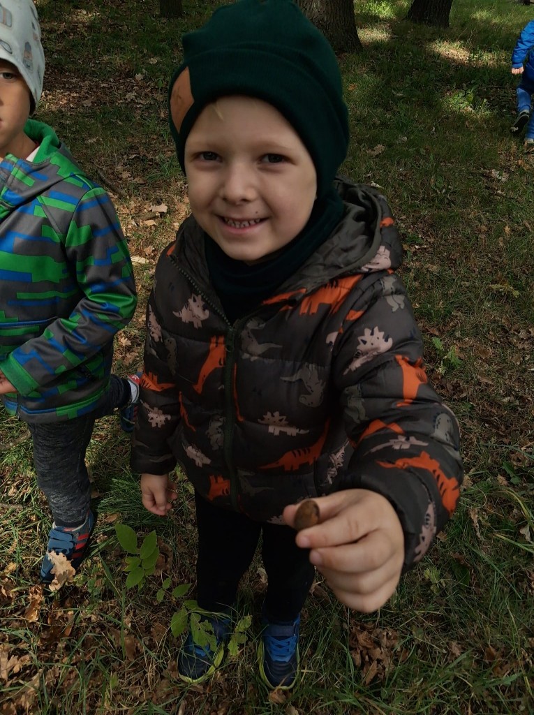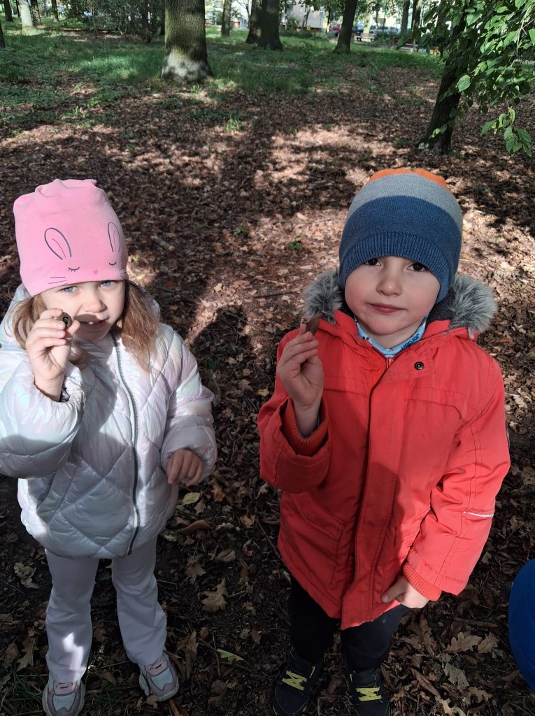 We czwartek, 02.10.2025r., w związku z realizowaną tematyką tygodnia, prosto po zupie wybraliśmy się na wycieczkę do Zofii Lasku w poszukiwaniu “darów jesieni”. Podczas wycieczki rozpoznawaliśmy i nazywaliśmy wybrane drzewa oraz ich owoce. Po przyjściu wymienialiśmy spostrzeżenia z wycieczki i segregowaliśmy zebrane „dary jesieni”. Przyniesione „dary” wzbogaciły nasz grupowy „Kącik Przyrody”.