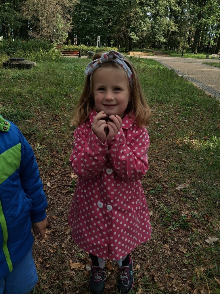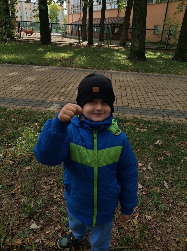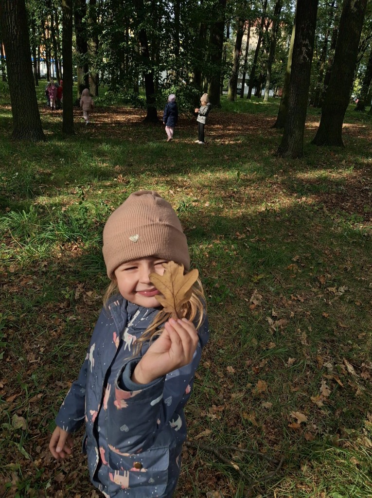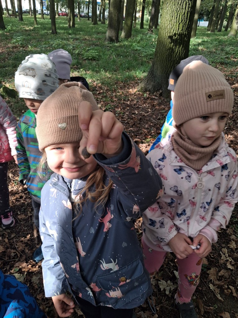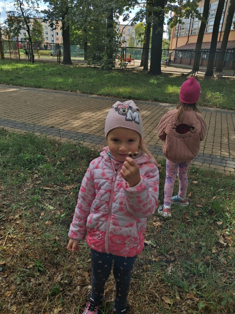 We czwartek, 02.10.2025r., w związku z realizowaną tematyką tygodnia, prosto po zupie wybraliśmy się na wycieczkę do Zofii Lasku w poszukiwaniu “darów jesieni”. Podczas wycieczki rozpoznawaliśmy i nazywaliśmy wybrane drzewa oraz ich owoce. Po przyjściu wymienialiśmy spostrzeżenia z wycieczki i segregowaliśmy zebrane „dary jesieni”. Przyniesione „dary” wzbogaciły nasz grupowy „Kącik Przyrody”.