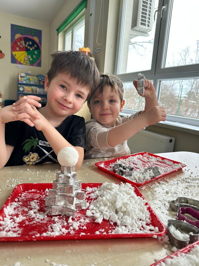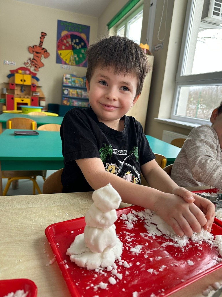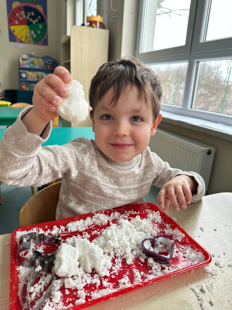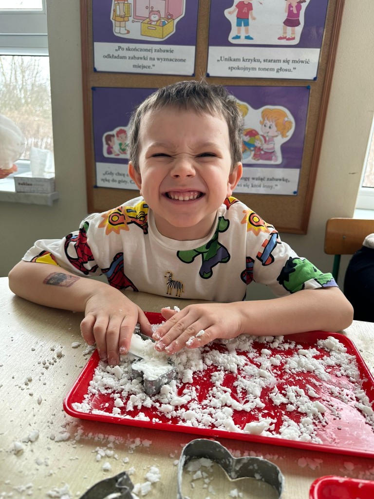 Zabawy ze sztucznym śniegiem były dla nas źródłem radości, ale także doskonałą okazją do rozwijania motoryki małej, kreatywności oraz integracji sensorycznej. Ćwiczyliśmy sprawność dłoni, współpracę w grupie oraz pobudzaliśmy wyobraźnię, tworząc własne zimowe historie.