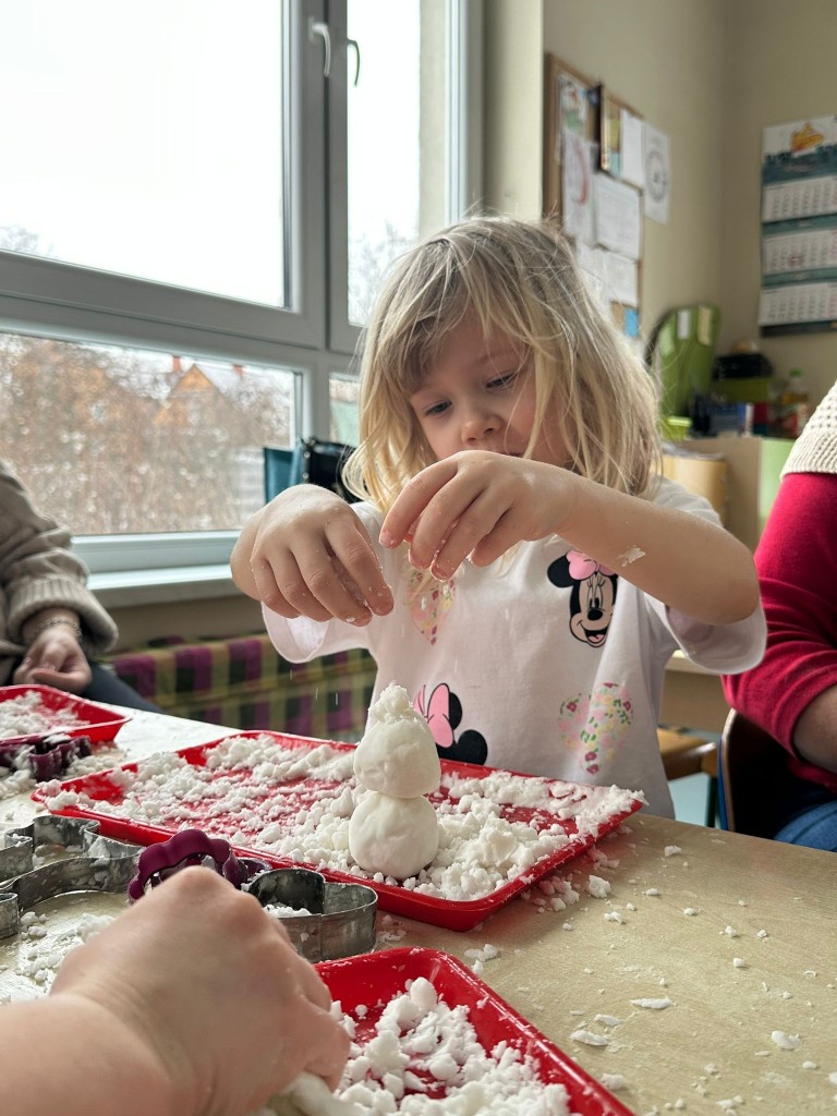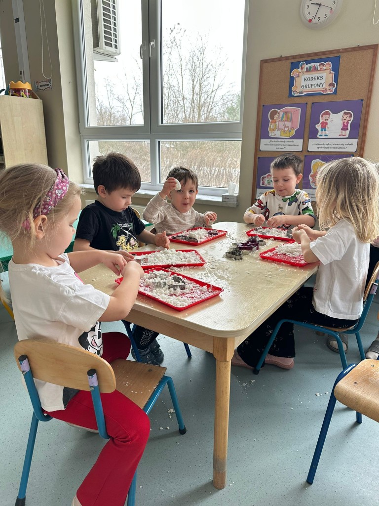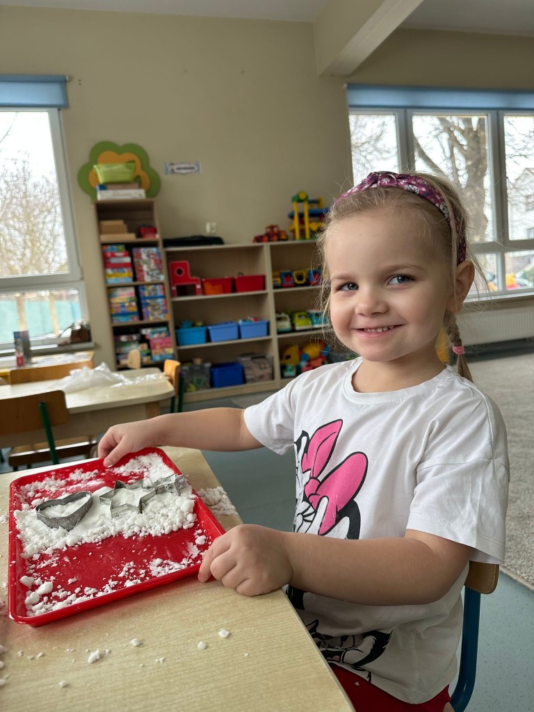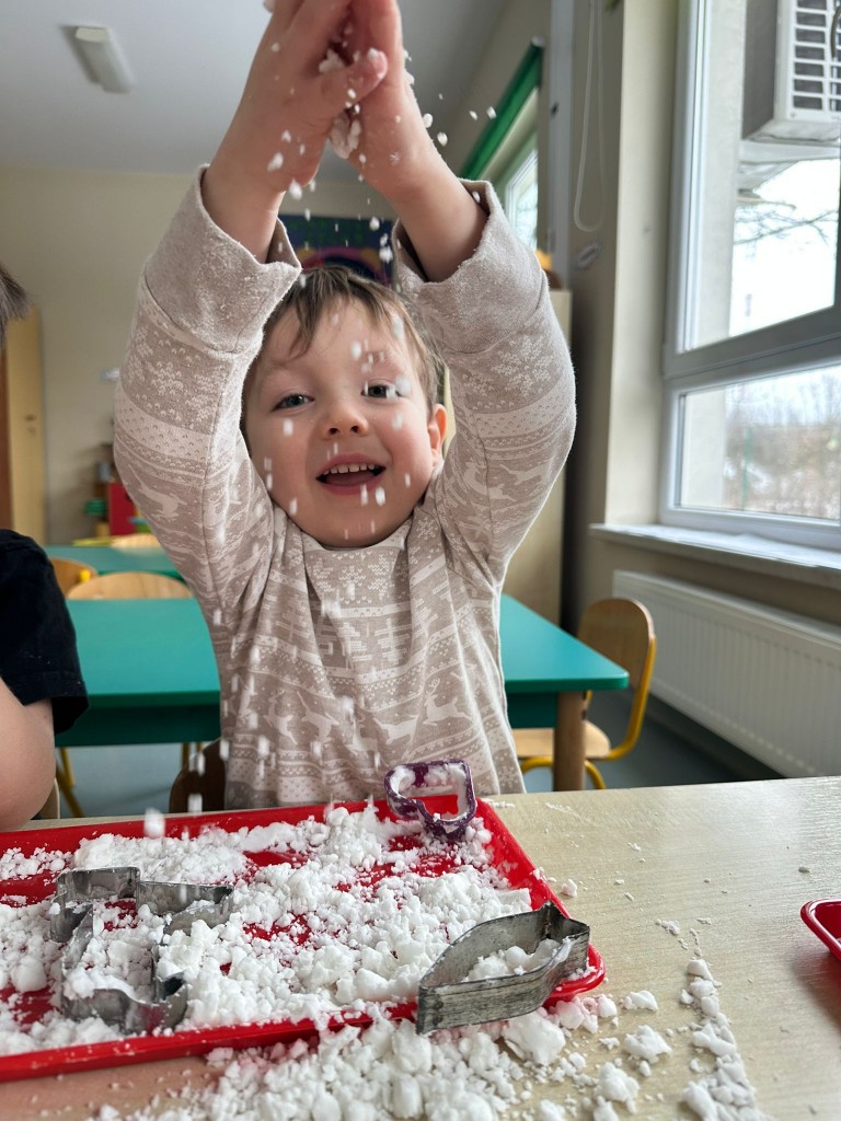 Zabawy ze sztucznym śniegiem były dla nas źródłem radości, ale także doskonałą okazją do rozwijania motoryki małej, kreatywności oraz integracji sensorycznej. Ćwiczyliśmy sprawność dłoni, współpracę w grupie oraz pobudzaliśmy wyobraźnię, tworząc własne zimowe historie.