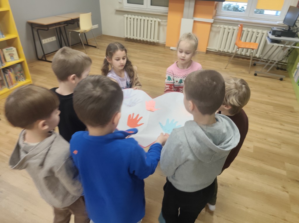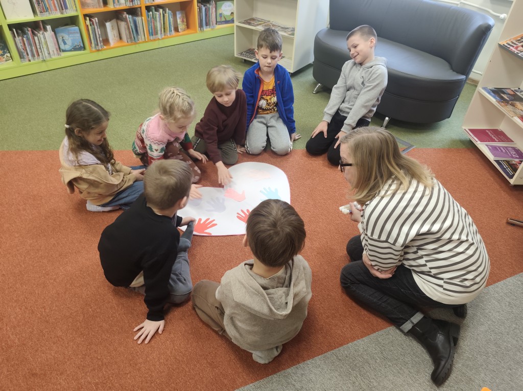 Podczas zajęć w Bibliotece Pedagogicznej wspólnie zastanawialiśmy się, gdzie można znaleźć dobroć i jak ją rozpoznawać na co dzień. Słuchając książki, odkryliśmy, że dobroć kryje się w małych gestach – w uśmiechu, w pomocy koledze, w dobrym słowie i w uważnym słuchaniu innych.