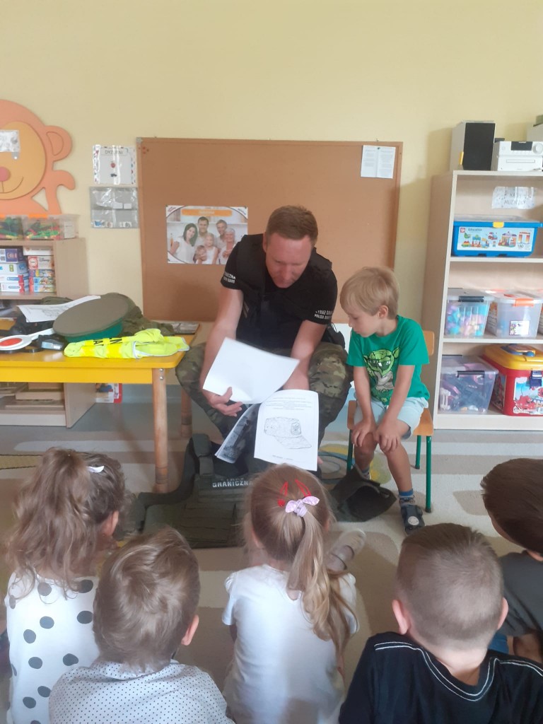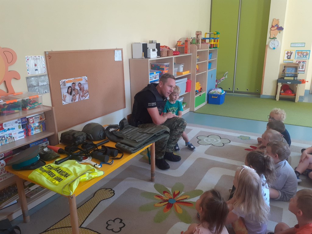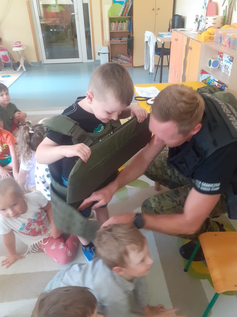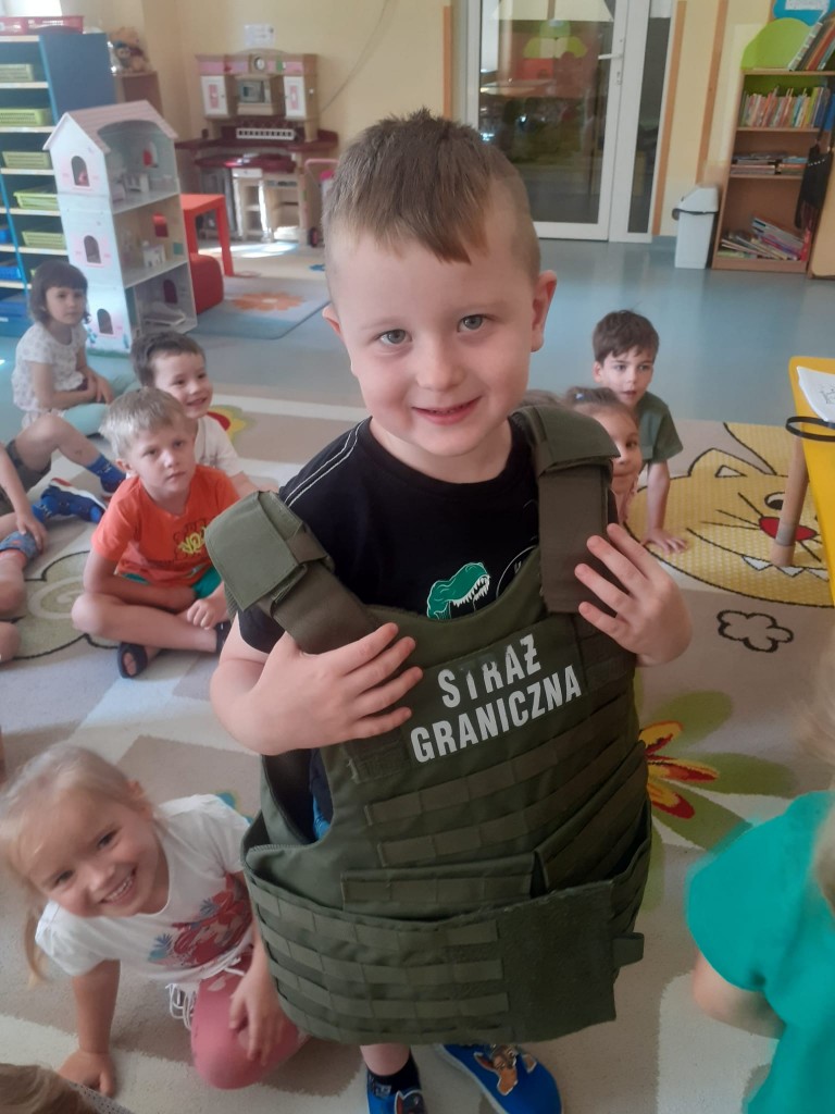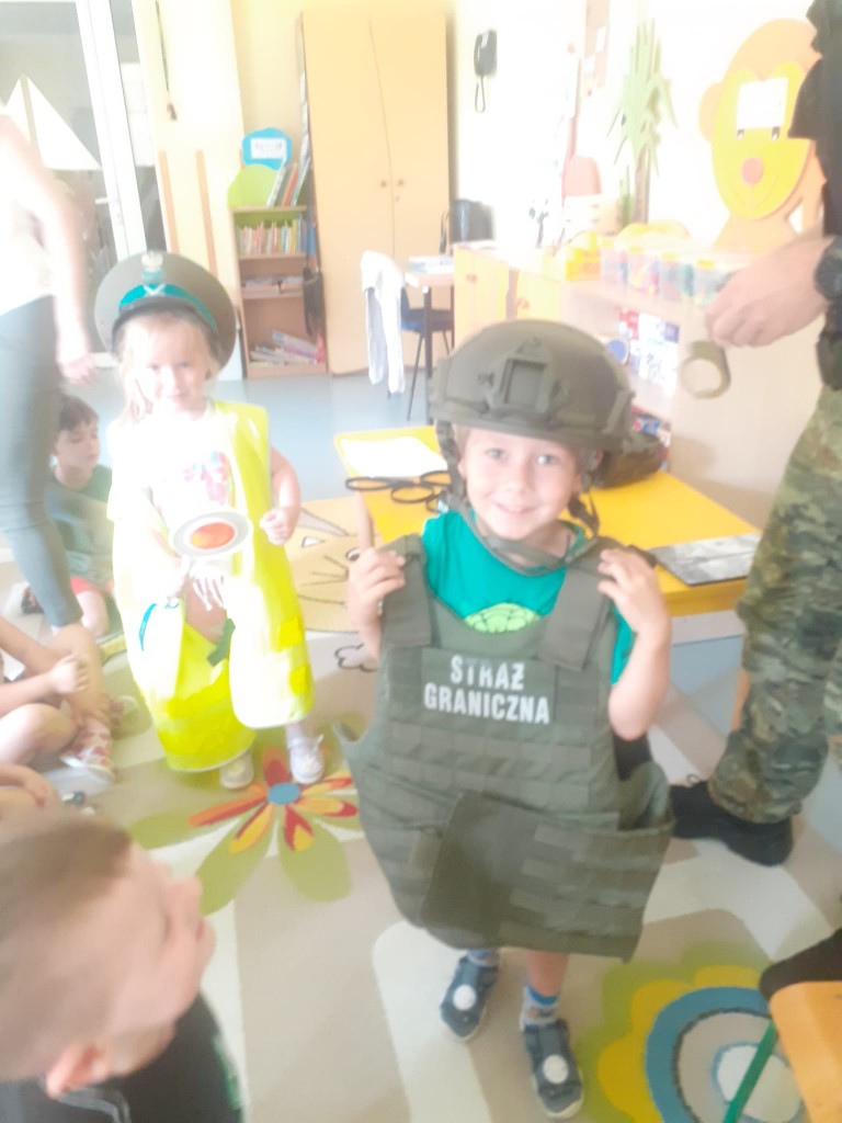 Realizując tematykę tygodnia poświęconą Tacie mieliśmy możliwość przyjrzeć się zawodom, jakie wykonują nasi tatusiowie. 17 czerwca naszą sale odwiedził tata Juliana funkcjonariusz Straży Granicznej, który opowiedział nam o swojej pracy. Główną atrakcją spotkania był pokaz sprzętu, który funkcjonariusze Straży Granicznej używają w czasie pełnienia służby. Oglądaliśmy krótki film, na którym widać było jak strzeże się granic Polski. Dzieci na zakończenie spotkania otrzymały biuletyn z zadaniami do wykonania.