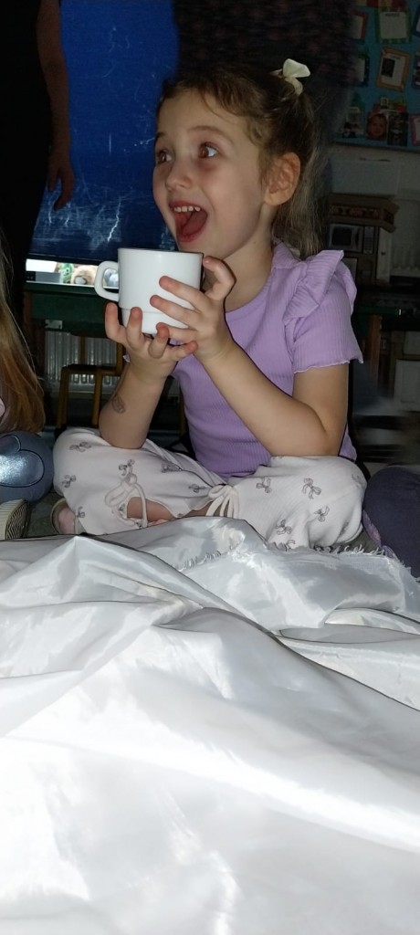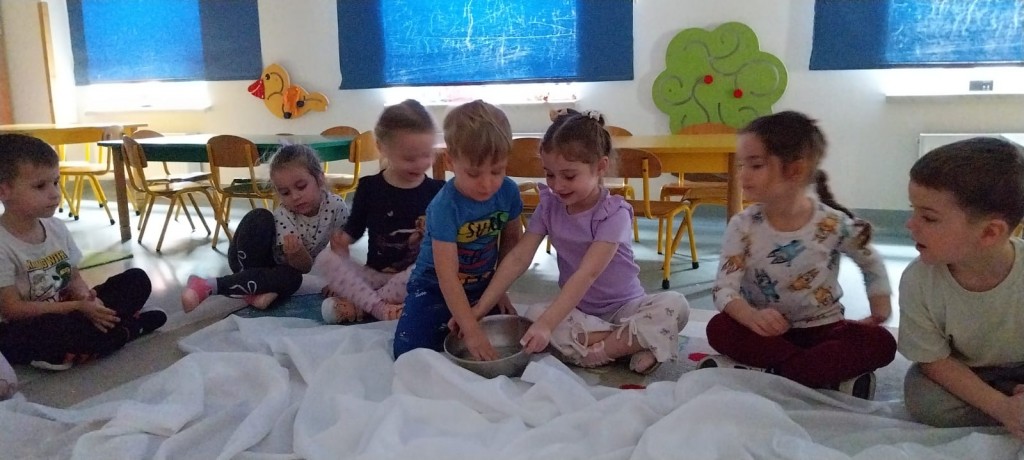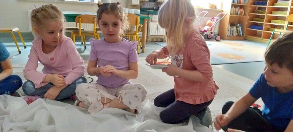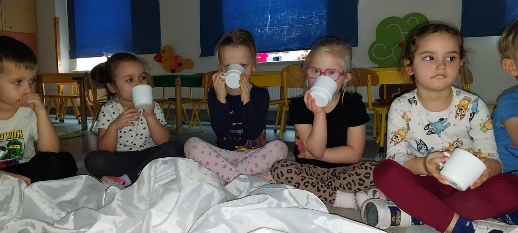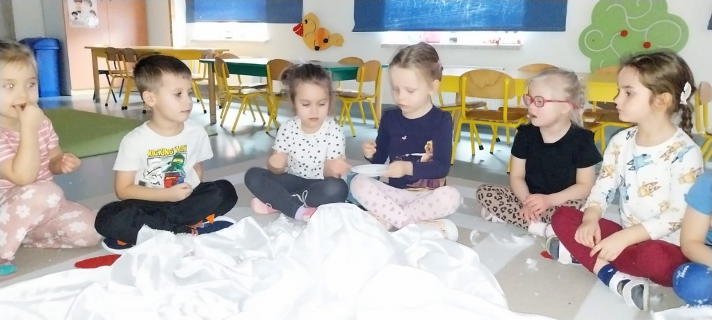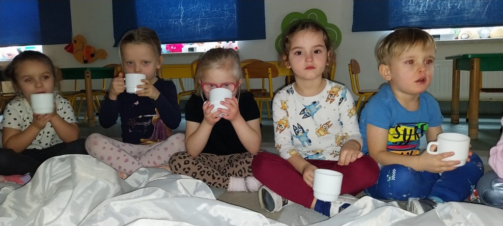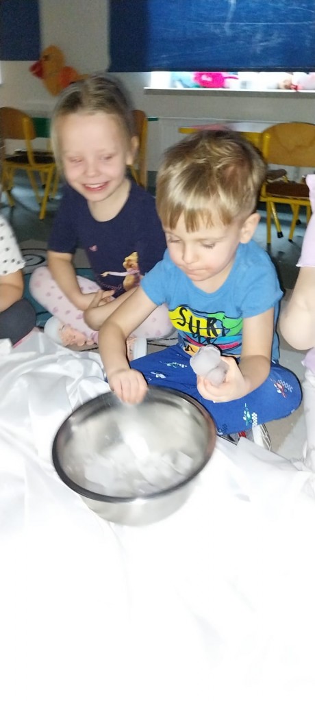 W ostatnich dniach stycznia uczestniczyliśmy w zajęciach, podczas których poznawaliśmy porę roku – zimę – z wykorzystaniem metody Porannego Kręgu, angażując wszystkie nasze zmysły. Doświadczaliśmy zimy na różne sposoby. Bawiliśmy się między innymi lodem i śniegiem, obserwując ich temperaturę, strukturę i zmiany zachodzące pod wpływem ciepła dłoni. Była to doskonała okazja do rozwijania ciekawości, wrażliwości sensorycznej i umiejętności badawczych. Po aktywnościach ruchowych i sensorycznych rozgrzaliśmy się ciepłą herbatą miętową, która wprowadziła przyjemny, zimowy klimat i pozwoliła chwilę odpocząć.