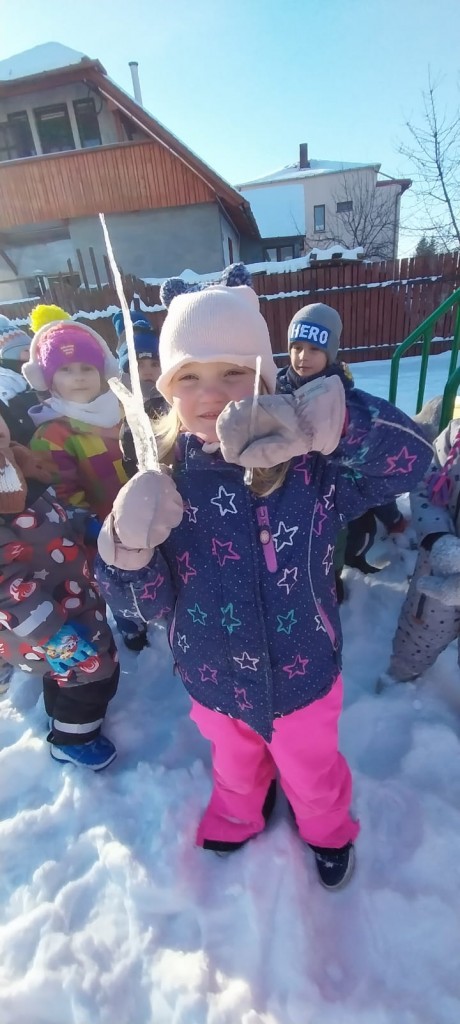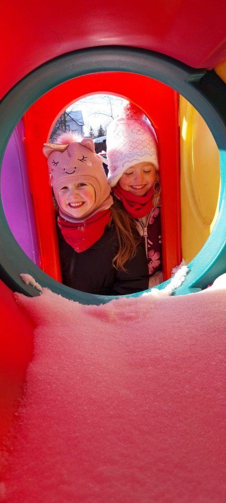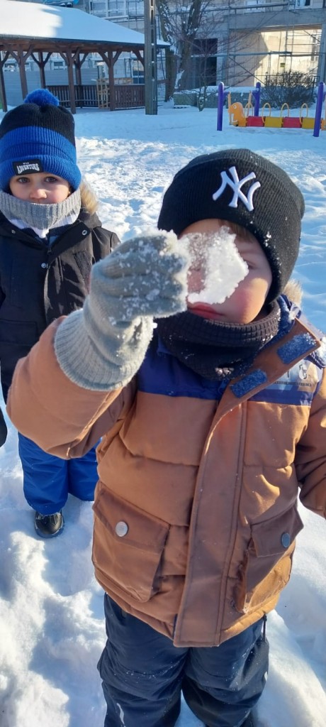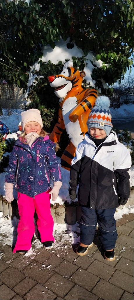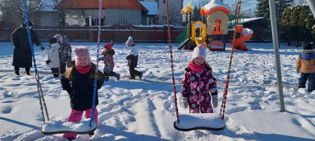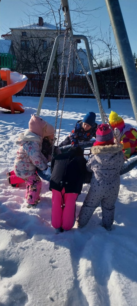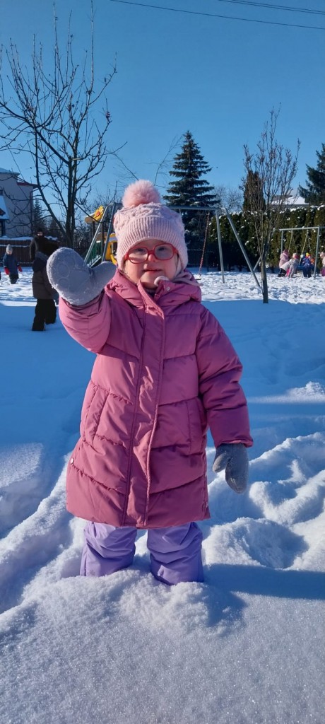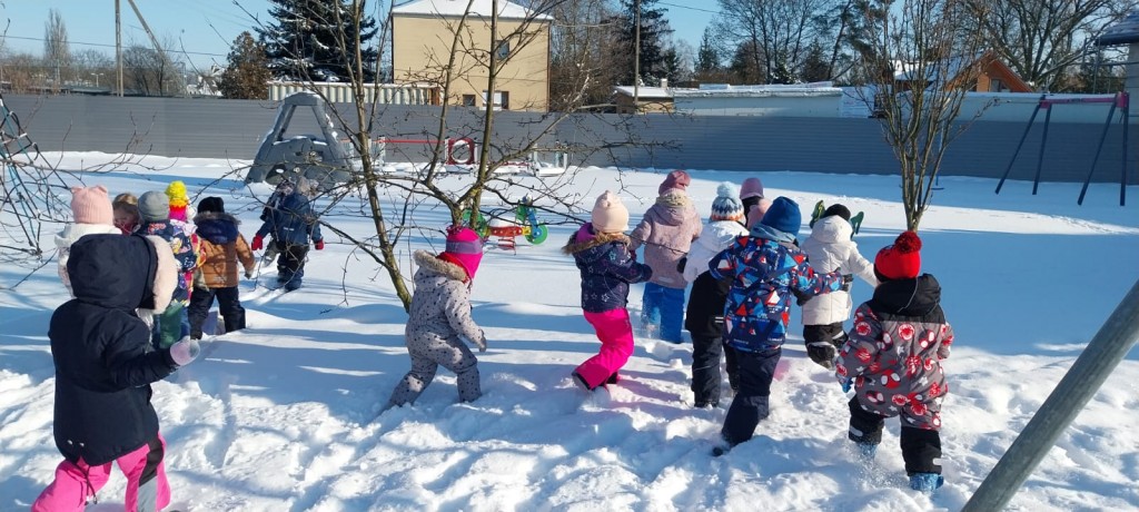 W mroźny lecz słoneczny dzień 4 latki skorzystały z zimowej pogody i wybrały się na krótkie zabawy na świeżym powietrzu. Dzieci z radością odkrywały śnieg, próbowały lepić małe bałwanki i zostawiały ślady na białym puchu. Ze względu na niską temperaturę pobyt na dworze był skrócony i był ważnym element hartowania organizmu dzieci. A chwile spędzone na zimowych zabawach, pełen radości, uśmiechu i ruchu.