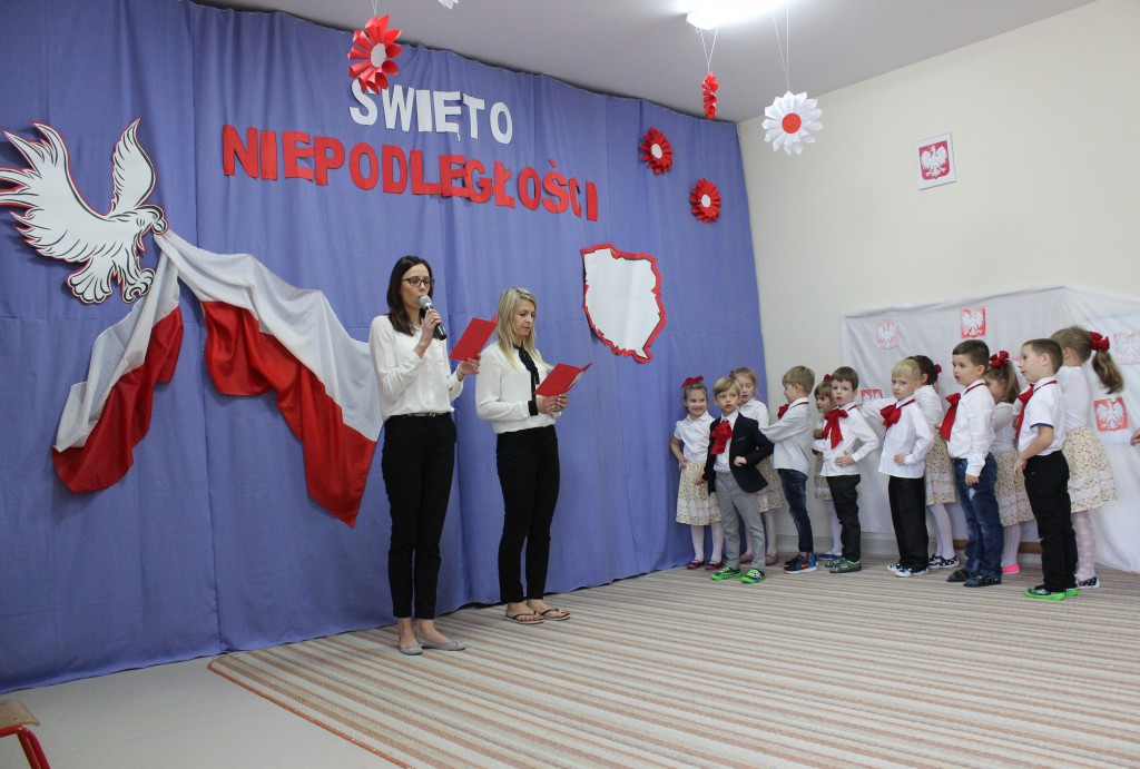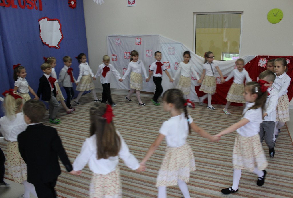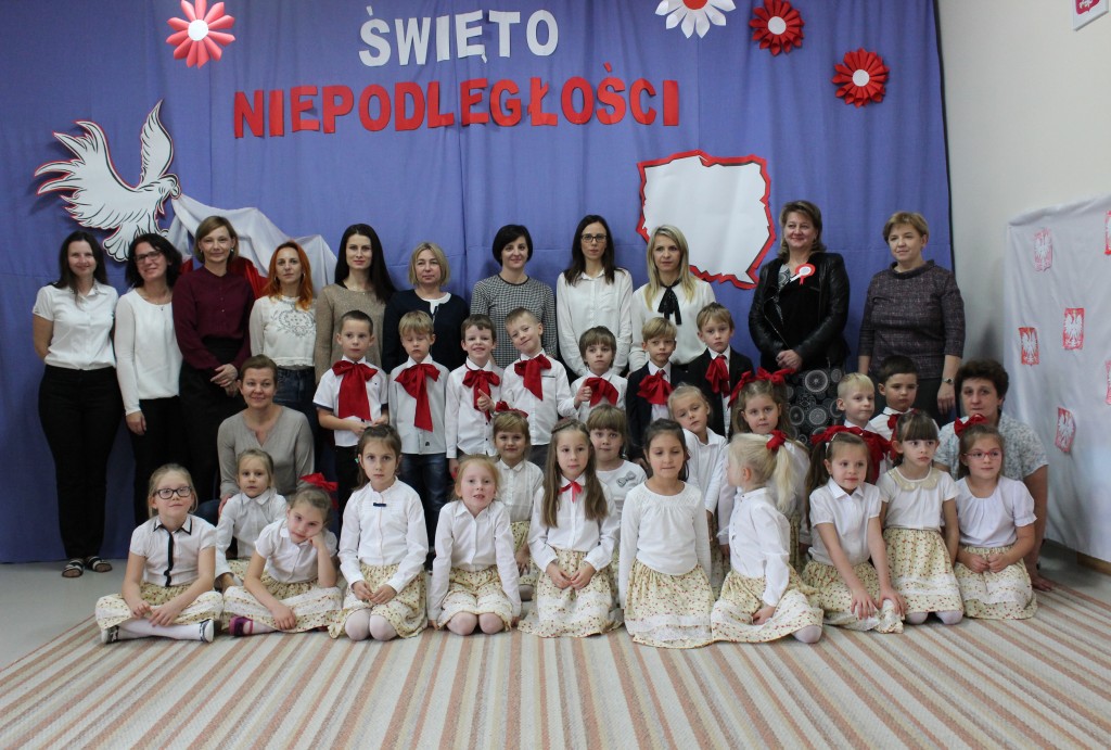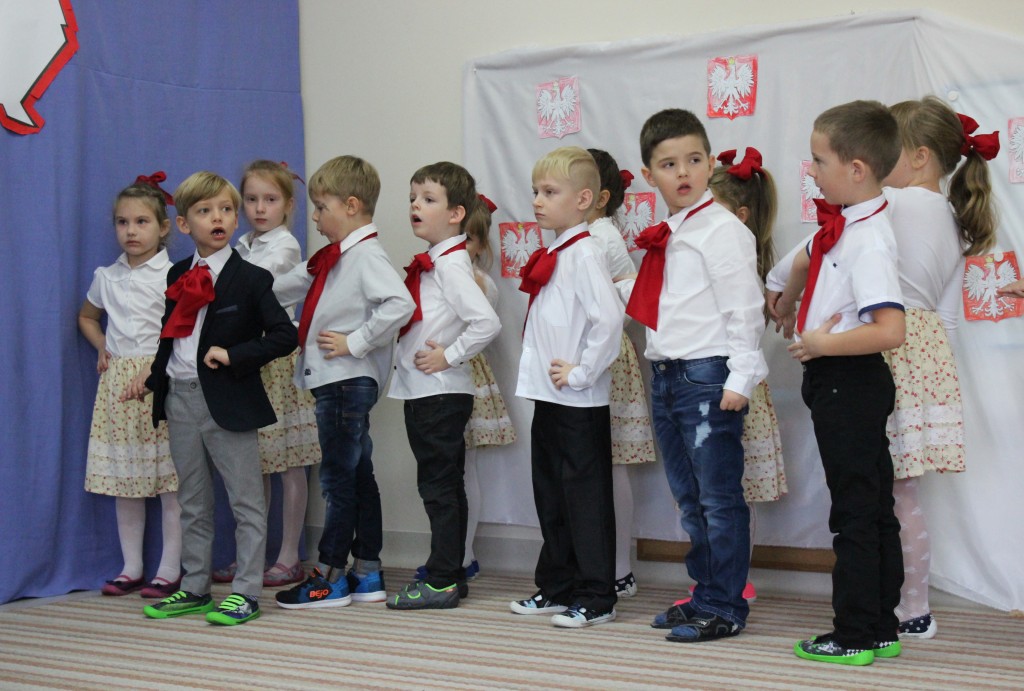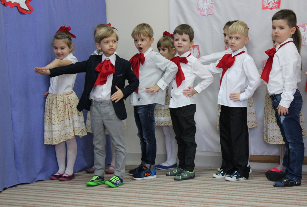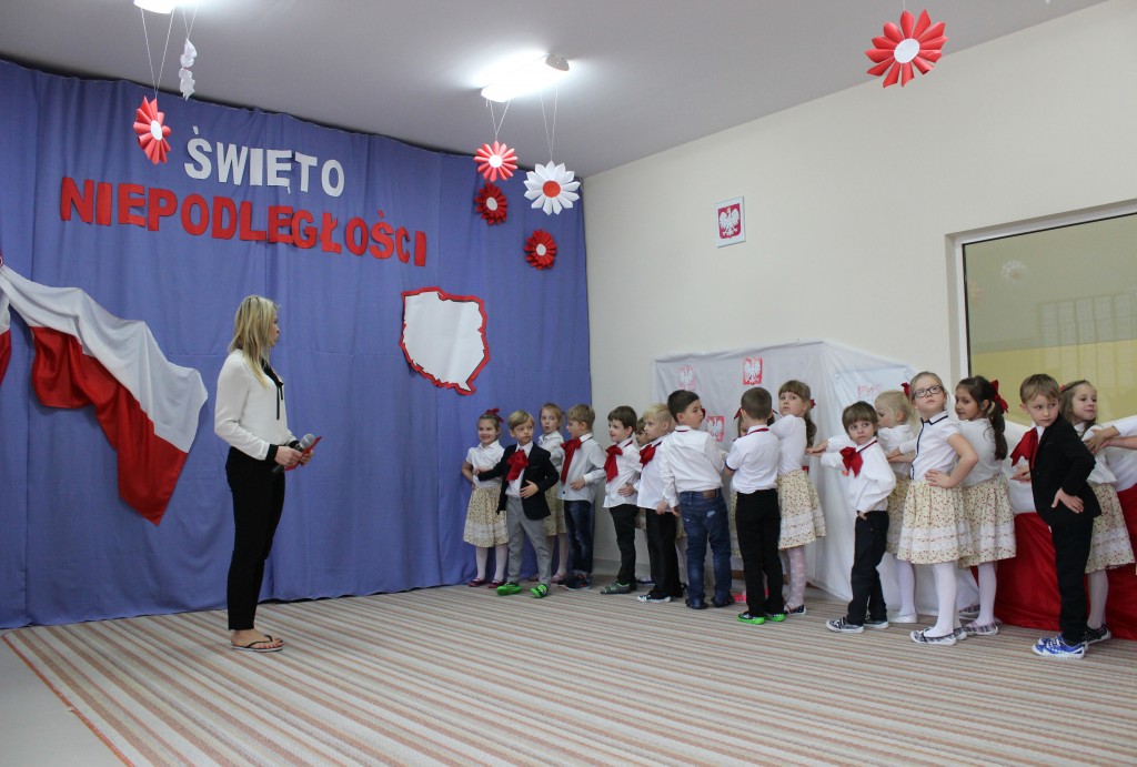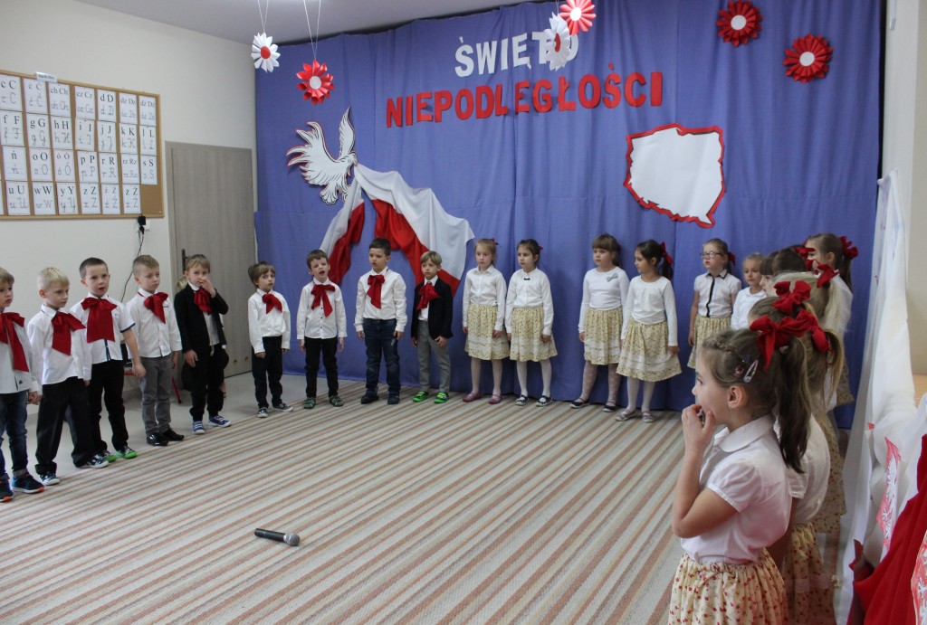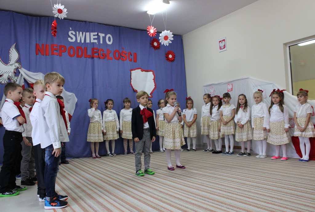 9 listopada, dzieci z grupy 6-latków zaprezentowały pozostałym przedszkolakom uroczyste wystąpienie upamiętniające 99. rocznicę odzyskania przez Polskę niepodległości. Montaż słowno-muzyczny wzbogacony był o odśpiewanie Mazurka Dąbrowskiego, naszego Hymnu Narodowego, co dodało podniosłego charakteru wydarzeniu. 6-latki ponadto zatańczyły Poloneza - reprezentacyjny polski taniec narodowy oraz odśpiewały wiele pieśni patriotycznych. Cała oprawa pozwoliła szczególnie mocno odczuć ducha dumy narodowej, zarówno paniom, jak i dzieciom - naszym małym Polakom. Pani Dyrektor, podsumowując uroczystość wydobyła istotę tego Święta i doceniła wkład włożony w staranne przygotowanie wystąpienia. Podtrzymanie tradycji obchodów 11 listopada, pozwoliło dzieciom lepiej zrozumieć czym jest Święto Niepodległości, ale niewątpliwie zaowocuje też w przyszłości, wlewając w serca naszych małych Polaków ducha patriotyzmu i wierności ojczyźnie.
