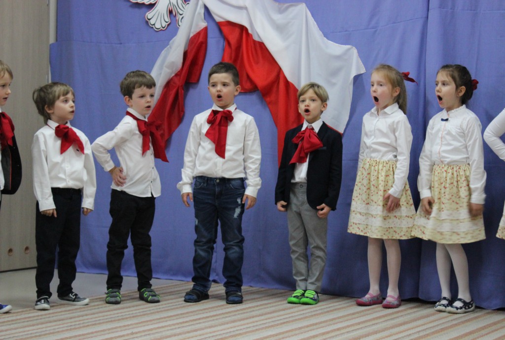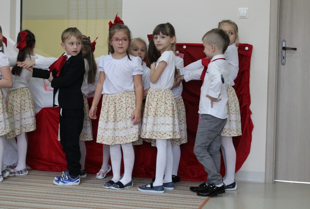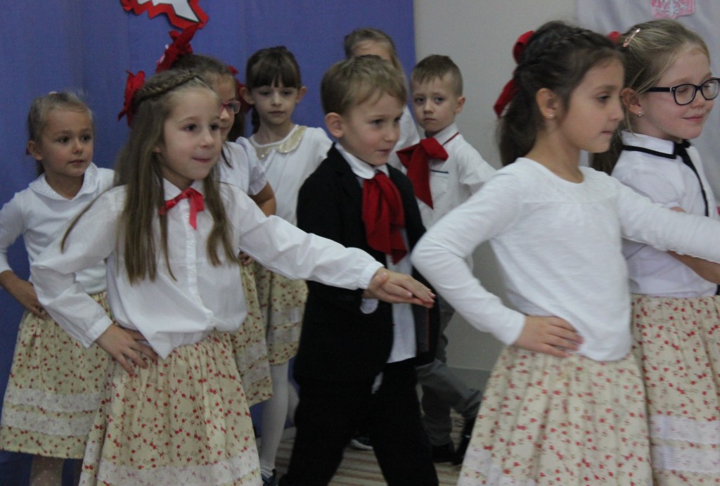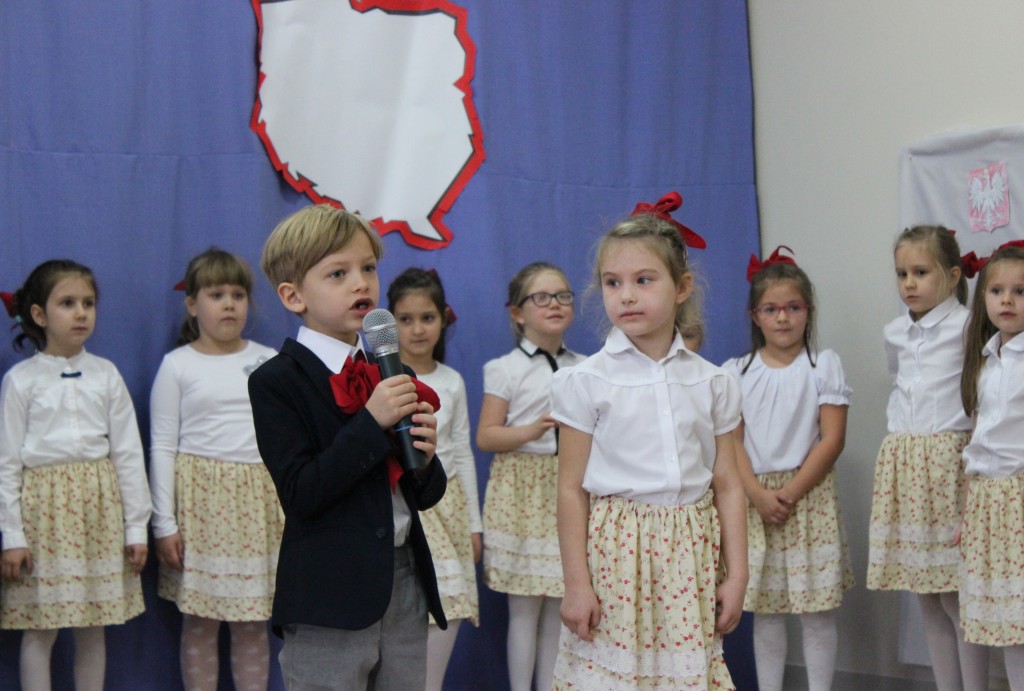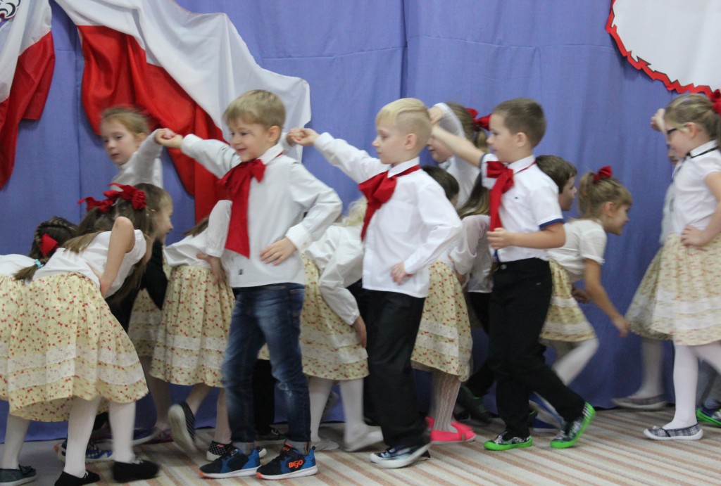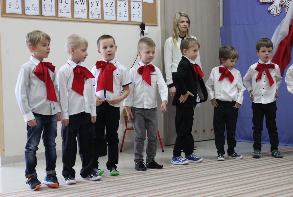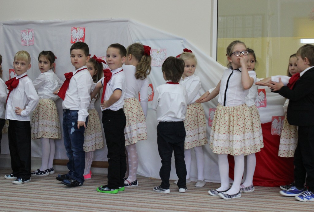 9 listopada, dzieci z grupy 6-latków zaprezentowały pozostałym przedszkolakom uroczyste wystąpienie upamiętniające 99. rocznicę odzyskania przez Polskę niepodległości. Montaż słowno-muzyczny wzbogacony był o odśpiewanie Mazurka Dąbrowskiego, naszego Hymnu Narodowego, co dodało podniosłego charakteru wydarzeniu. 6-latki ponadto zatańczyły Poloneza - reprezentacyjny polski taniec narodowy oraz odśpiewały wiele pieśni patriotycznych. Cała oprawa pozwoliła szczególnie mocno odczuć ducha dumy narodowej, zarówno paniom, jak i dzieciom - naszym małym Polakom. Pani Dyrektor, podsumowując uroczystość wydobyła istotę tego Święta i doceniła wkład włożony w staranne przygotowanie wystąpienia. Podtrzymanie tradycji obchodów 11 listopada, pozwoliło dzieciom lepiej zrozumieć czym jest Święto Niepodległości, ale niewątpliwie zaowocuje też w przyszłości, wlewając w serca naszych małych Polaków ducha patriotyzmu i wierności ojczyźnie.
