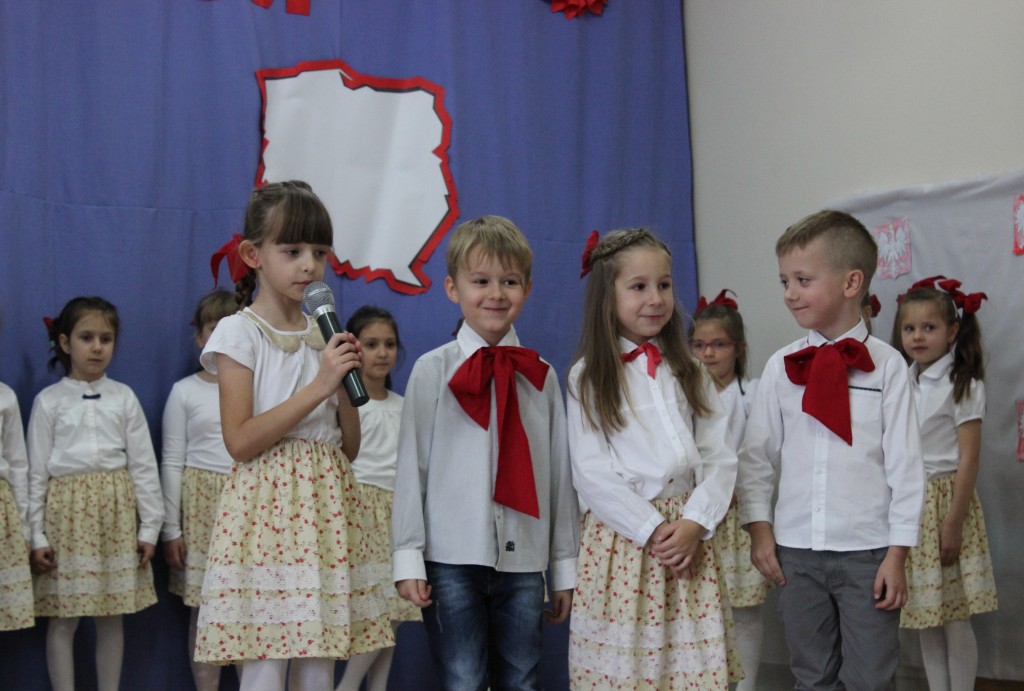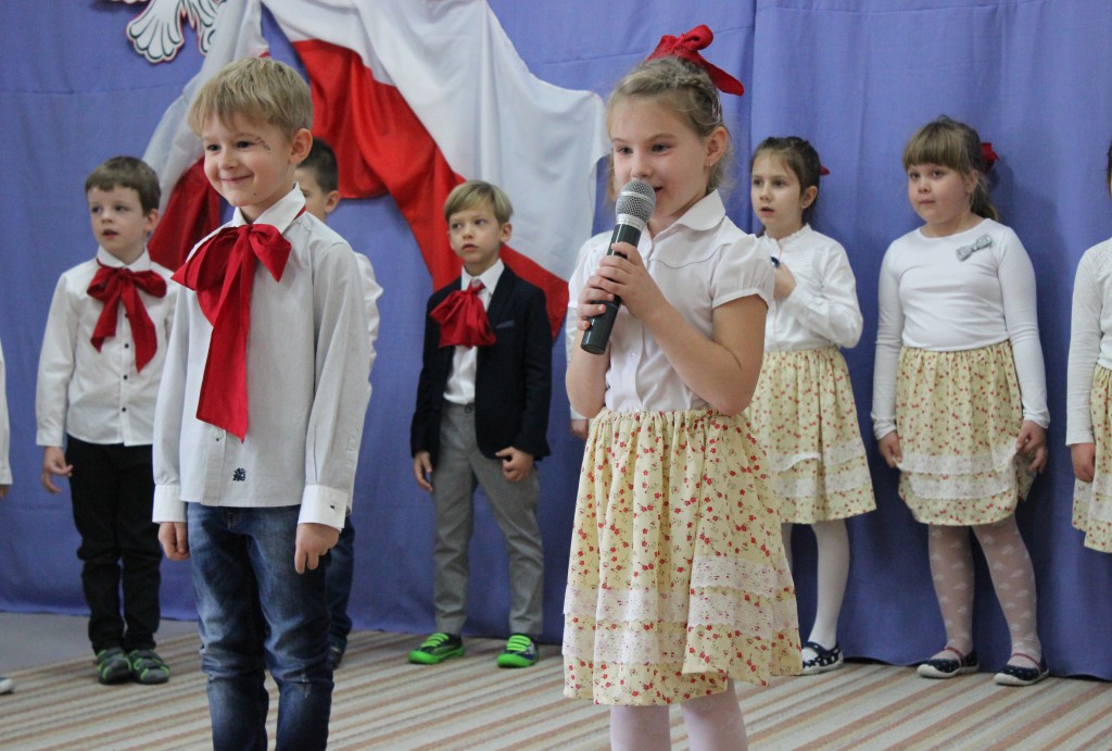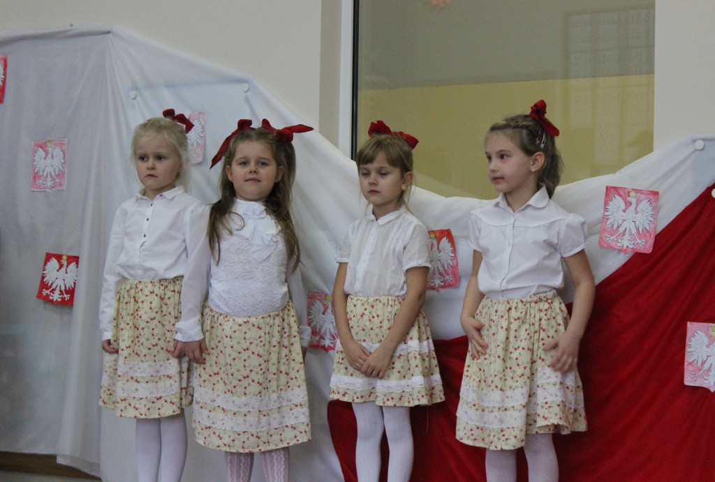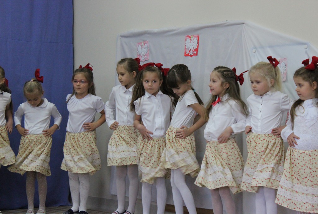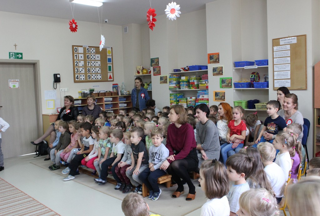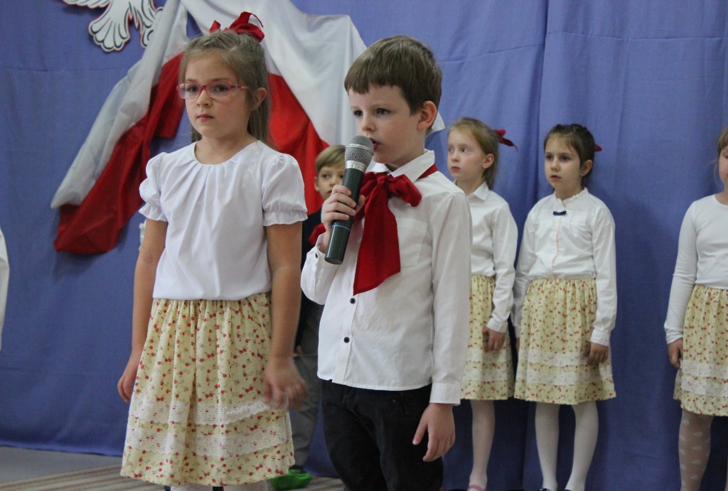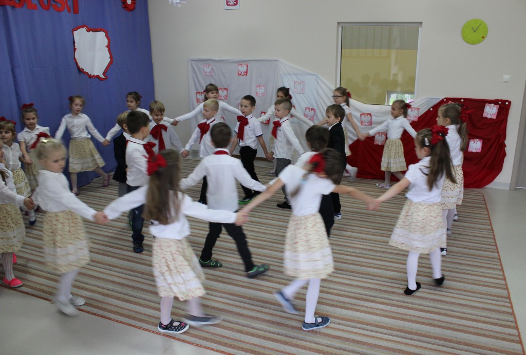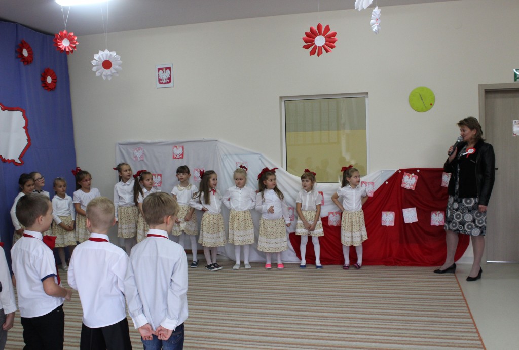 9 listopada, dzieci z grupy 6-latków zaprezentowały pozostałym przedszkolakom uroczyste wystąpienie upamiętniające 99. rocznicę odzyskania przez Polskę niepodległości. Montaż słowno-muzyczny wzbogacony był o odśpiewanie Mazurka Dąbrowskiego, naszego Hymnu Narodowego, co dodało podniosłego charakteru wydarzeniu. 6-latki ponadto zatańczyły Poloneza - reprezentacyjny polski taniec narodowy oraz odśpiewały wiele pieśni patriotycznych. Cała oprawa pozwoliła szczególnie mocno odczuć ducha dumy narodowej, zarówno paniom, jak i dzieciom - naszym małym Polakom. Pani Dyrektor, podsumowując uroczystość wydobyła istotę tego Święta i doceniła wkład włożony w staranne przygotowanie wystąpienia. Podtrzymanie tradycji obchodów 11 listopada, pozwoliło dzieciom lepiej zrozumieć czym jest Święto Niepodległości, ale niewątpliwie zaowocuje też w przyszłości, wlewając w serca naszych małych Polaków ducha patriotyzmu i wierności ojczyźnie.