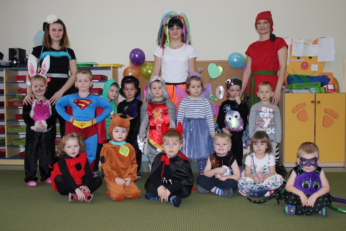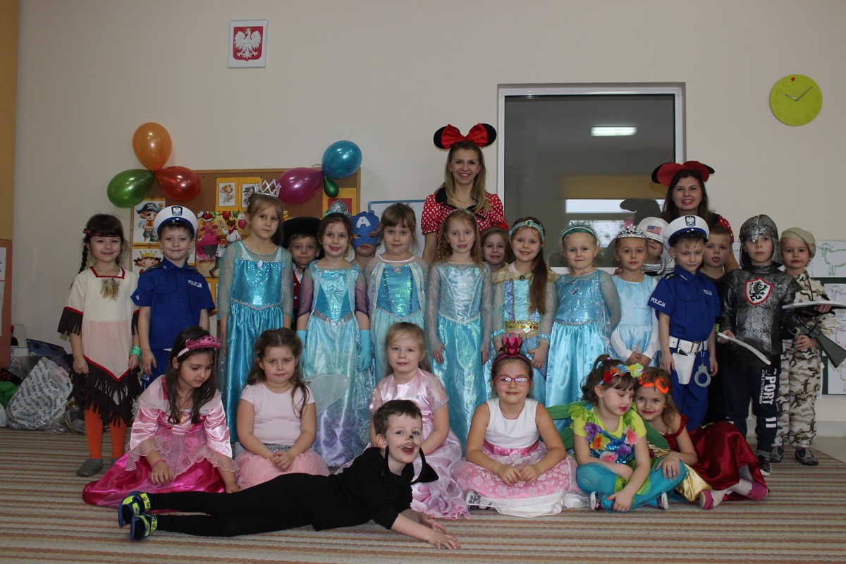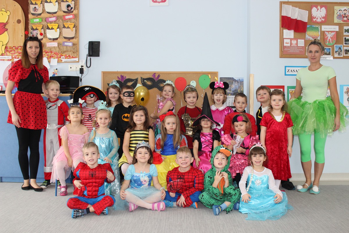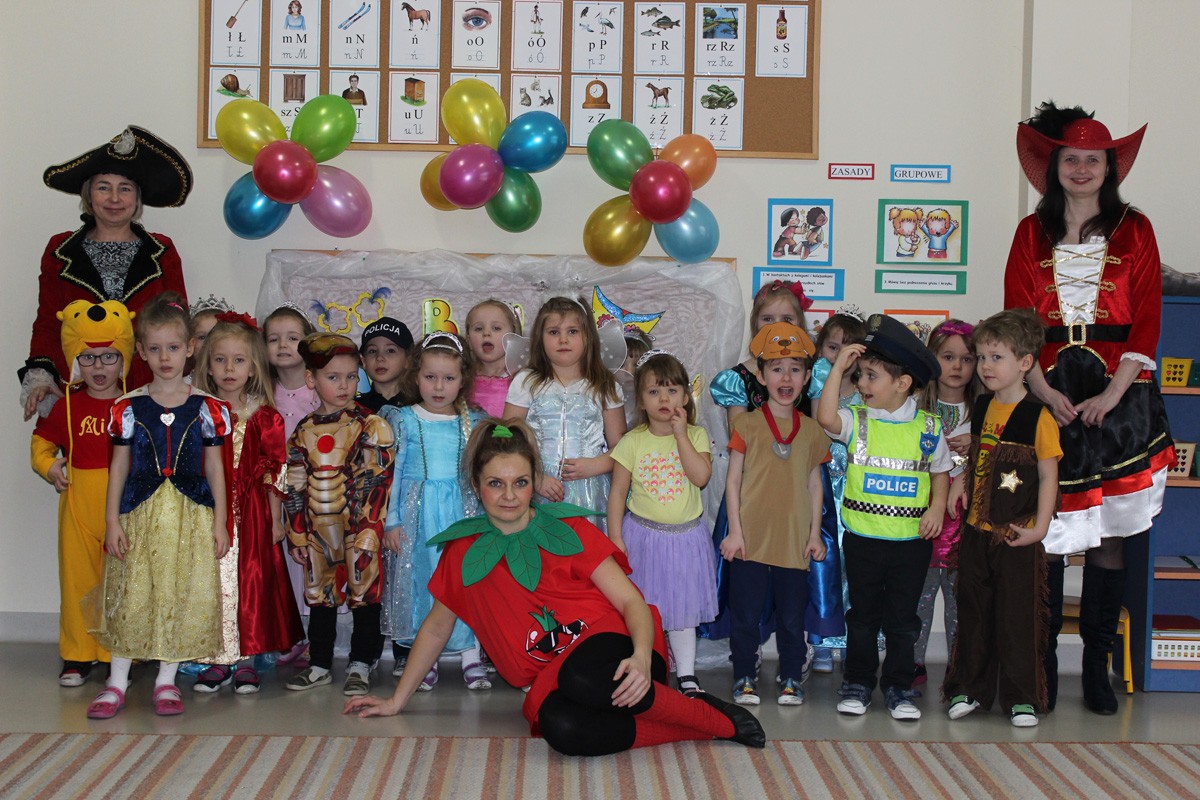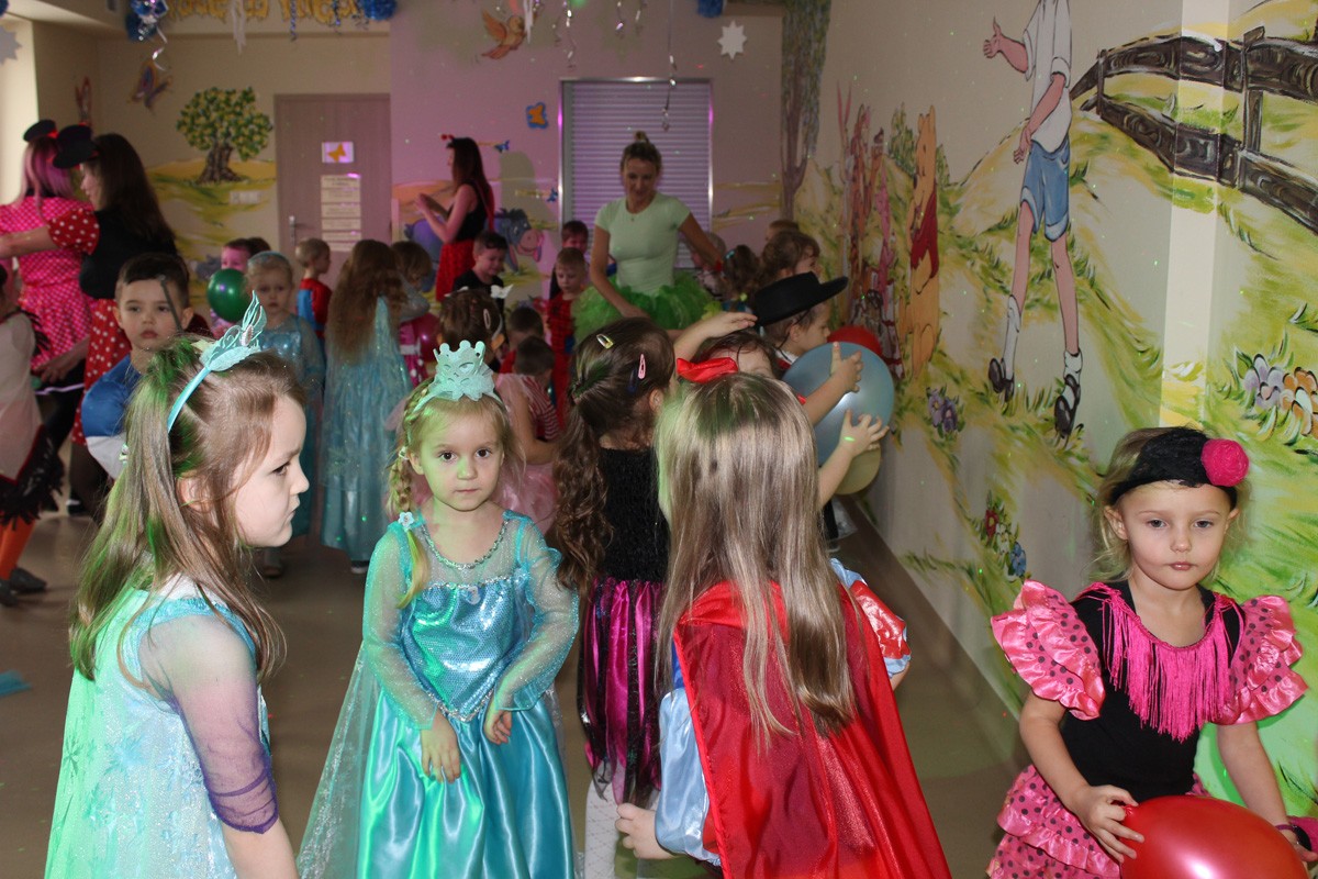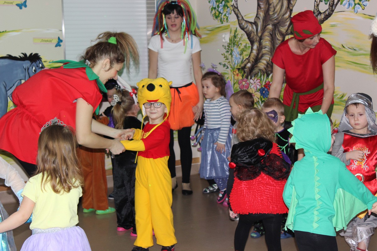 Tego dnia, po śniadaniu, dzieci z pomocą pań przebrały się w kolorowe stroje. Jak za dotknięciem czarodziejskiej różdżki, w salach zaroiło się od wróżek, biedronek, motyli, Elz, Batamnów, Spidermanów i innych postaci. W rytm skocznej melodii, wśród kolorowych baniek mydlanych, mali tańcerze wspaniale się bawili. Dzięki temu wydarzeniu, przedszkolaki miały okazję spędzić czas w atmosferze radości i choć na chwilę wcielić się w swoją ulubioną postać z bajki. Dodatkową atrakcją były prezenty od Kubusia Puchatka, które pojawiły się w naszych salach w kolorowych workach, wraz z listem od patrona naszego przedszkola.