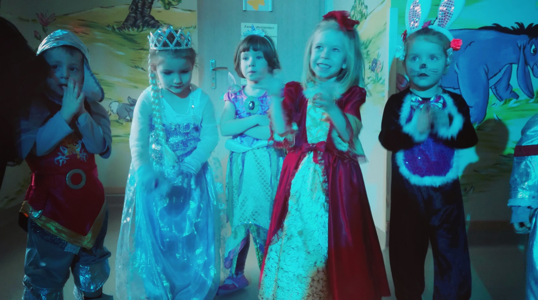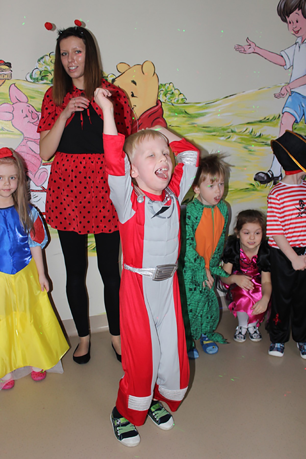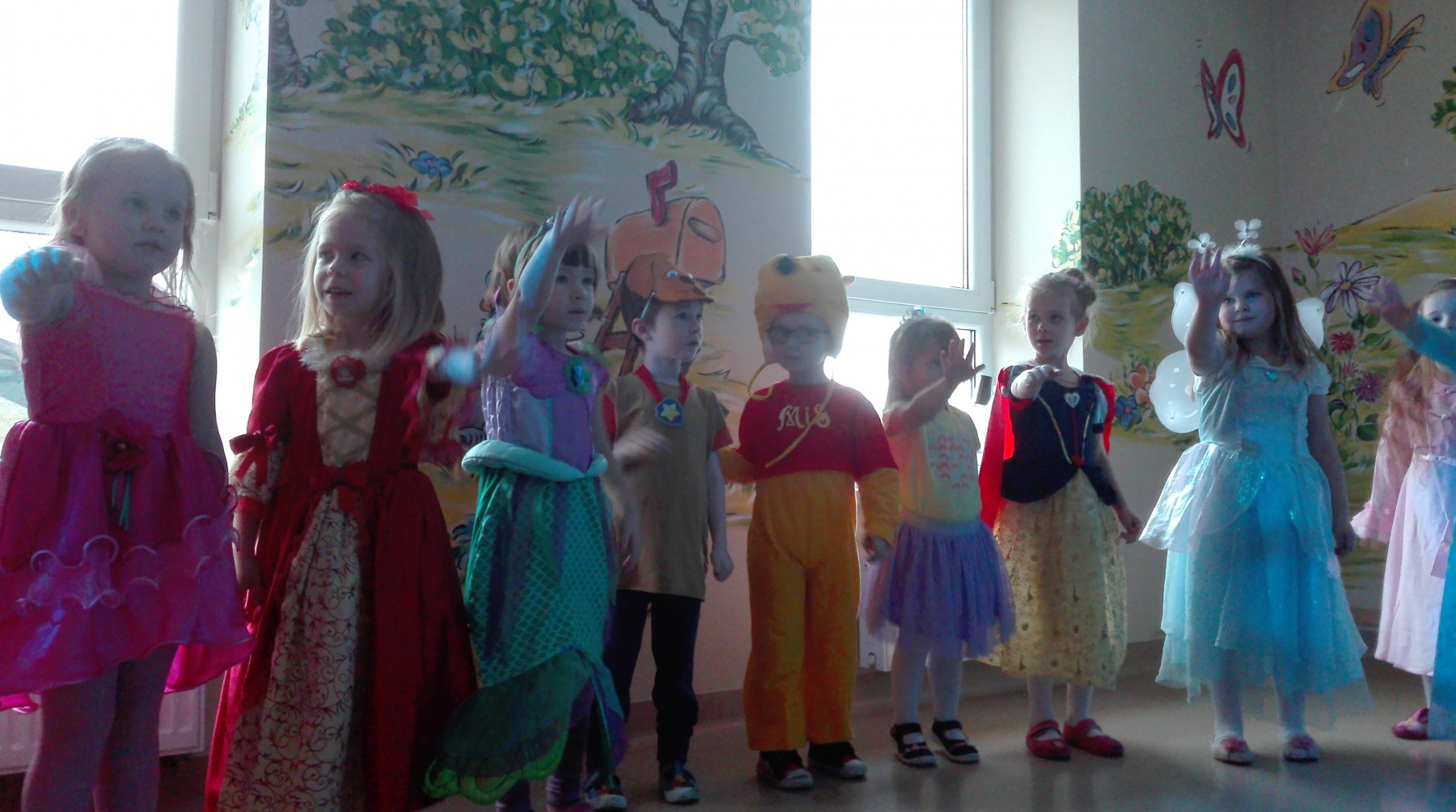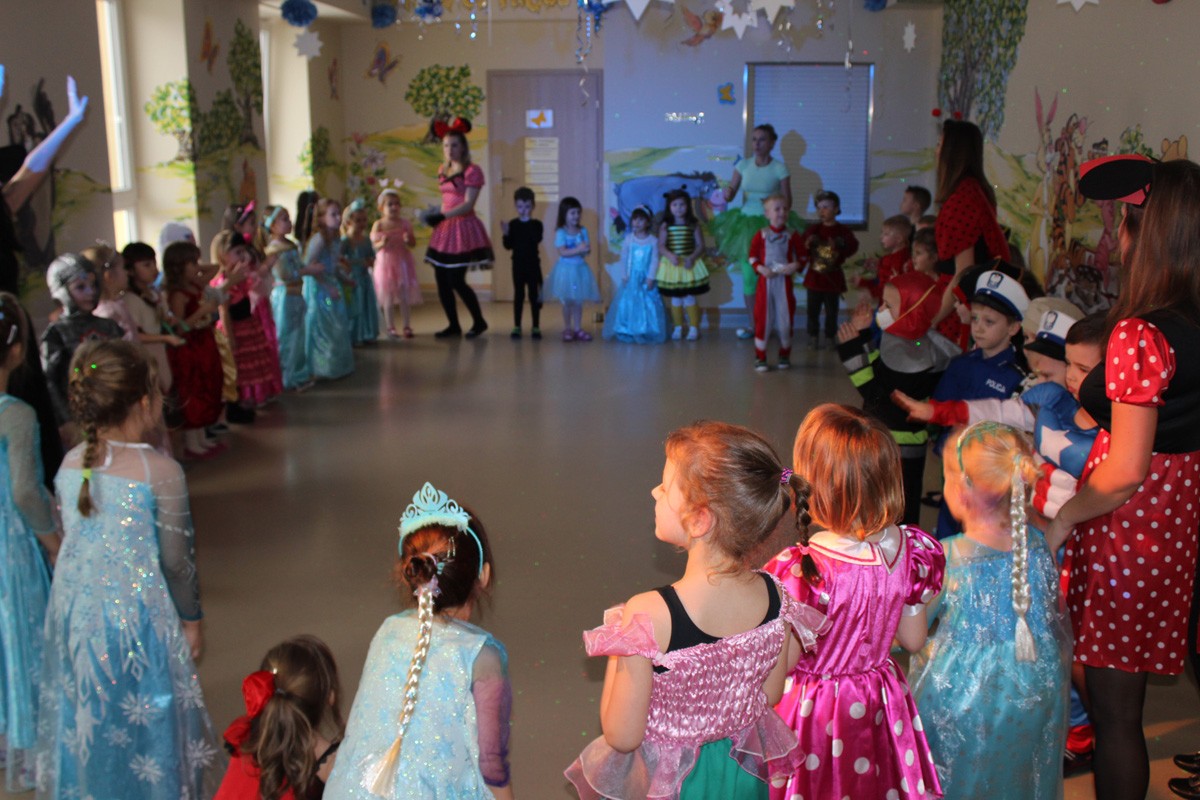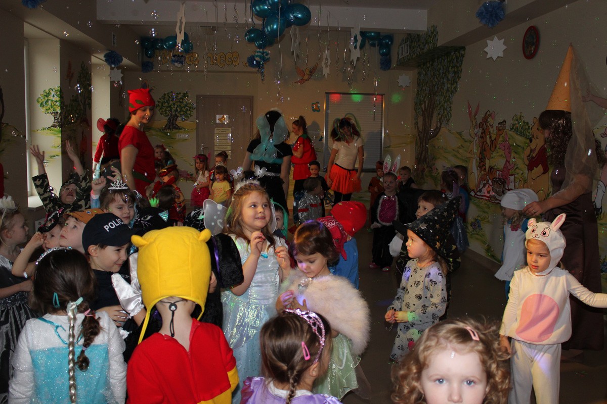 Tego dnia, po śniadaniu, dzieci z pomocą pań przebrały się w kolorowe stroje. Jak za dotknięciem czarodziejskiej różdżki, w salach zaroiło się od wróżek, biedronek, motyli, Elz, Batamnów, Spidermanów i innych postaci. W rytm skocznej melodii, wśród kolorowych baniek mydlanych, mali tańcerze wspaniale się bawili. Dzięki temu wydarzeniu, przedszkolaki miały okazję spędzić czas w atmosferze radości i choć na chwilę wcielić się w swoją ulubioną postać z bajki. Dodatkową atrakcją były prezenty od Kubusia Puchatka, które pojawiły się w naszych salach w kolorowych workach, wraz z listem od patrona naszego przedszkola.