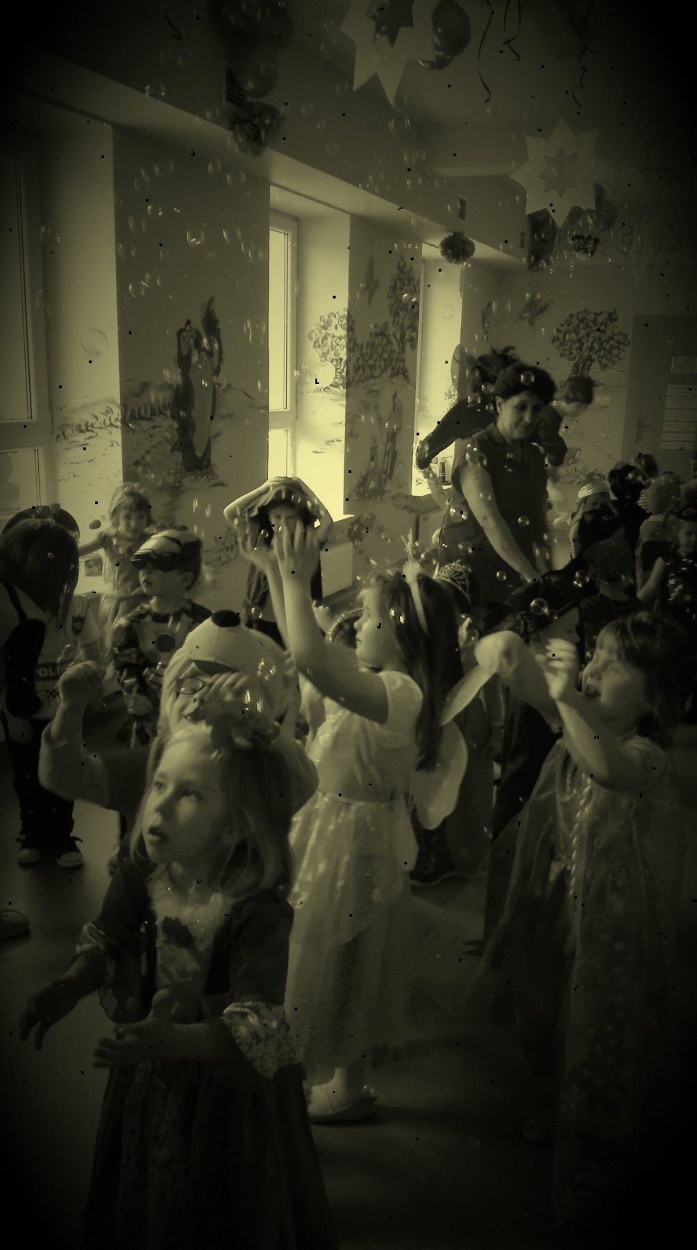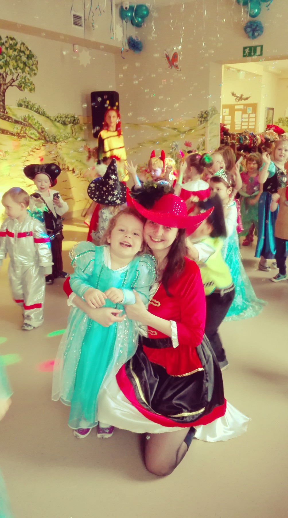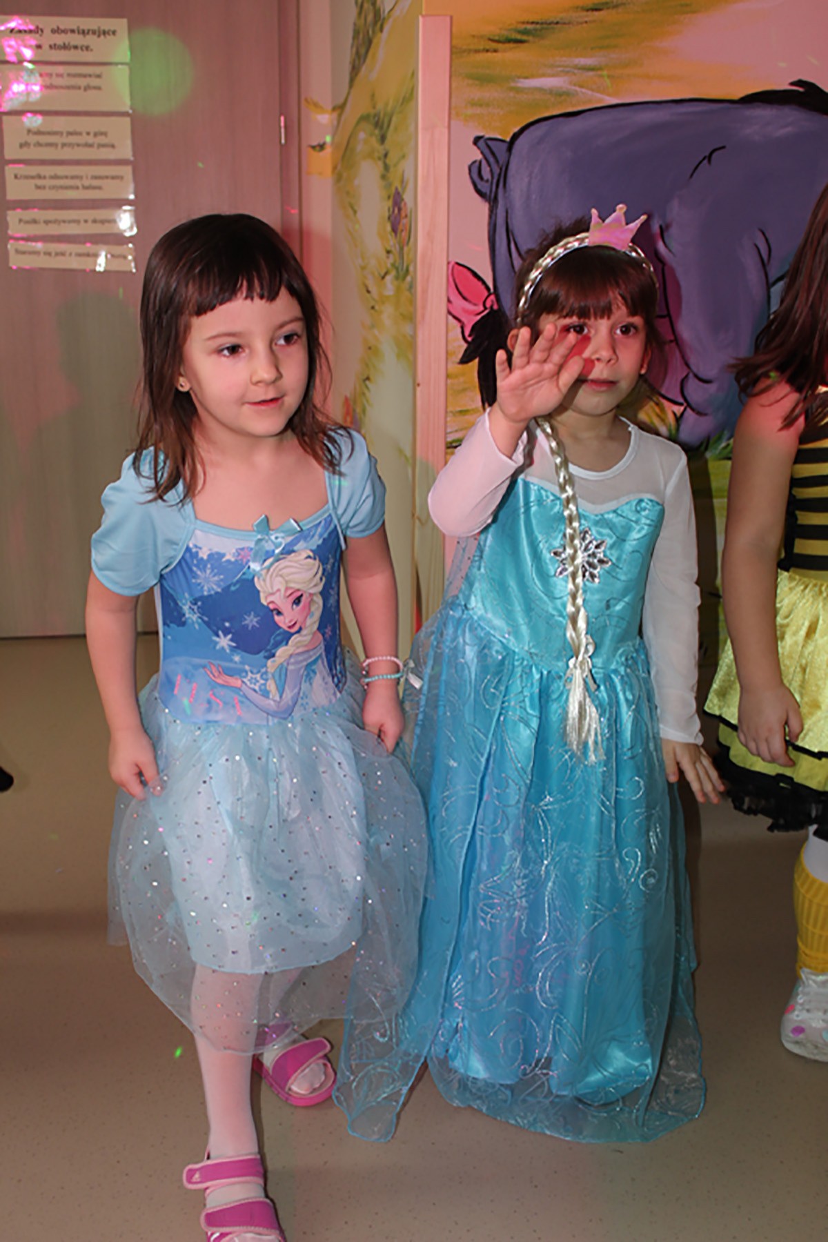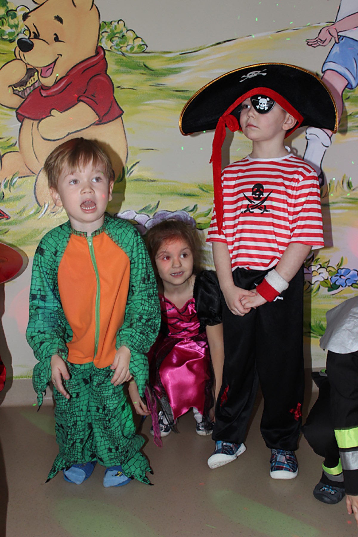 Tego dnia, po śniadaniu, dzieci z pomocą pań przebrały się w kolorowe stroje. Jak za dotknięciem czarodziejskiej różdżki, w salach zaroiło się od wróżek, biedronek, motyli, Elz, Batamnów, Spidermanów i innych postaci. W rytm skocznej melodii, wśród kolorowych baniek mydlanych, mali tańcerze wspaniale się bawili. Dzięki temu wydarzeniu, przedszkolaki miały okazję spędzić czas w atmosferze radości i choć na chwilę wcielić się w swoją ulubioną postać z bajki. Dodatkową atrakcją były prezenty od Kubusia Puchatka, które pojawiły się w naszych salach w kolorowych workach, wraz z listem od patrona naszego przedszkola.