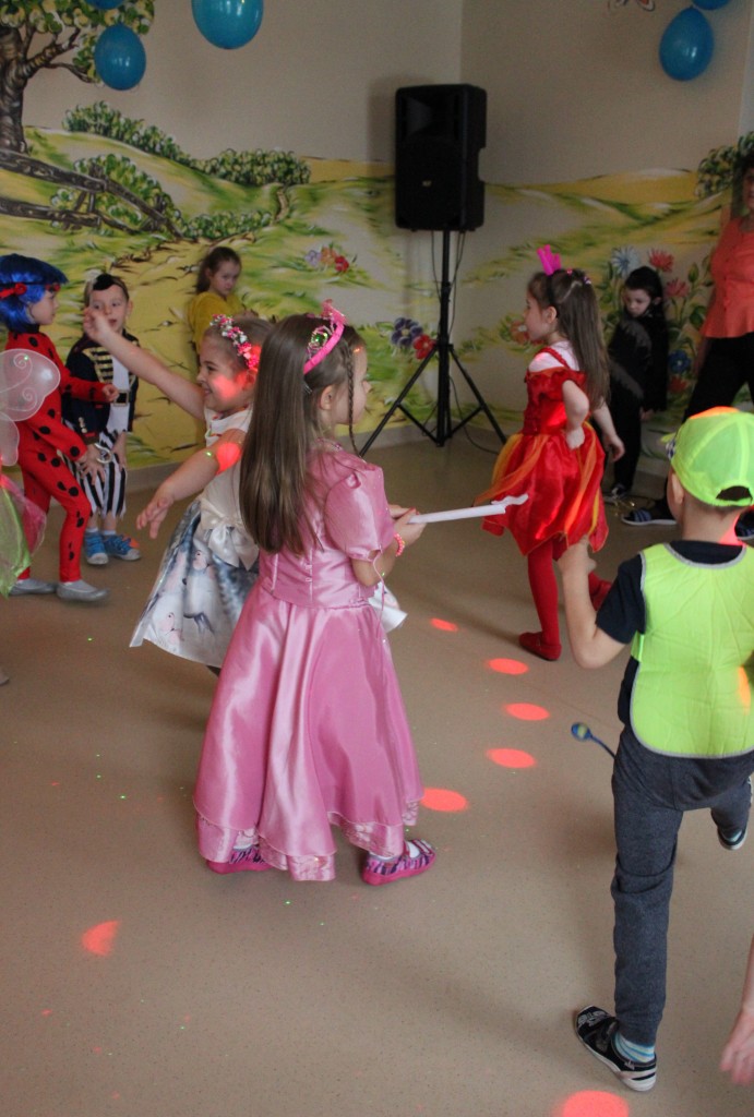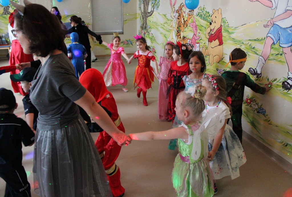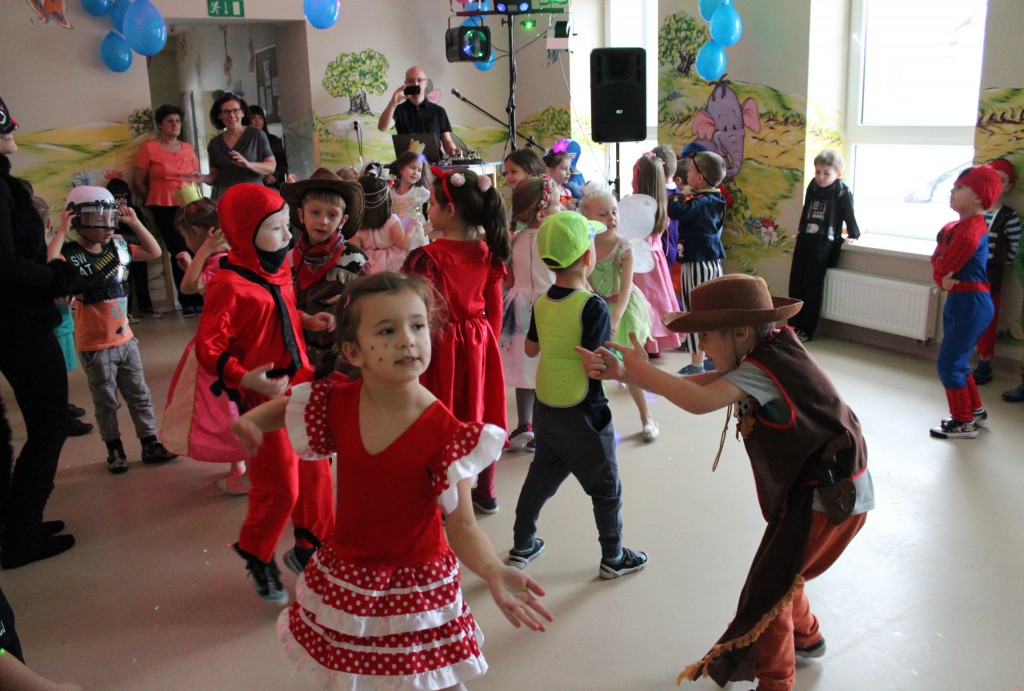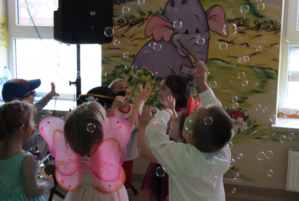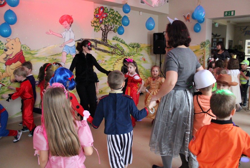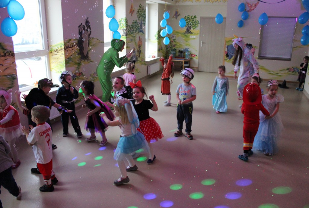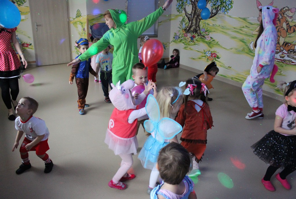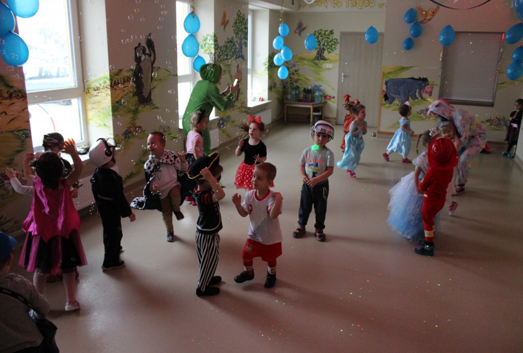 Pomysłowe przebrania sprawiły, że niektórzy byli nie do poznania. Na parkiecie ochoczo tańczyli bohaterowie bajek, komiksów, filmów a nawet smoki, dinozaury i przedstawiciele służb mundurowych. Był długi pociąg dookoła sali, kaczuszki i wiele innych zabaw integrujących wszystkie grupy. Największą atrakcją okazały się jednak bańki mydlane, których łapanie sprawiło dzieciom wiele radości. Takiego wesołego brykania nie powstydziłby się sam Tygrysek! Dobrą zabawę przedszkolaków zauważył i docenił również Kubuś Puchatek i zostawił każdemu małe co nieco oraz list z pozdrowieniami ze Stumilowego Lasu.