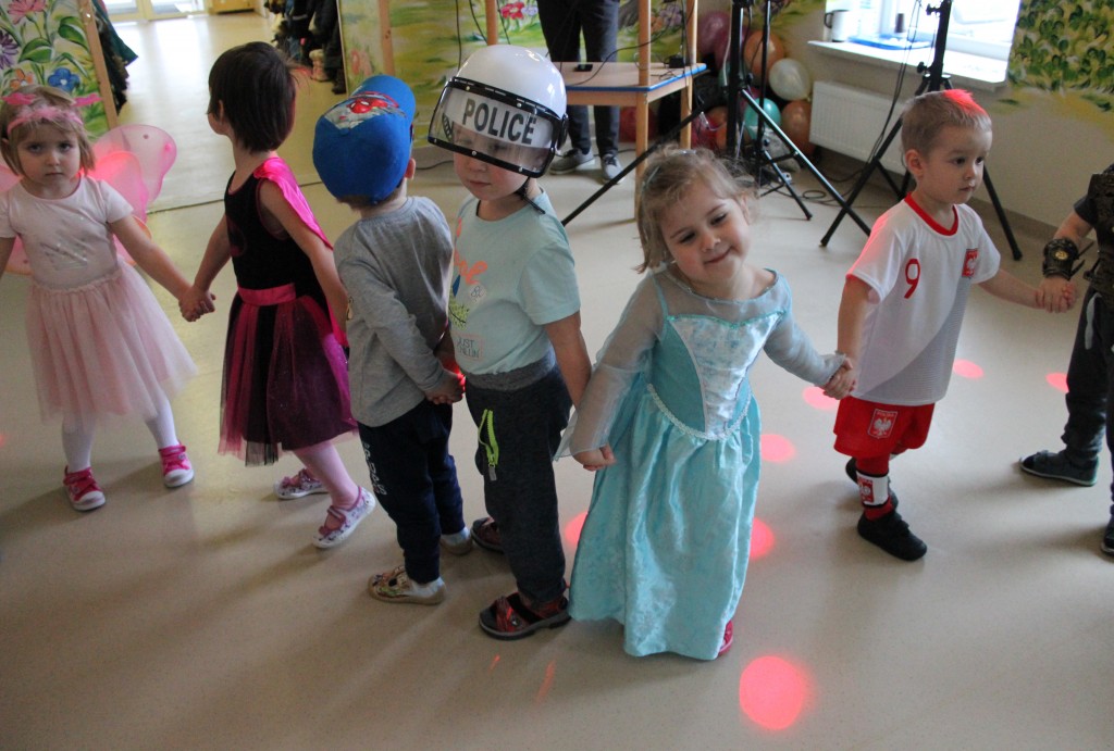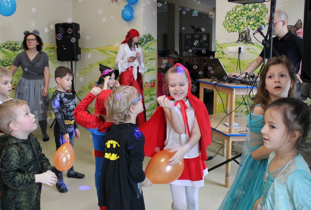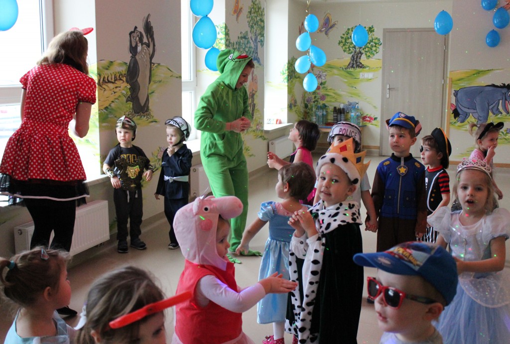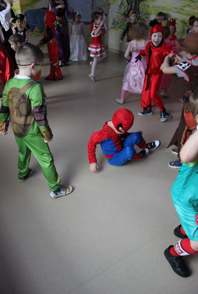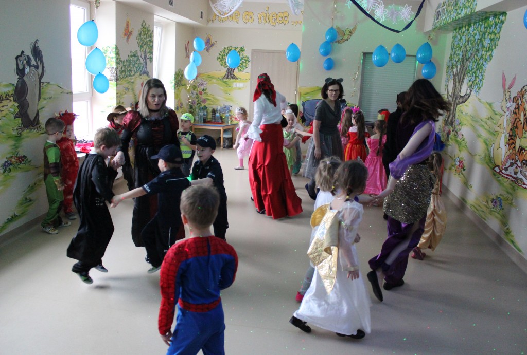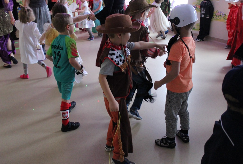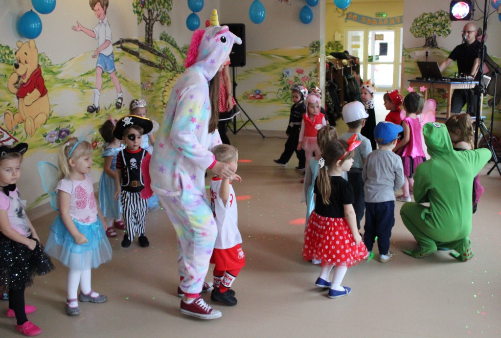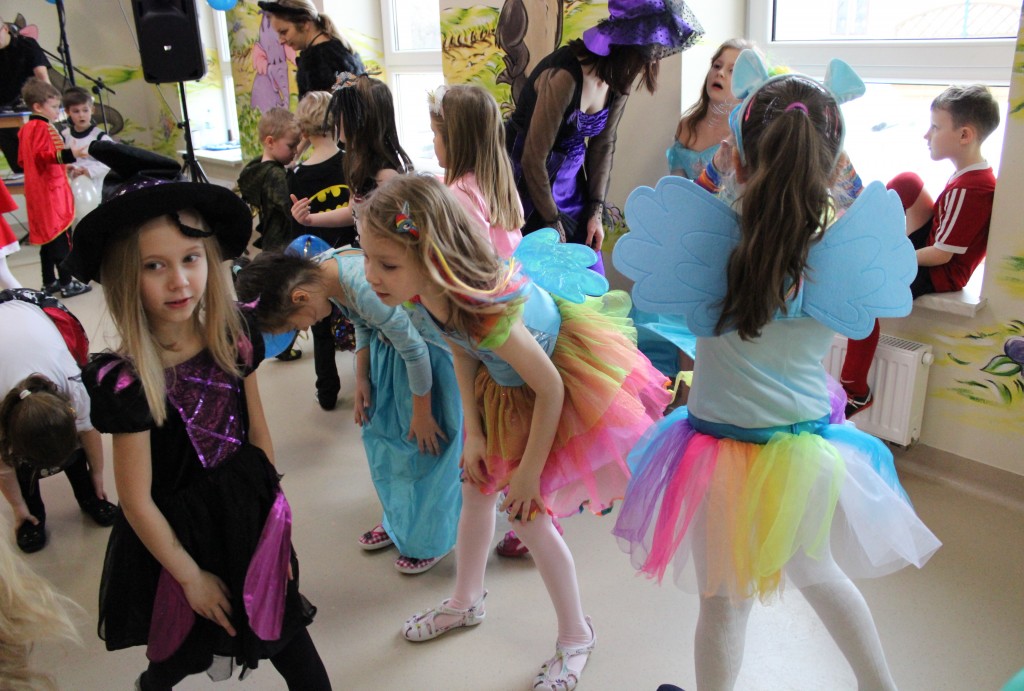 Pomysłowe przebrania sprawiły, że niektórzy byli nie do poznania. Na parkiecie ochoczo tańczyli bohaterowie bajek, komiksów, filmów a nawet smoki, dinozaury i przedstawiciele służb mundurowych. Był długi pociąg dookoła sali, kaczuszki i wiele innych zabaw integrujących wszystkie grupy. Największą atrakcją okazały się jednak bańki mydlane, których łapanie sprawiło dzieciom wiele radości. Takiego wesołego brykania nie powstydziłby się sam Tygrysek! Dobrą zabawę przedszkolaków zauważył i docenił również Kubuś Puchatek i zostawił każdemu małe co nieco oraz list z pozdrowieniami ze Stumilowego Lasu.
