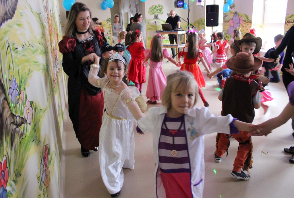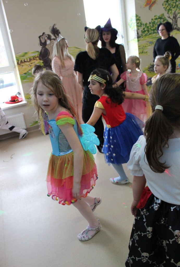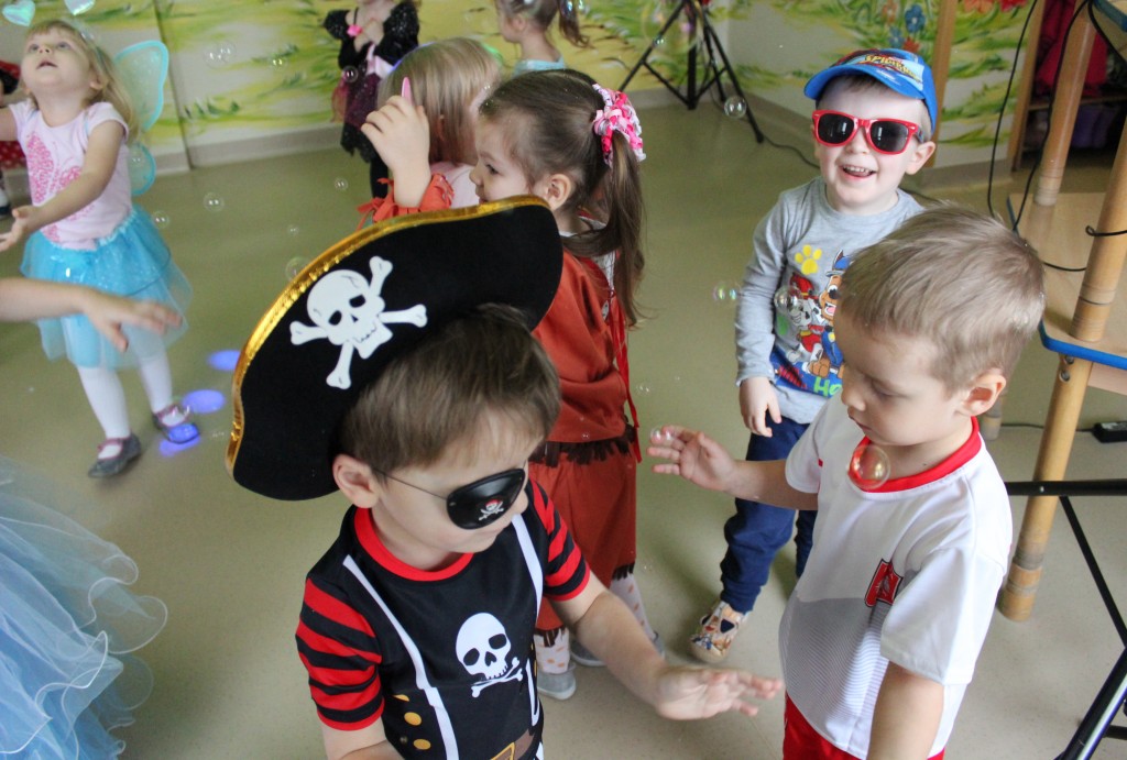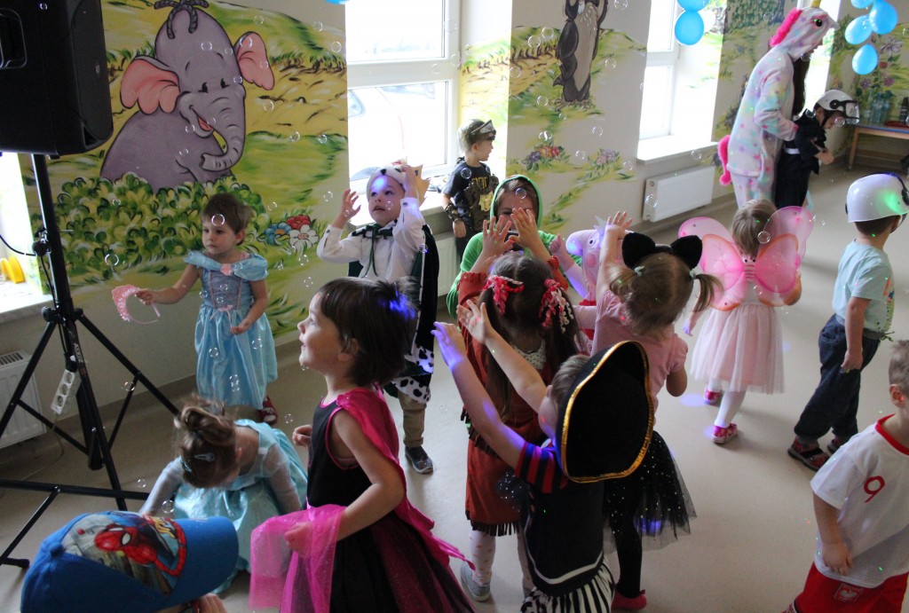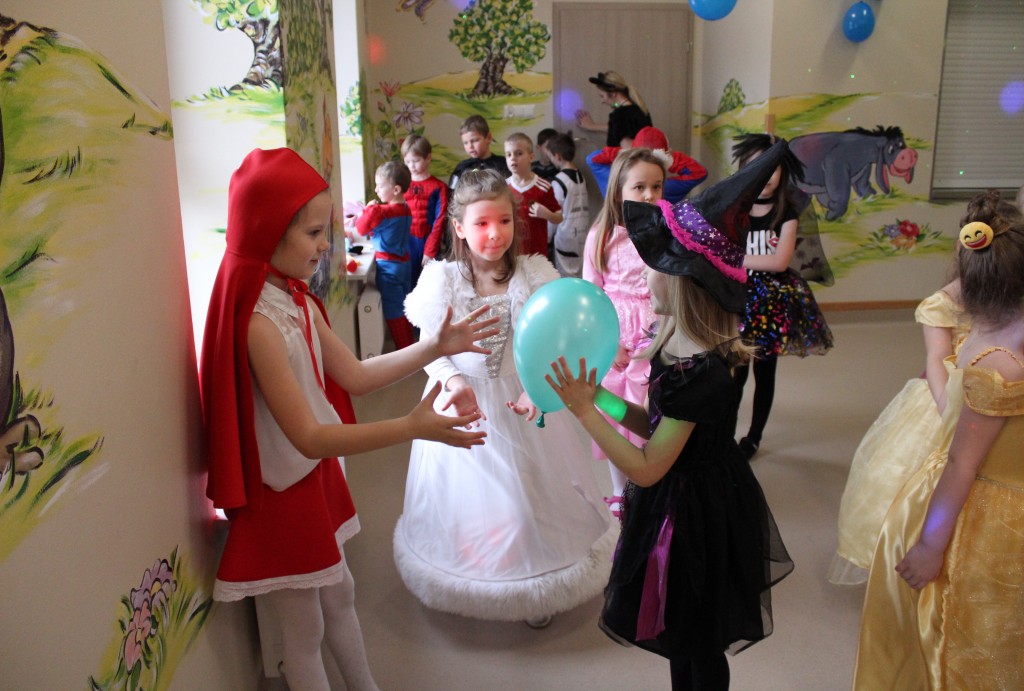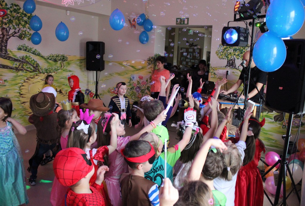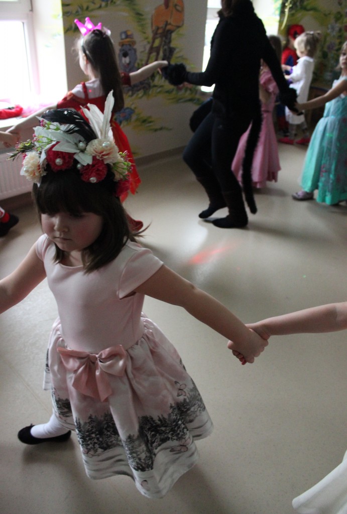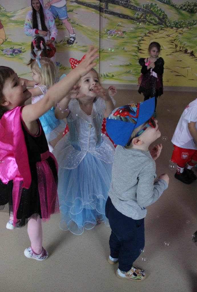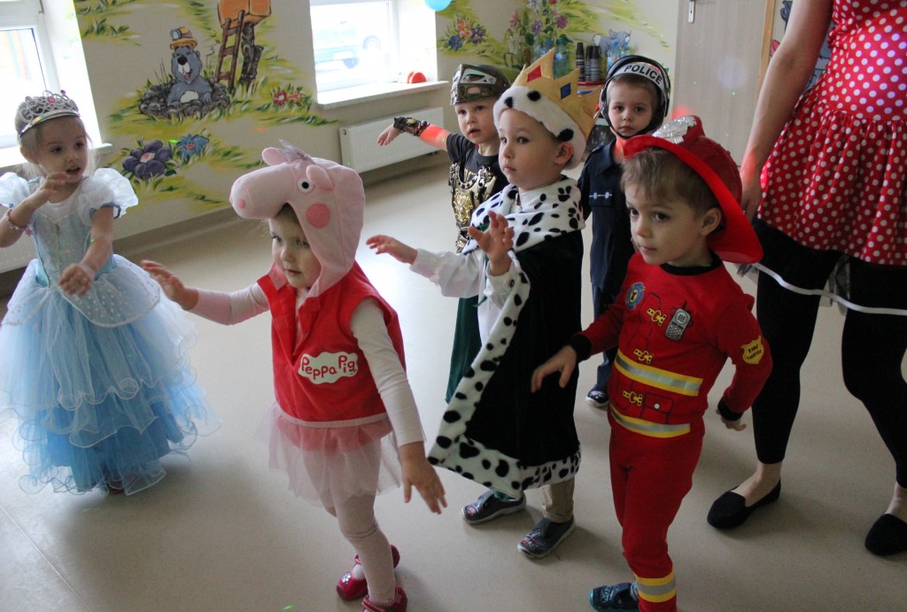 Pomysłowe przebrania sprawiły, że niektórzy byli nie do poznania. Na parkiecie ochoczo tańczyli bohaterowie bajek, komiksów, filmów a nawet smoki, dinozaury i przedstawiciele służb mundurowych. Był długi pociąg dookoła sali, kaczuszki i wiele innych zabaw integrujących wszystkie grupy. Największą atrakcją okazały się jednak bańki mydlane, których łapanie sprawiło dzieciom wiele radości. Takiego wesołego brykania nie powstydziłby się sam Tygrysek! Dobrą zabawę przedszkolaków zauważył i docenił również Kubuś Puchatek i zostawił każdemu małe co nieco oraz list z pozdrowieniami ze Stumilowego Lasu.