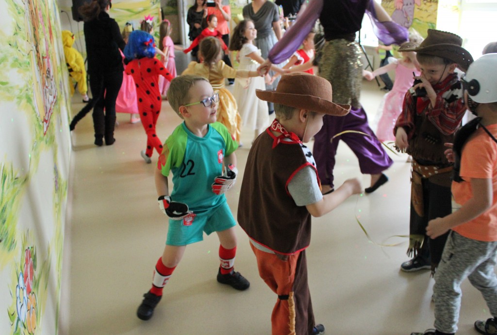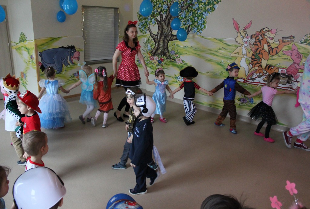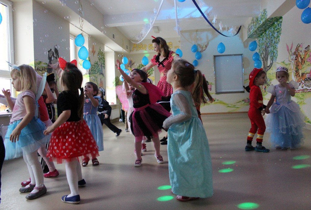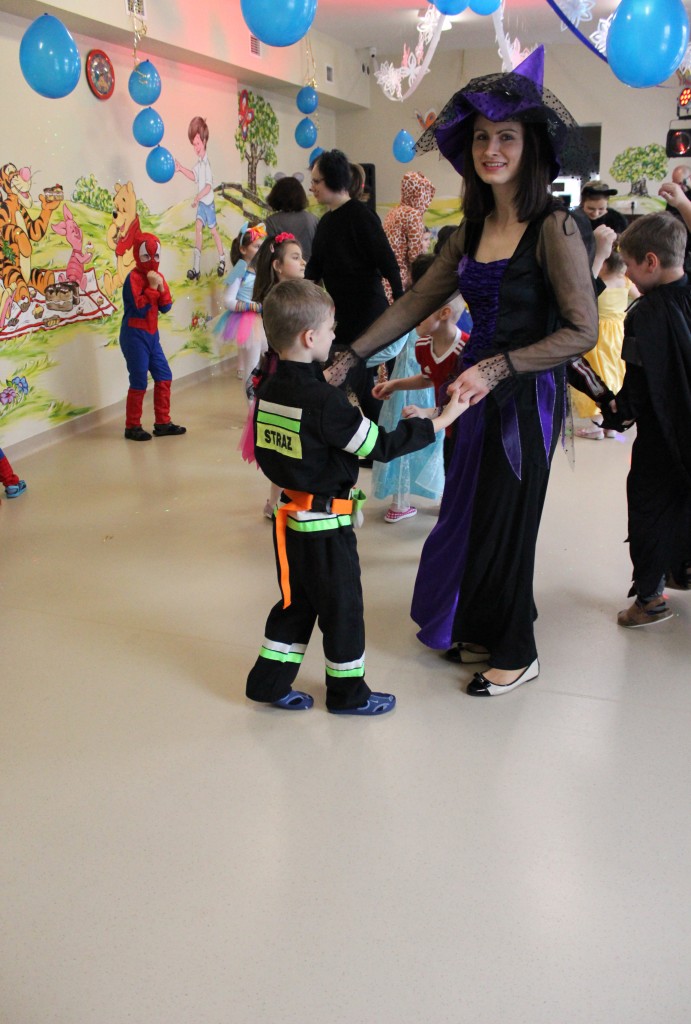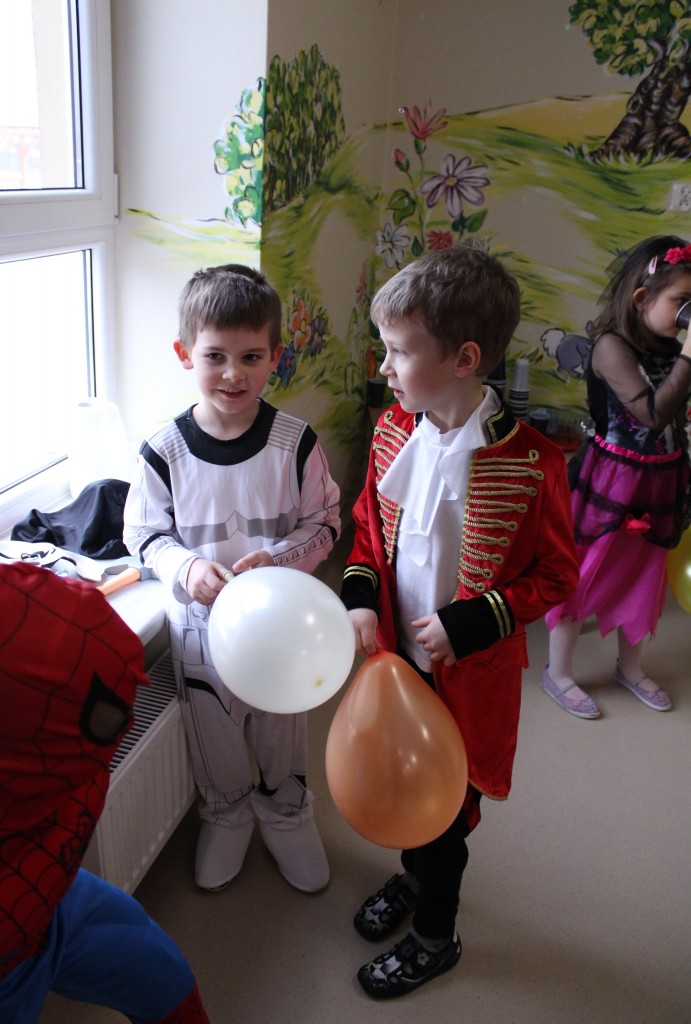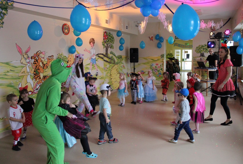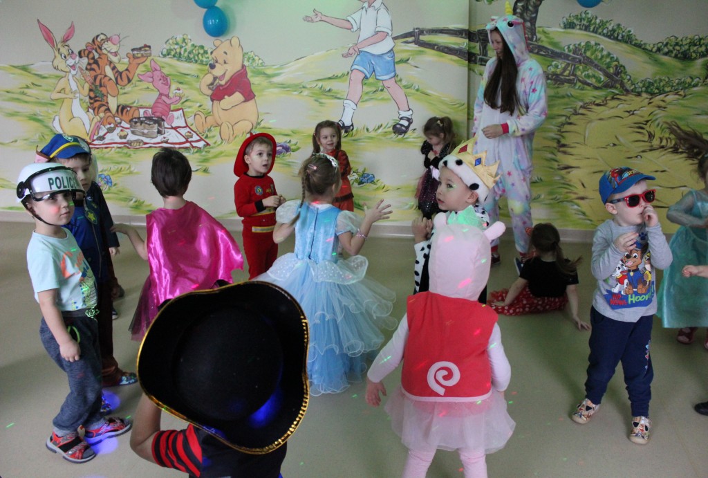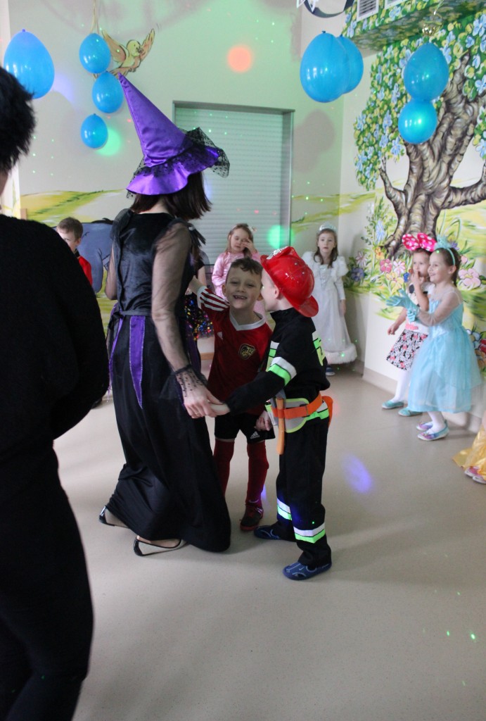 Pomysłowe przebrania sprawiły, że niektórzy byli nie do poznania. Na parkiecie ochoczo tańczyli bohaterowie bajek, komiksów, filmów a nawet smoki, dinozaury i przedstawiciele służb mundurowych. Był długi pociąg dookoła sali, kaczuszki i wiele innych zabaw integrujących wszystkie grupy. Największą atrakcją okazały się jednak bańki mydlane, których łapanie sprawiło dzieciom wiele radości. Takiego wesołego brykania nie powstydziłby się sam Tygrysek! Dobrą zabawę przedszkolaków zauważył i docenił również Kubuś Puchatek i zostawił każdemu małe co nieco oraz list z pozdrowieniami ze Stumilowego Lasu.