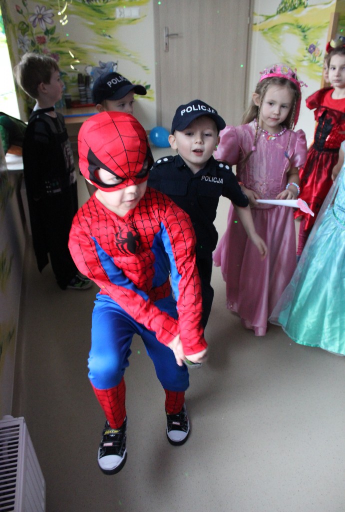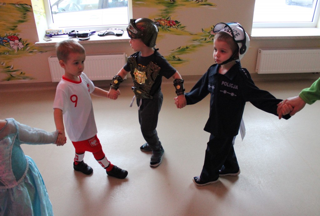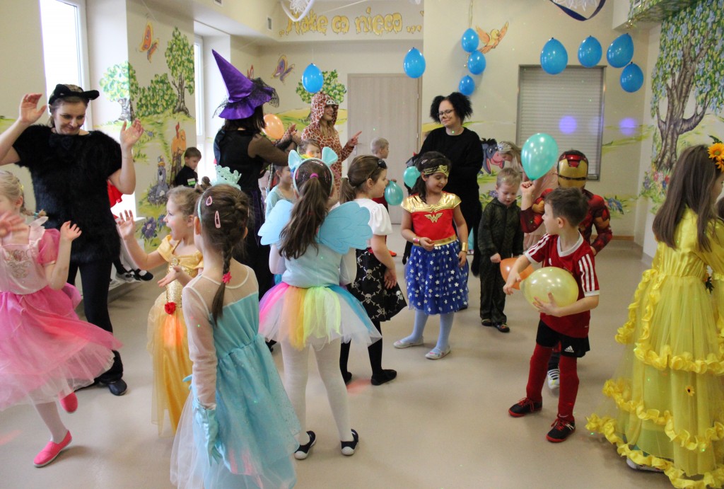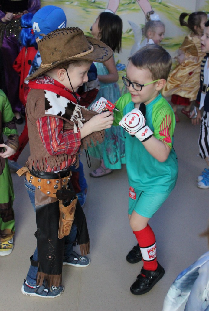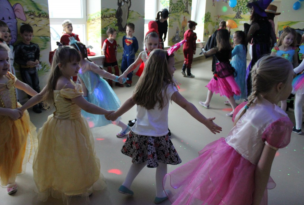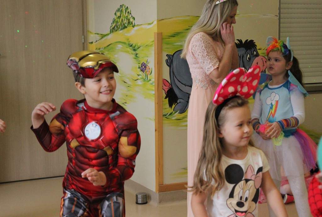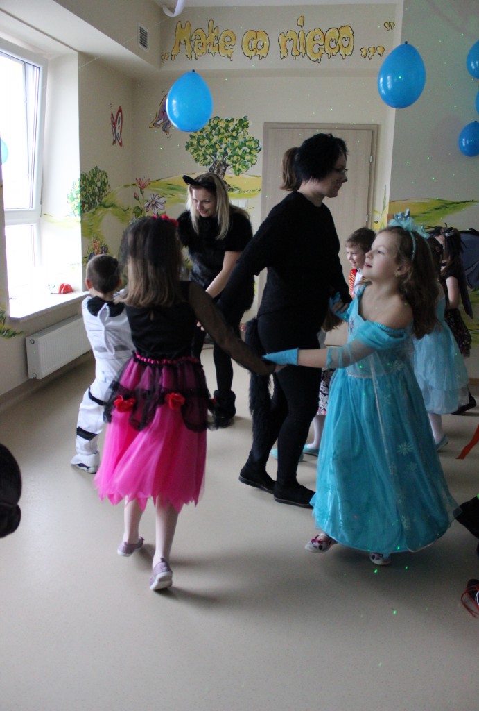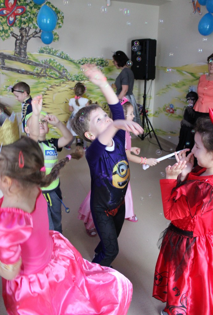 Pomysłowe przebrania sprawiły, że niektórzy byli nie do poznania. Na parkiecie ochoczo tańczyli bohaterowie bajek, komiksów, filmów a nawet smoki, dinozaury i przedstawiciele służb mundurowych. Był długi pociąg dookoła sali, kaczuszki i wiele innych zabaw integrujących wszystkie grupy. Największą atrakcją okazały się jednak bańki mydlane, których łapanie sprawiło dzieciom wiele radości. Takiego wesołego brykania nie powstydziłby się sam Tygrysek! Dobrą zabawę przedszkolaków zauważył i docenił również Kubuś Puchatek i zostawił każdemu małe co nieco oraz list z pozdrowieniami ze Stumilowego Lasu.