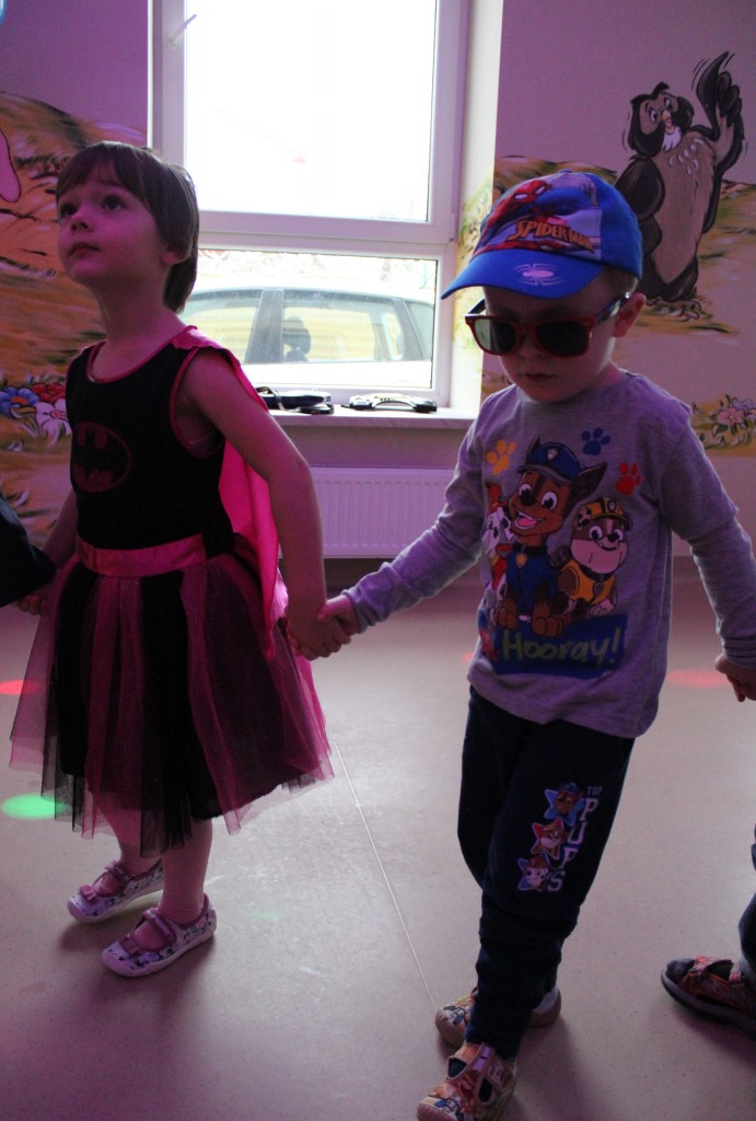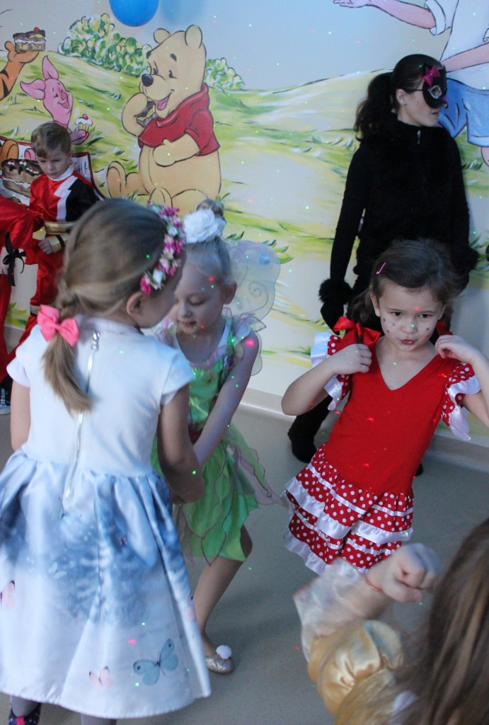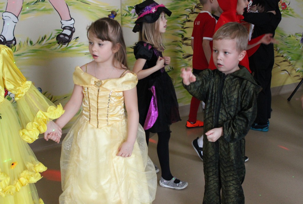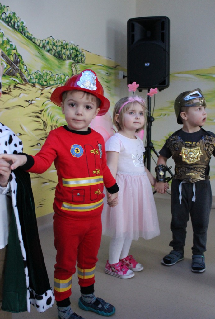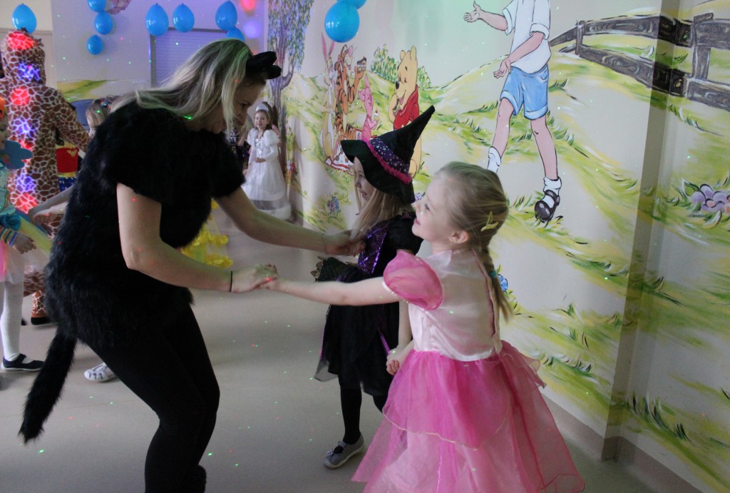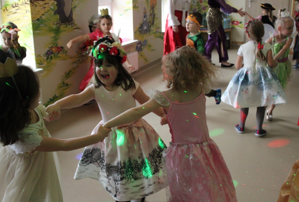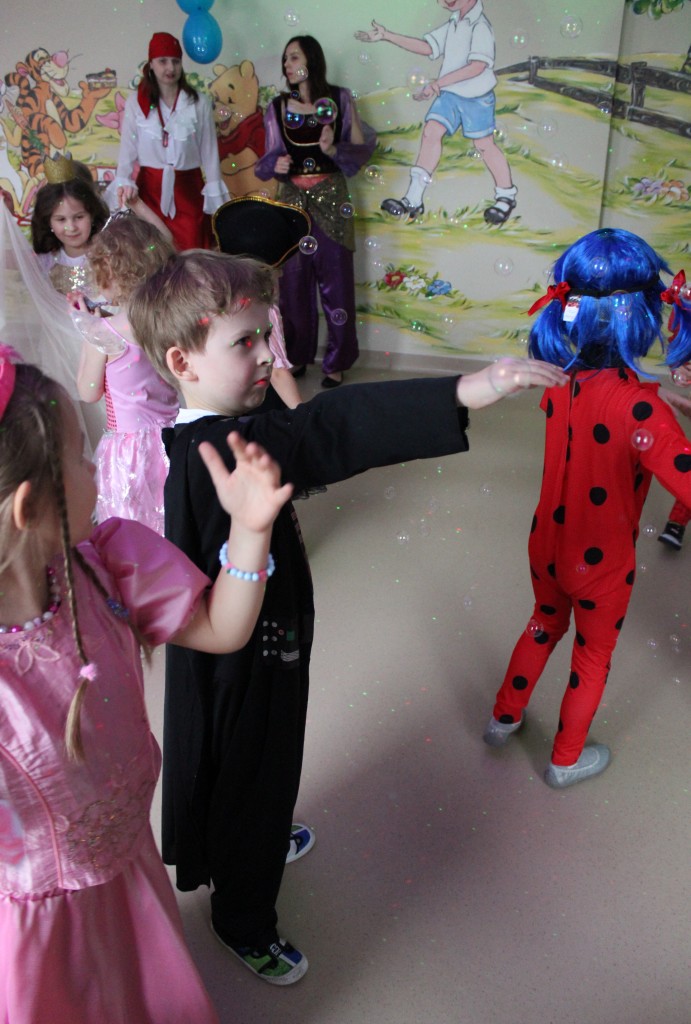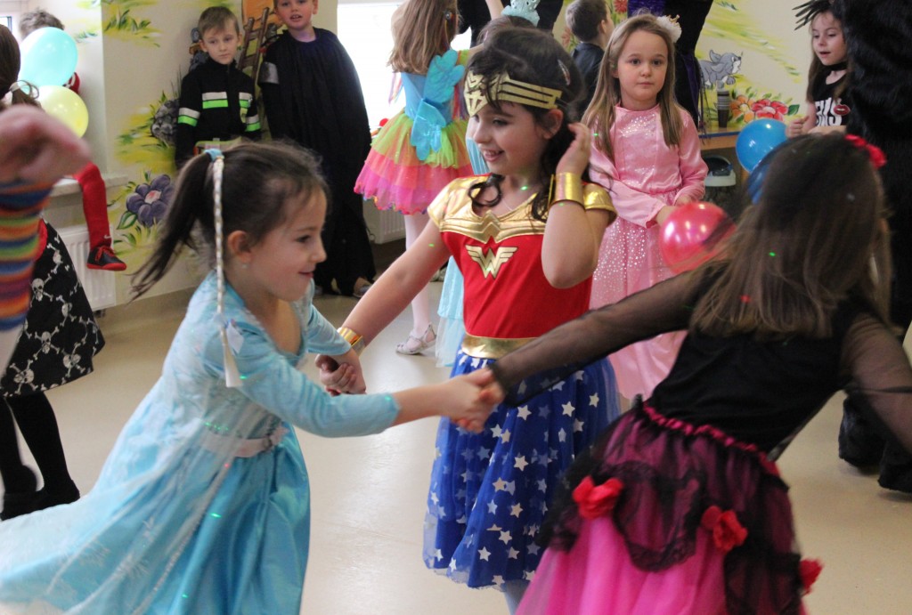 Pomysłowe przebrania sprawiły, że niektórzy byli nie do poznania. Na parkiecie ochoczo tańczyli bohaterowie bajek, komiksów, filmów a nawet smoki, dinozaury i przedstawiciele służb mundurowych. Był długi pociąg dookoła sali, kaczuszki i wiele innych zabaw integrujących wszystkie grupy. Największą atrakcją okazały się jednak bańki mydlane, których łapanie sprawiło dzieciom wiele radości. Takiego wesołego brykania nie powstydziłby się sam Tygrysek! Dobrą zabawę przedszkolaków zauważył i docenił również Kubuś Puchatek i zostawił każdemu małe co nieco oraz list z pozdrowieniami ze Stumilowego Lasu.