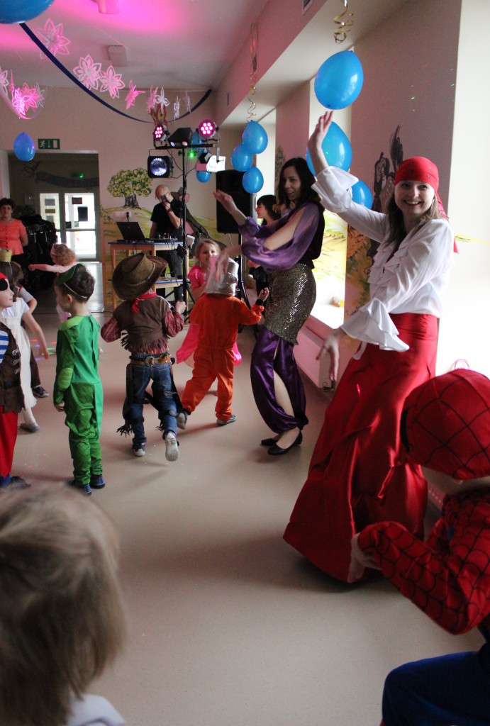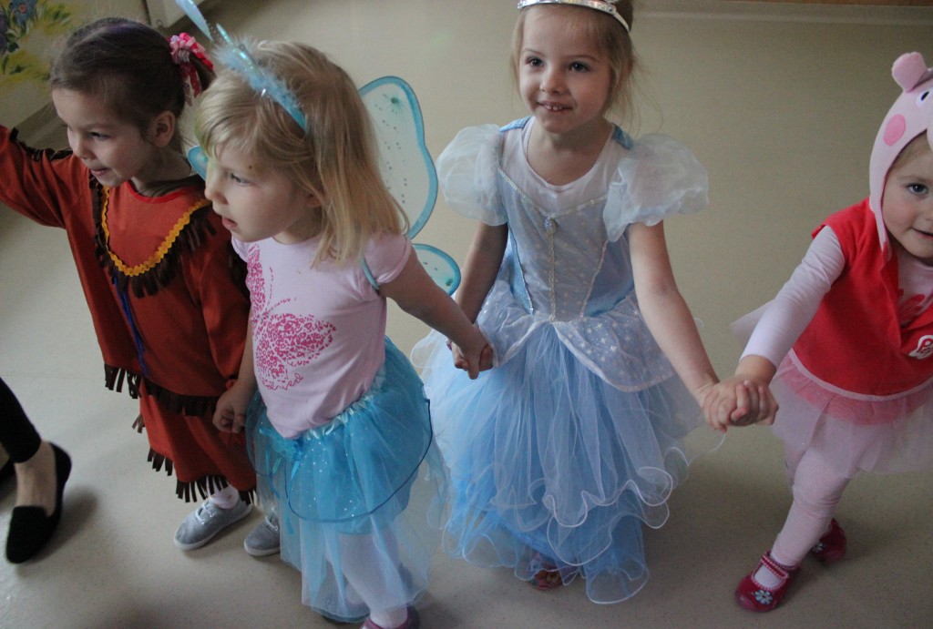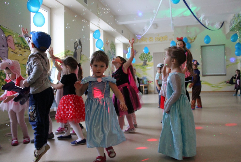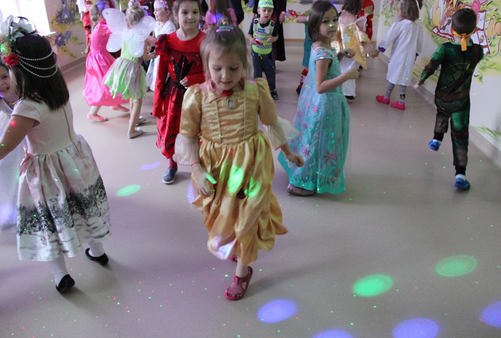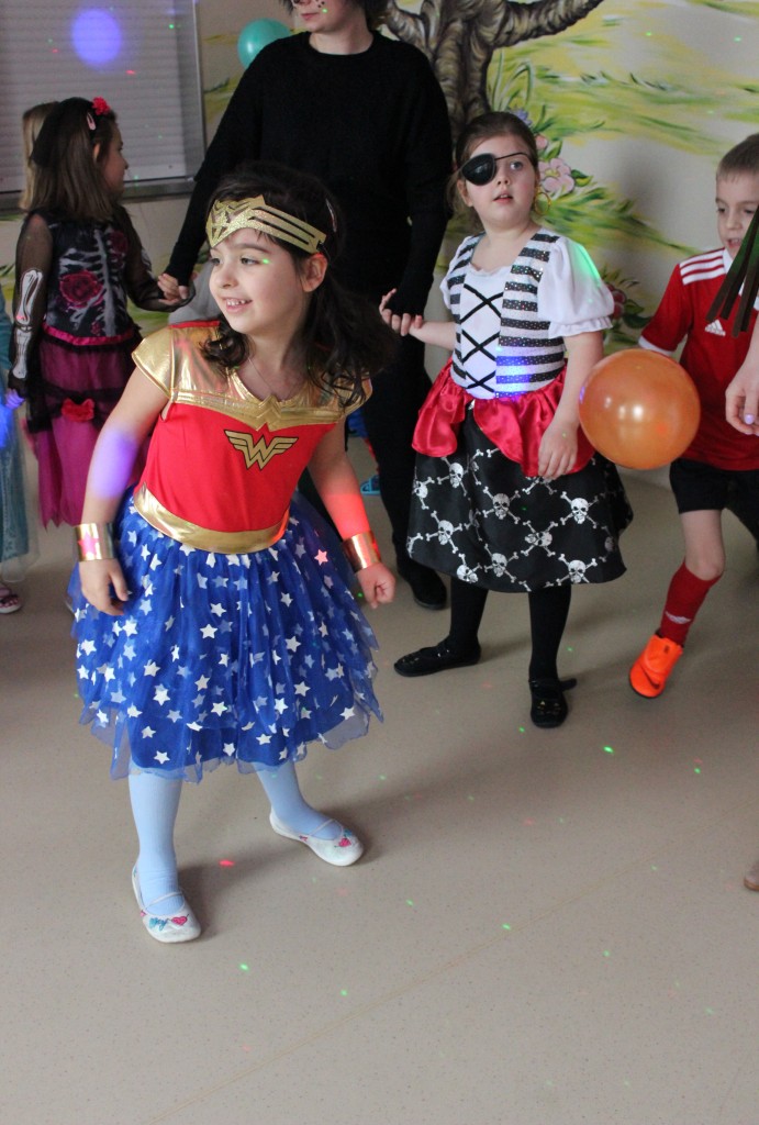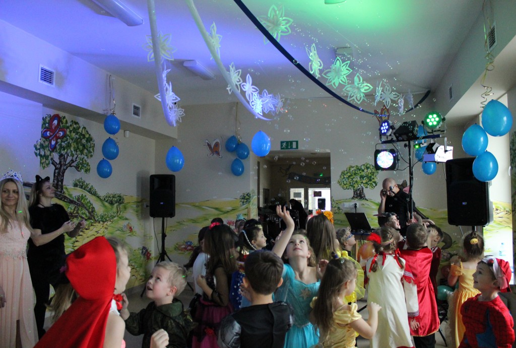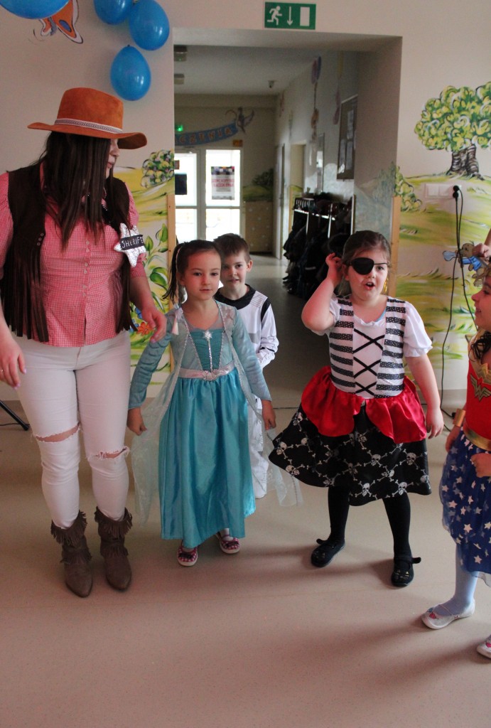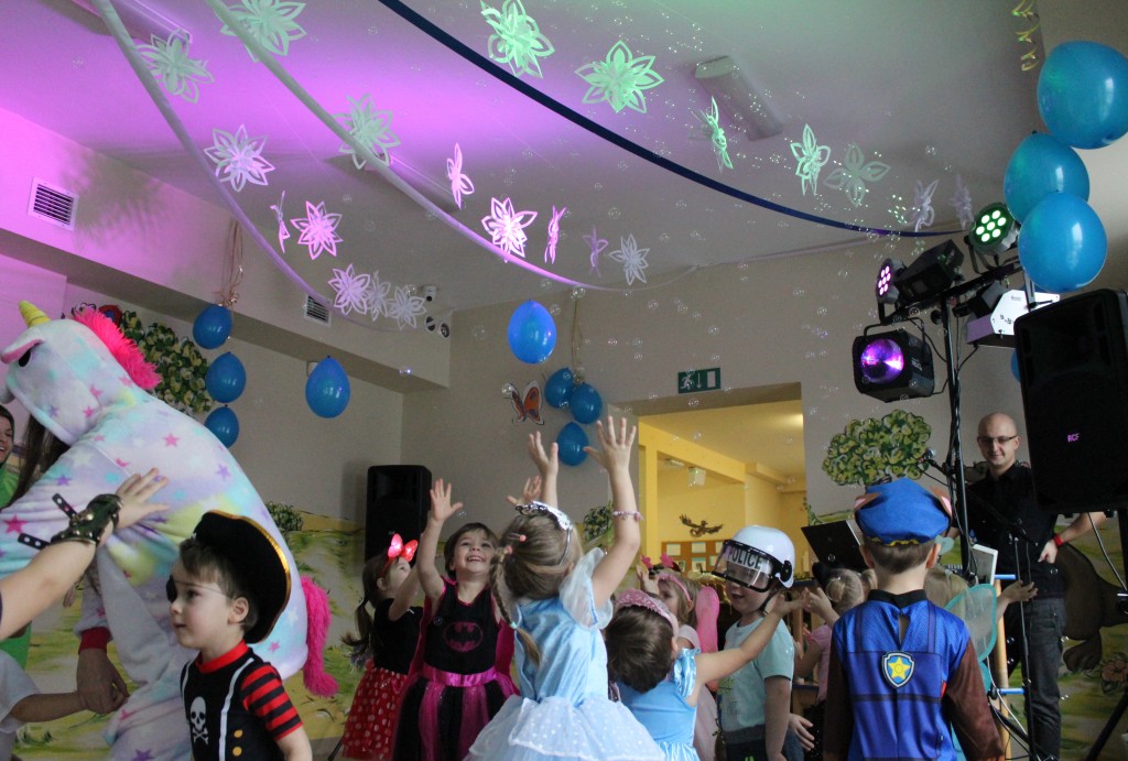 Pomysłowe przebrania sprawiły, że niektórzy byli nie do poznania. Na parkiecie ochoczo tańczyli bohaterowie bajek, komiksów, filmów a nawet smoki, dinozaury i przedstawiciele służb mundurowych. Był długi pociąg dookoła sali, kaczuszki i wiele innych zabaw integrujących wszystkie grupy. Największą atrakcją okazały się jednak bańki mydlane, których łapanie sprawiło dzieciom wiele radości. Takiego wesołego brykania nie powstydziłby się sam Tygrysek! Dobrą zabawę przedszkolaków zauważył i docenił również Kubuś Puchatek i zostawił każdemu małe co nieco oraz list z pozdrowieniami ze Stumilowego Lasu.
