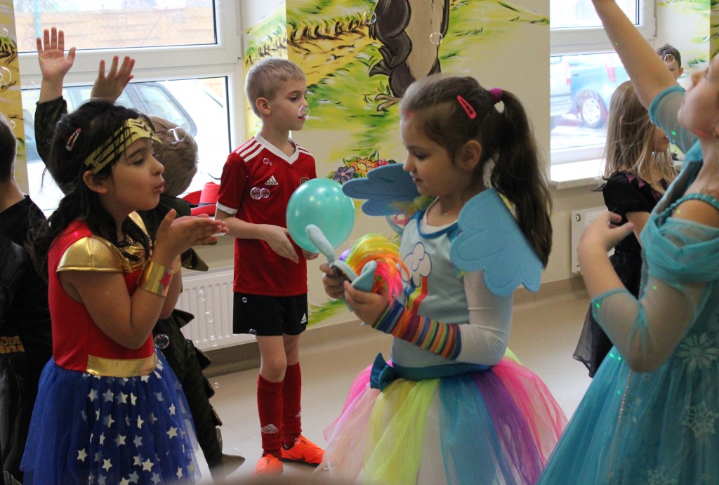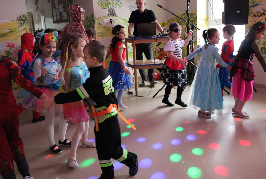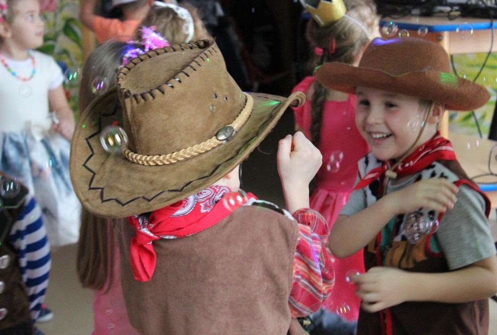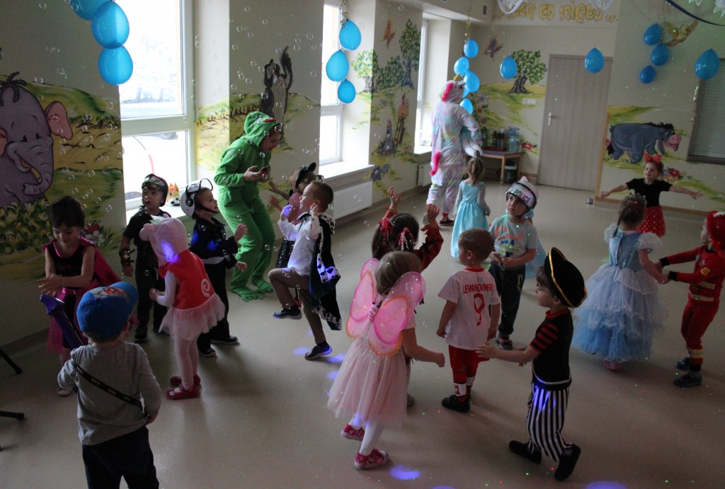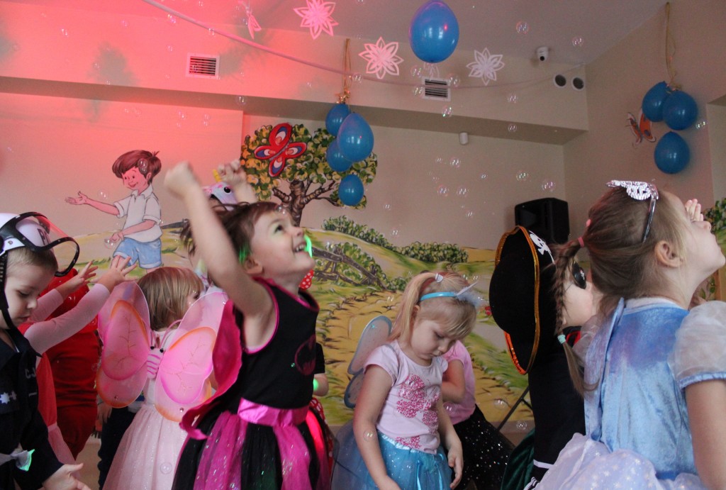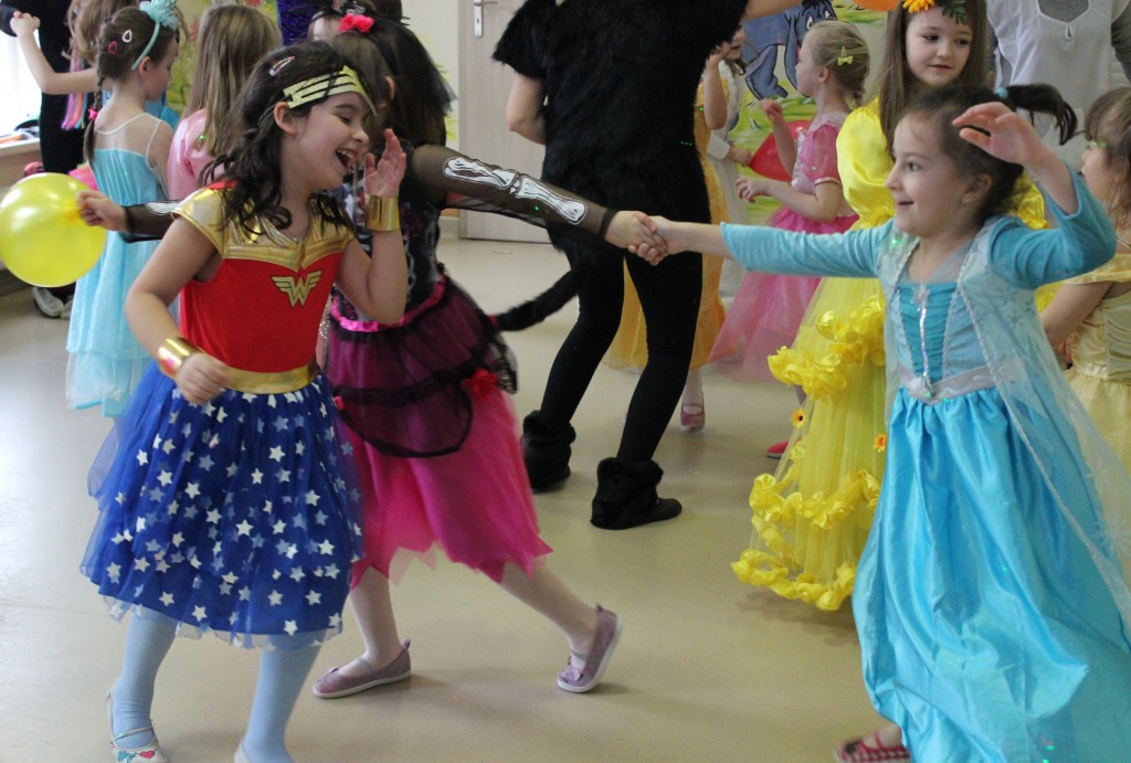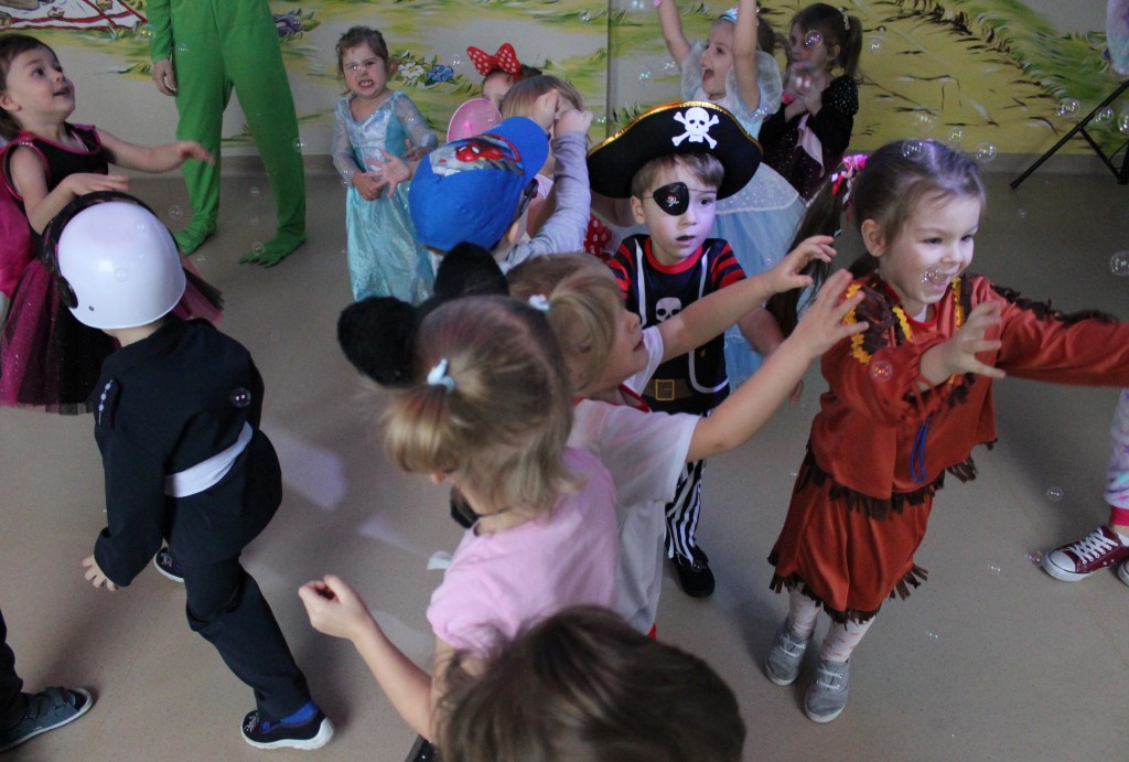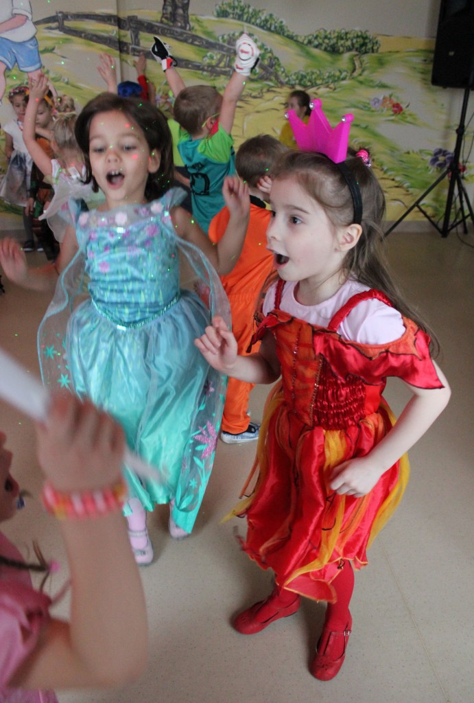 Pomysłowe przebrania sprawiły, że niektórzy byli nie do poznania. Na parkiecie ochoczo tańczyli bohaterowie bajek, komiksów, filmów a nawet smoki, dinozaury i przedstawiciele służb mundurowych. Był długi pociąg dookoła sali, kaczuszki i wiele innych zabaw integrujących wszystkie grupy. Największą atrakcją okazały się jednak bańki mydlane, których łapanie sprawiło dzieciom wiele radości. Takiego wesołego brykania nie powstydziłby się sam Tygrysek! Dobrą zabawę przedszkolaków zauważył i docenił również Kubuś Puchatek i zostawił każdemu małe co nieco oraz list z pozdrowieniami ze Stumilowego Lasu.