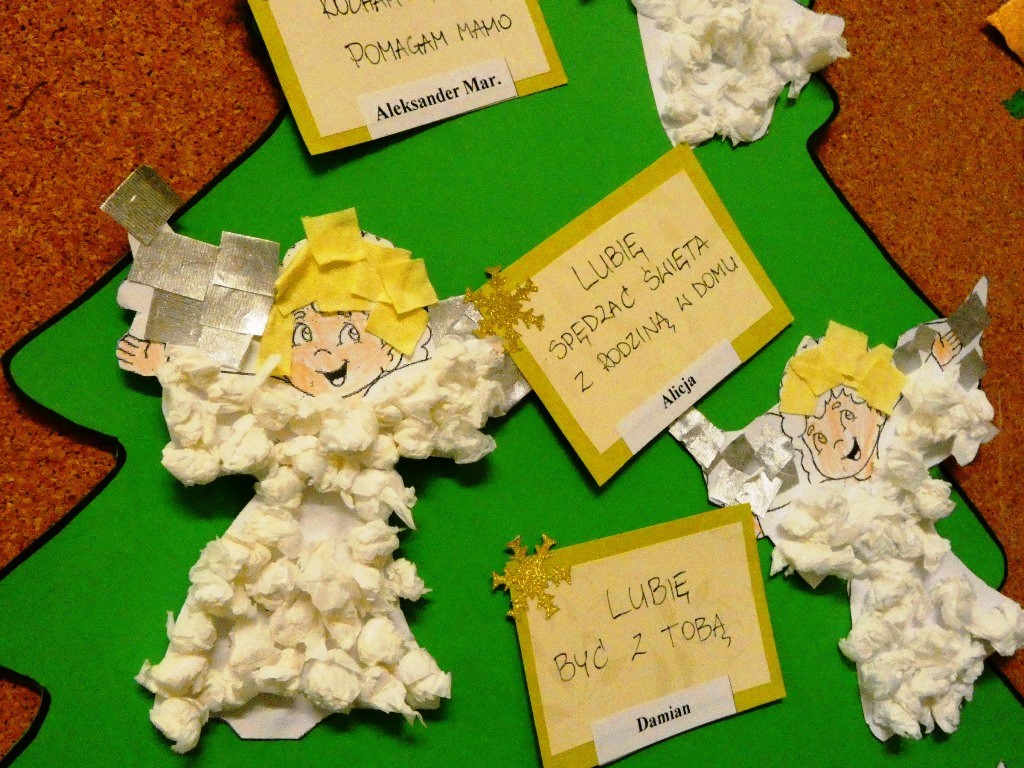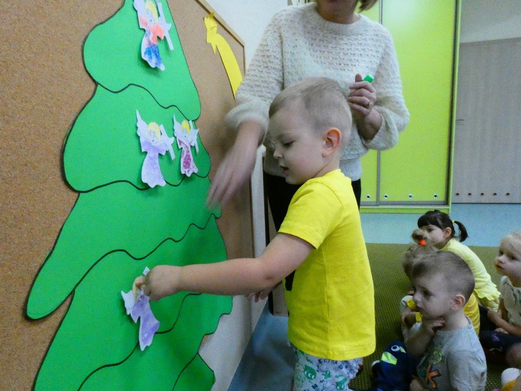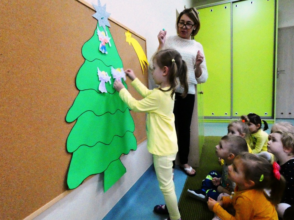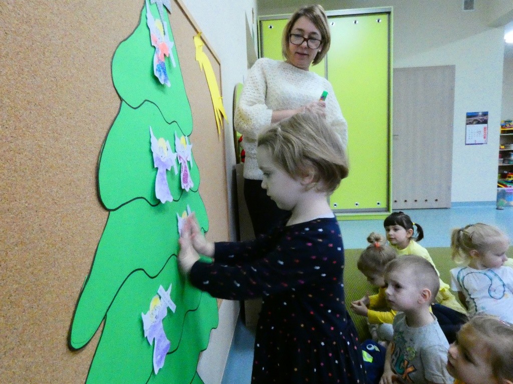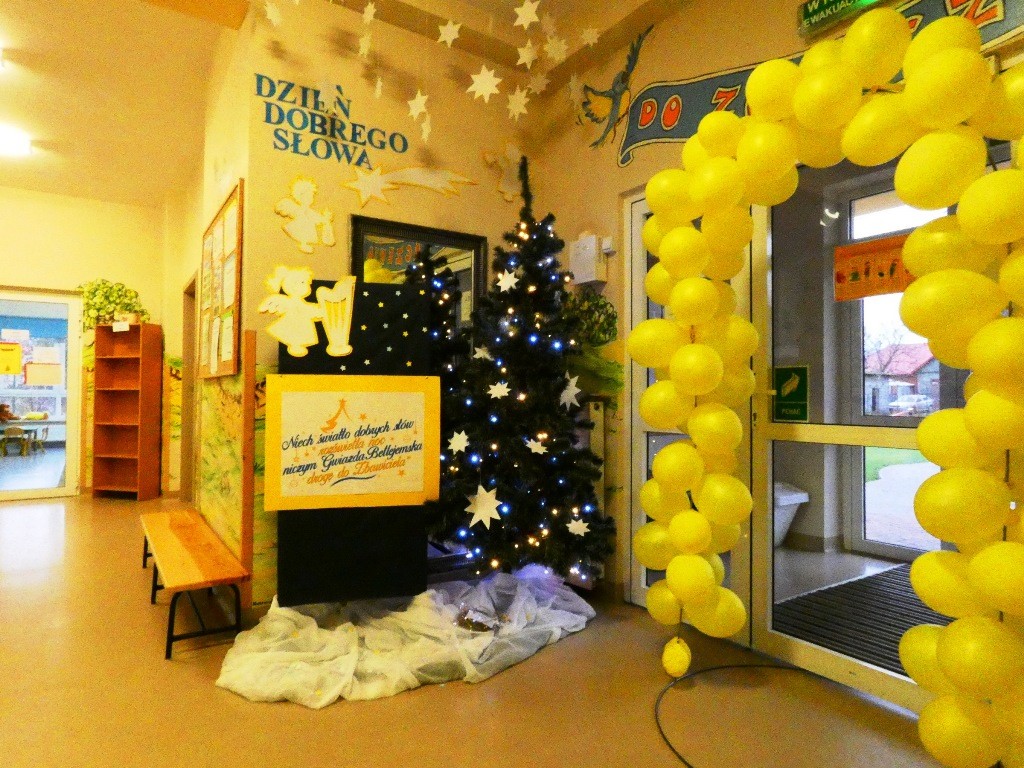 Efektem działań podejmowanych tego dnia w przedszkolu stały się Aniołki z dobrymi słowami, przepełnionymi serdecznością, życzliwością, dobrem i miłością względem najbliższych osób, które zestawiliśmy na grupowych choinkach we wszystkich grupach wiekowych.
