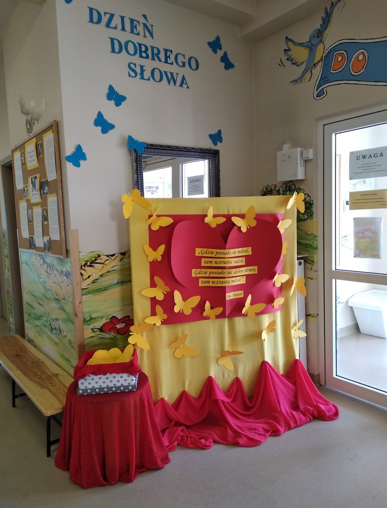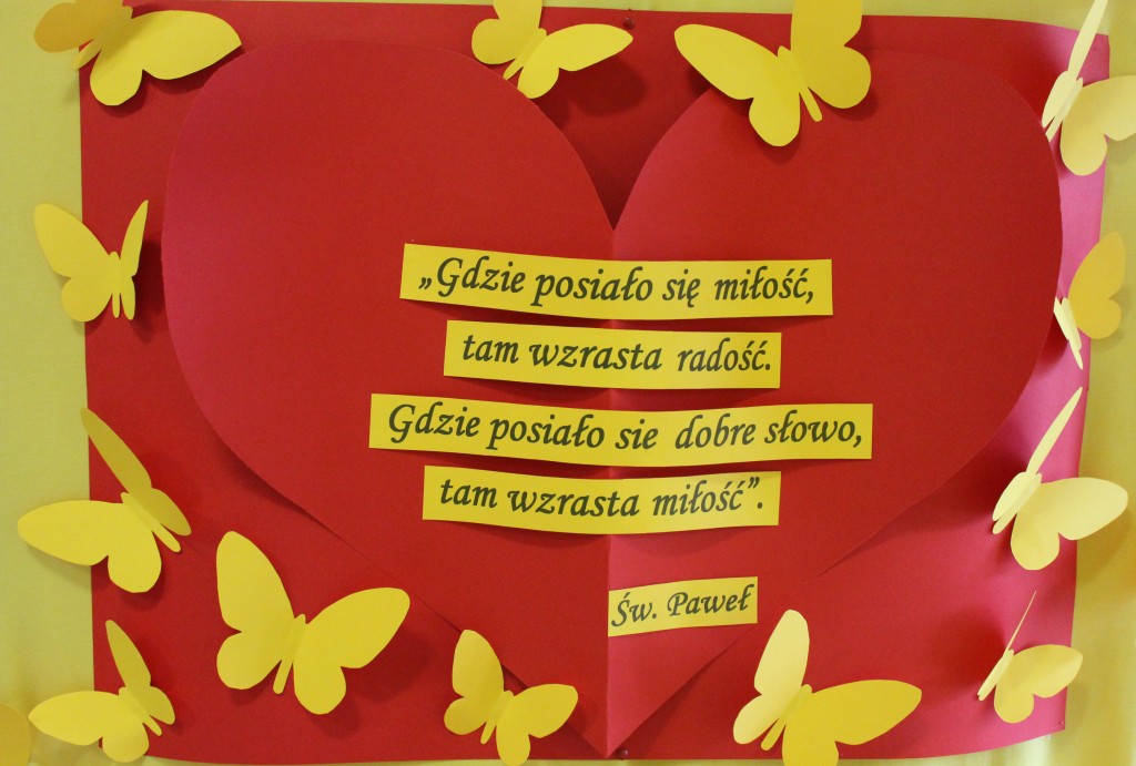 Tym razem hasłem przewodnim były słowa św. Pawła „Gdzie posiało się miłość, tam wzrasta radość.”…a gdzie posiało się dobre słowo, tam wzrasta miłość. Dzieci z tej okazji wykonały rodzicom laurki, zaś dobre słowa przygotowane wspólnie z najbliższymi na żółtych serduszkach, wypełniły 14 lutego naszą walentynkową pocztę. Każdy wychodząc z przedszkola mógł wylosować serduszko ze słowem pełnym życzliwości.