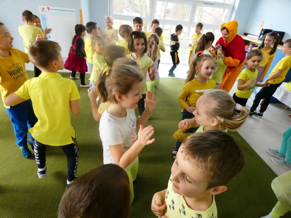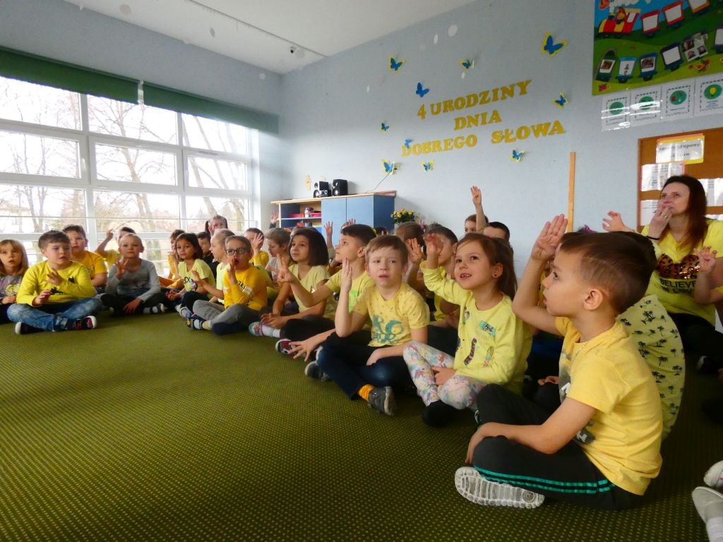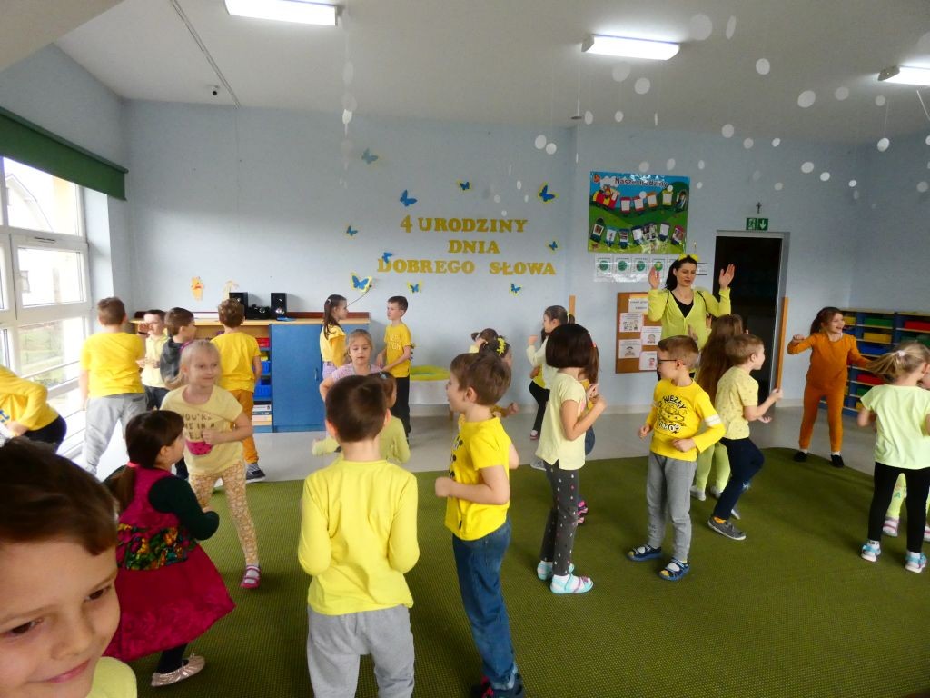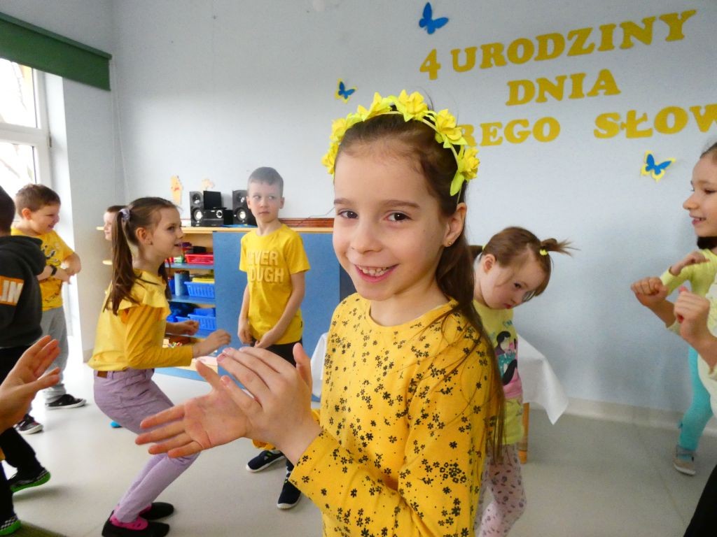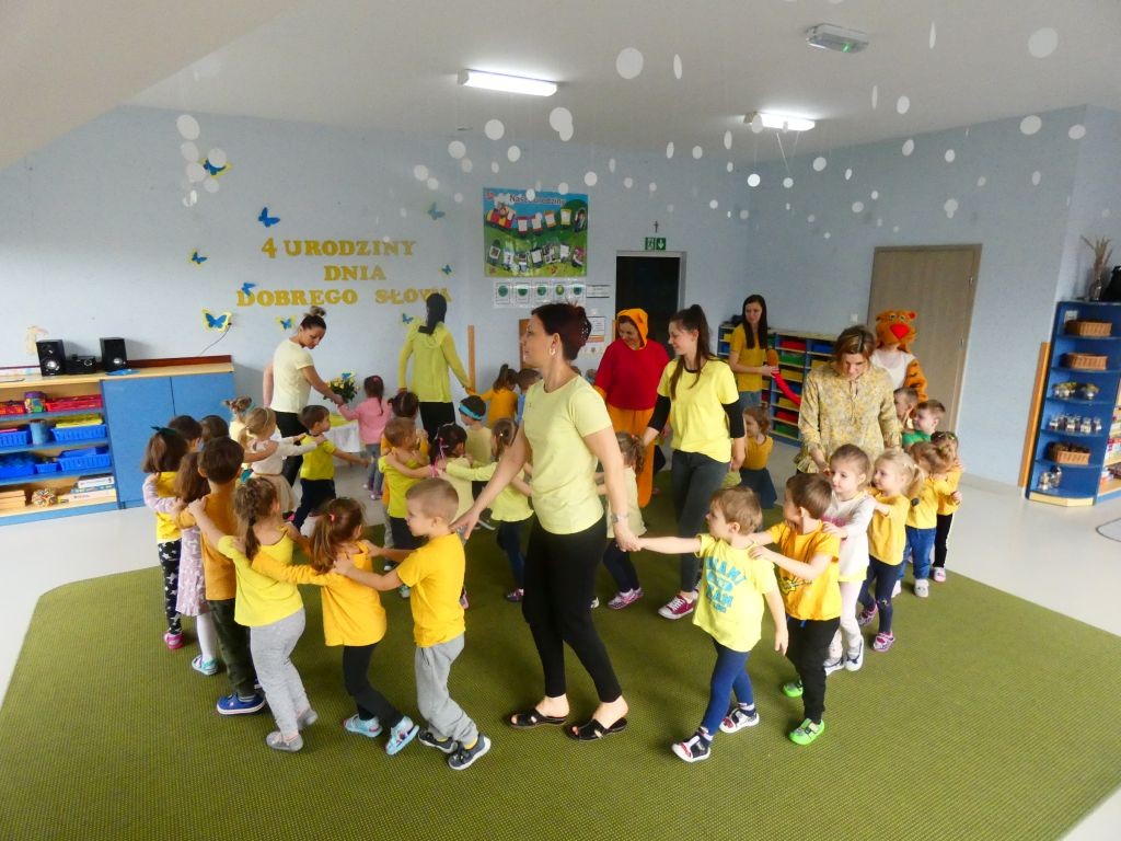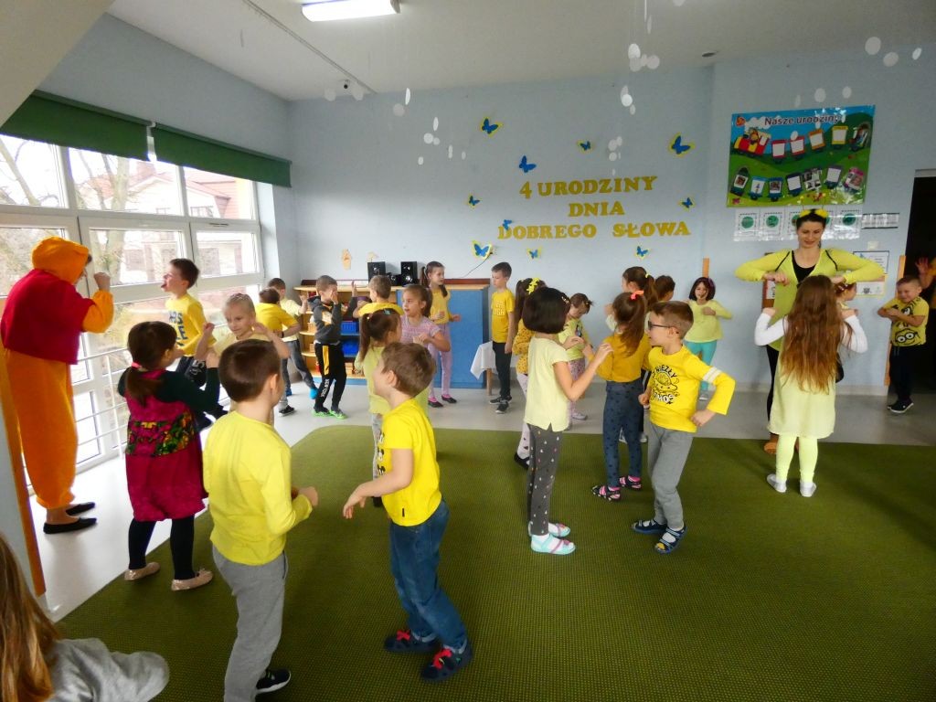 Dzień Dobrego Słowa w naszym przedszkolu kojarzony jest z 13. dniem każdego miesiąca oraz kolorem żółtym, który tego dnia eksponowany jest w holu przedszkola, w salach, a także na zielonych terenach przed przedszkolem. Jest to data, kiedy dzieci mają okazję samodzielnie komponować kanapki w czasie śniadania, ale też uczestniczyć w grupowych zabawach integrujących i tematycznych oraz ubrać się w różnorodne odcienie koloru żółtego pojawiające się na koszulkach, sukienkach, a nawet skarpetkach. Należy jednak pamiętać, że jest to również czas dbania o słowa, które kierujemy względem innych, a także wobec siebie.