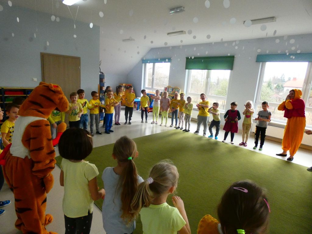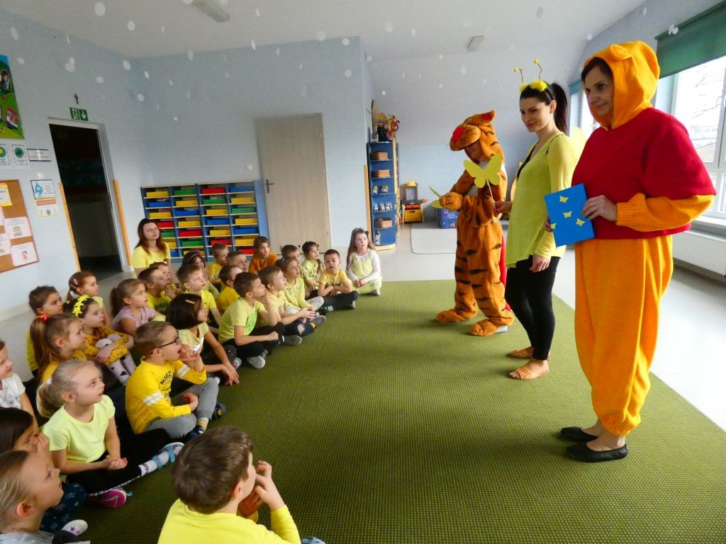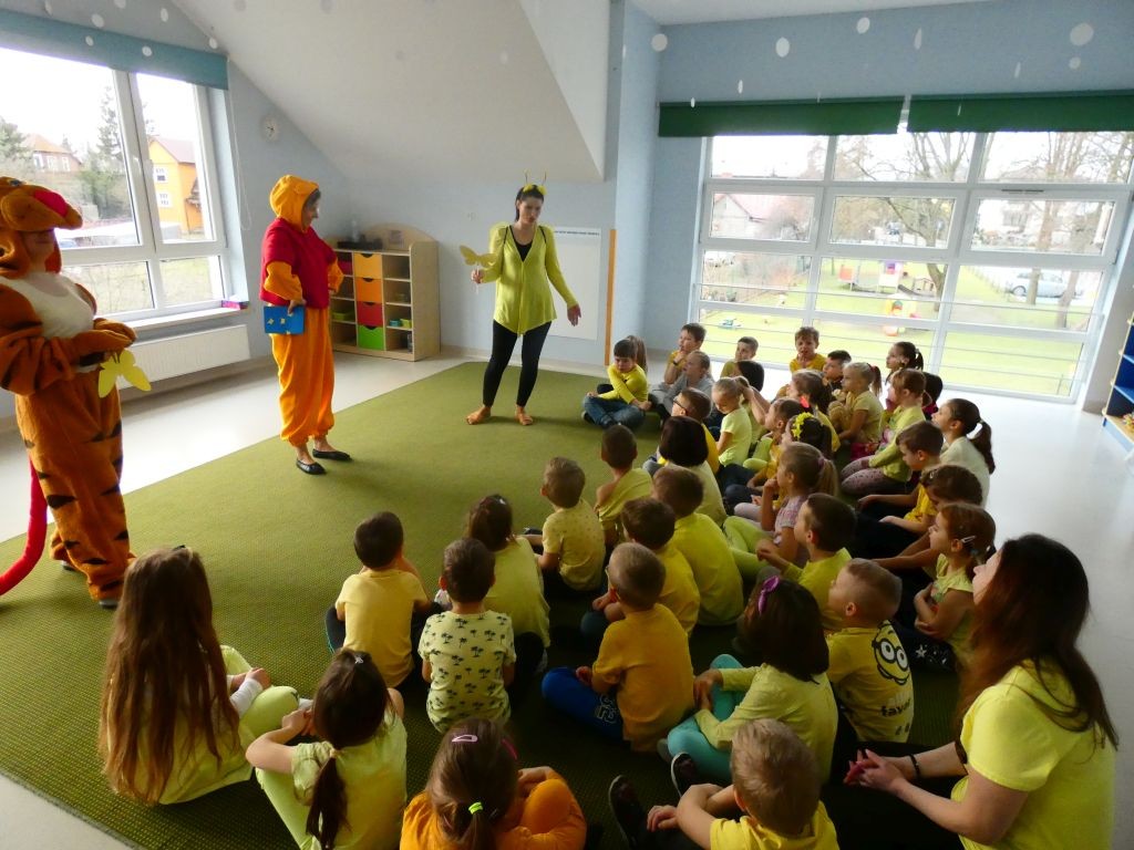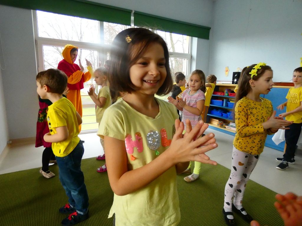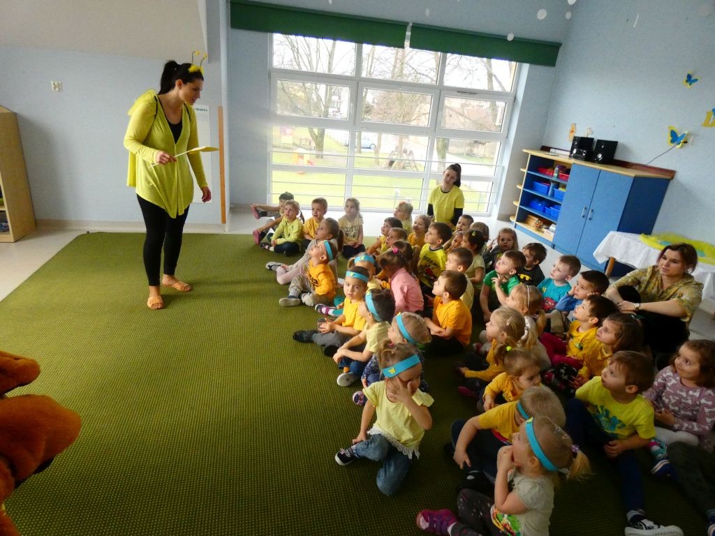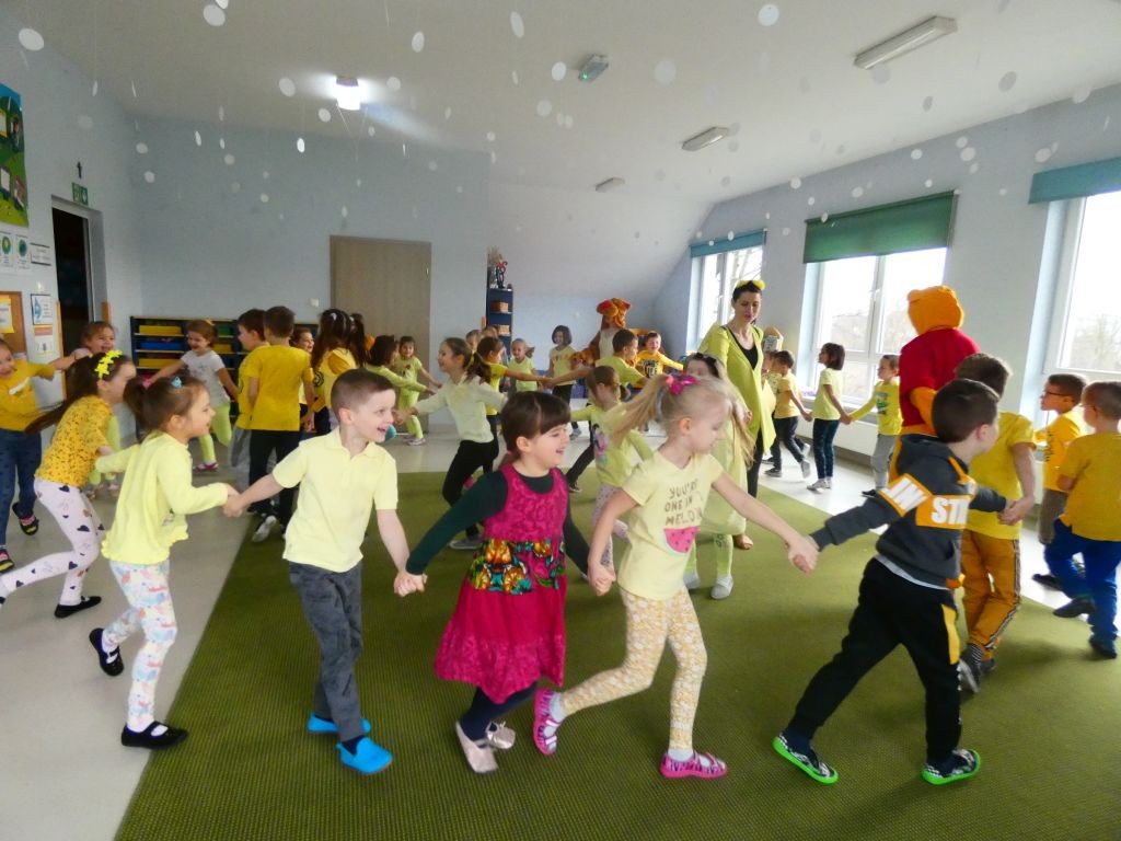 Dzień Dobrego Słowa w naszym przedszkolu kojarzony jest z 13. dniem każdego miesiąca oraz kolorem żółtym, który tego dnia eksponowany jest w holu przedszkola, w salach, a także na zielonych terenach przed przedszkolem. Jest to data, kiedy dzieci mają okazję samodzielnie komponować kanapki w czasie śniadania, ale też uczestniczyć w grupowych zabawach integrujących i tematycznych oraz ubrać się w różnorodne odcienie koloru żółtego pojawiające się na koszulkach, sukienkach, a nawet skarpetkach. Należy jednak pamiętać, że jest to również czas dbania o słowa, które kierujemy względem innych, a także wobec siebie.