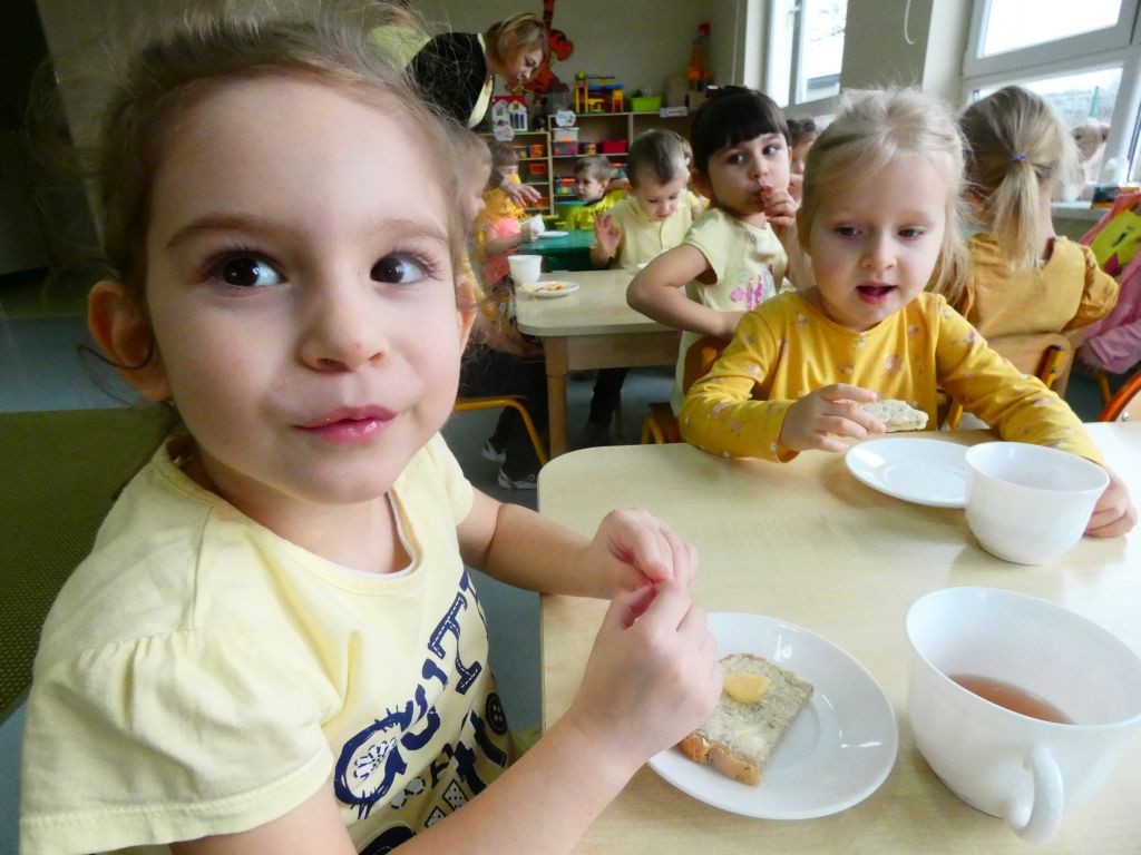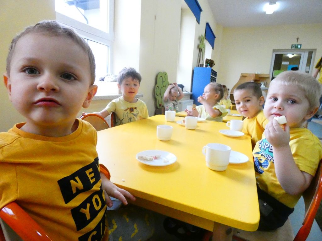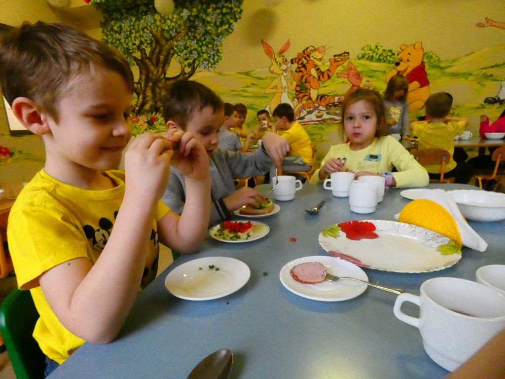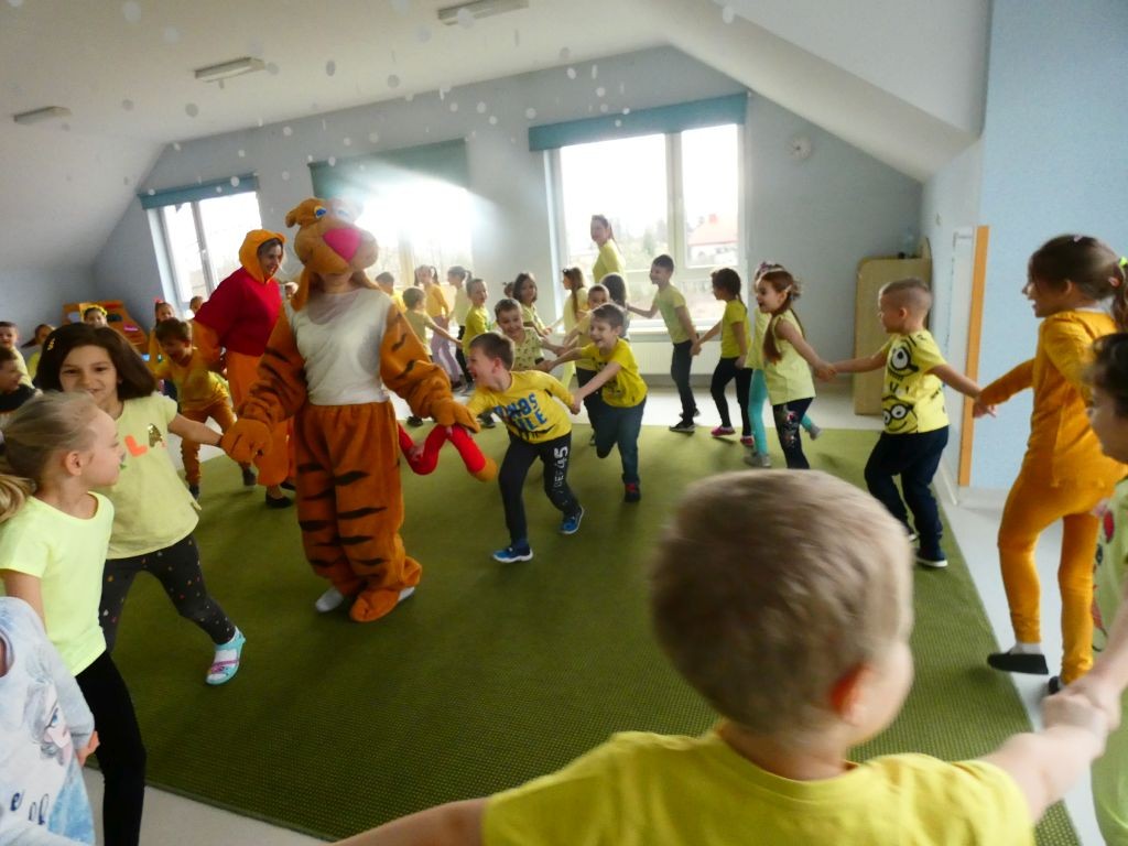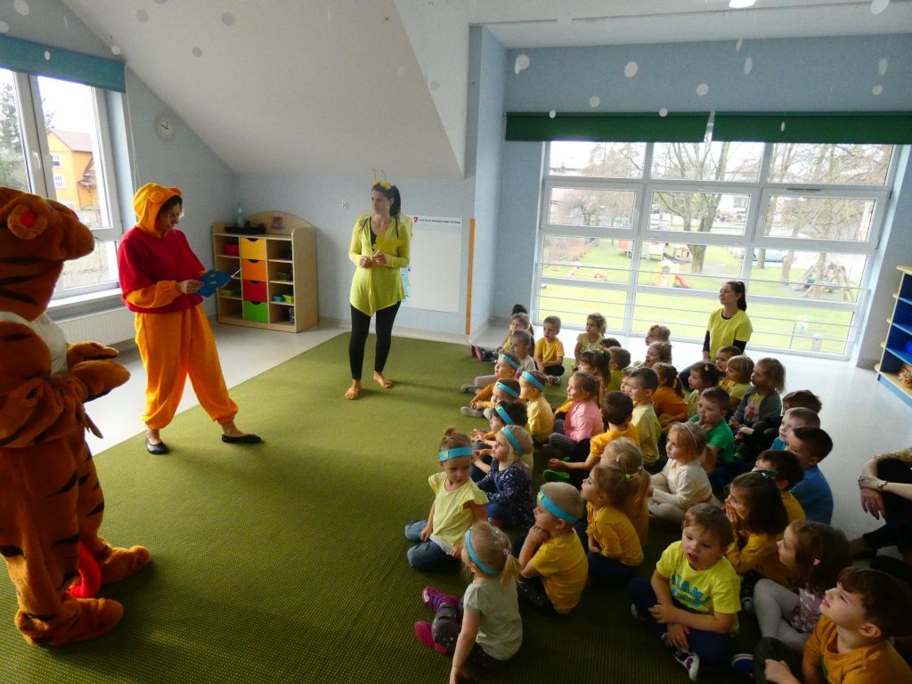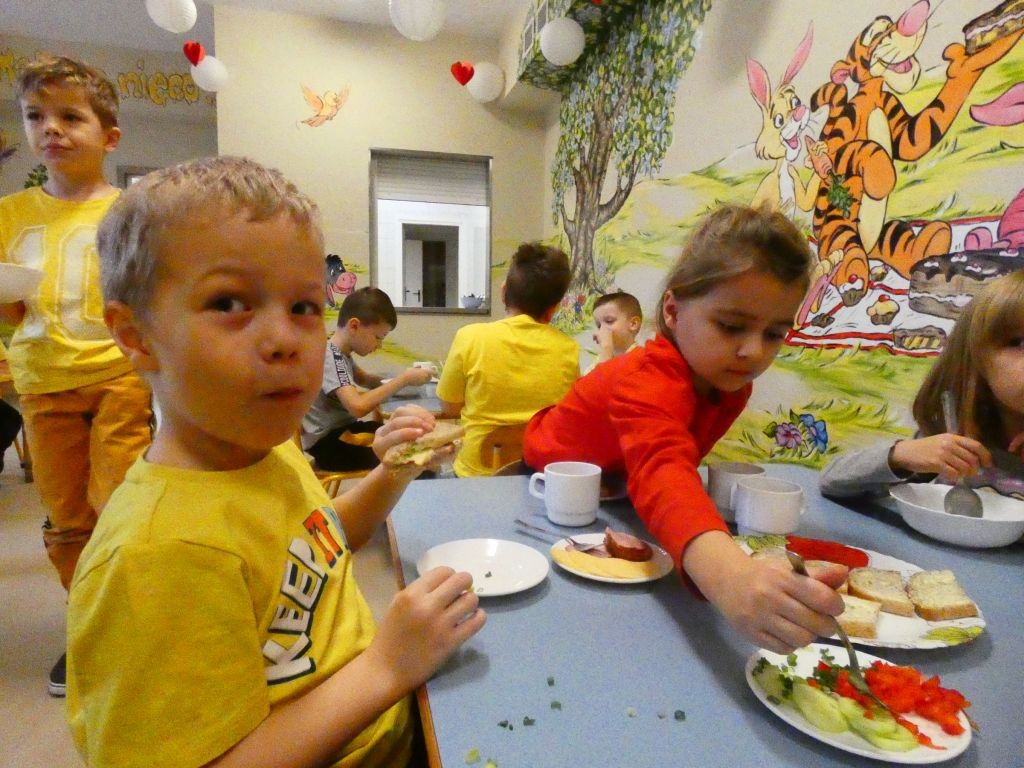 Dzień Dobrego Słowa w naszym przedszkolu kojarzony jest z 13. dniem każdego miesiąca oraz kolorem żółtym, który tego dnia eksponowany jest w holu przedszkola, w salach, a także na zielonych terenach przed przedszkolem. Jest to data, kiedy dzieci mają okazję samodzielnie komponować kanapki w czasie śniadania, ale też uczestniczyć w grupowych zabawach integrujących i tematycznych oraz ubrać się w różnorodne odcienie koloru żółtego pojawiające się na koszulkach, sukienkach, a nawet skarpetkach. Należy jednak pamiętać, że jest to również czas dbania o słowa, które kierujemy względem innych, a także wobec siebie.