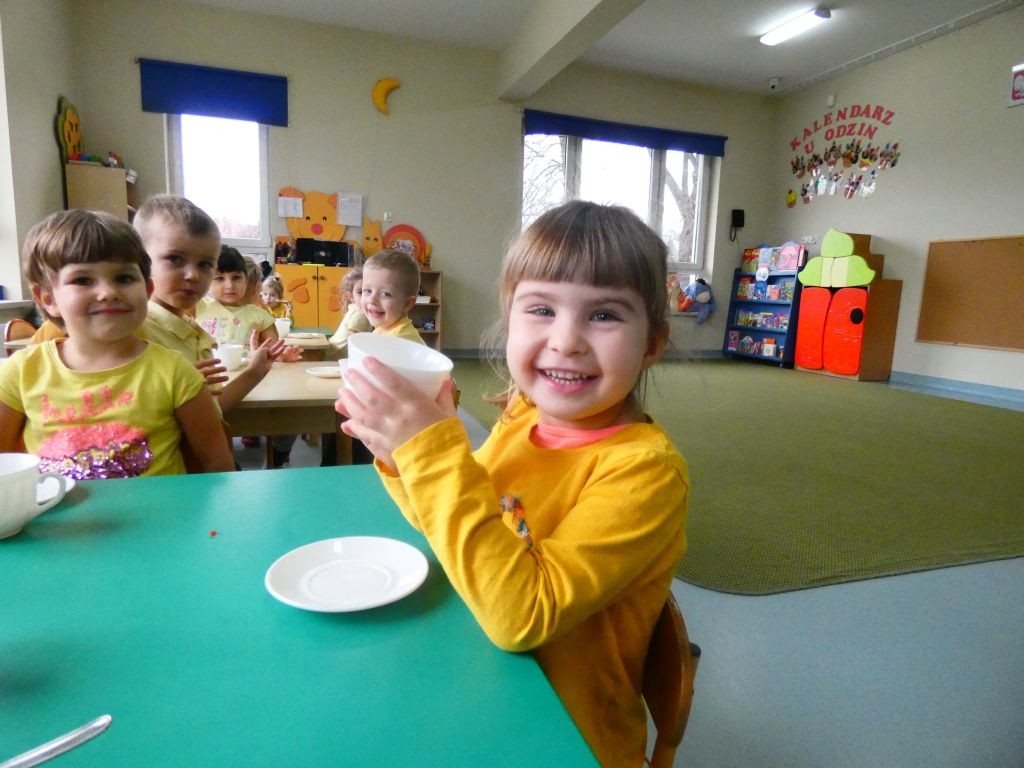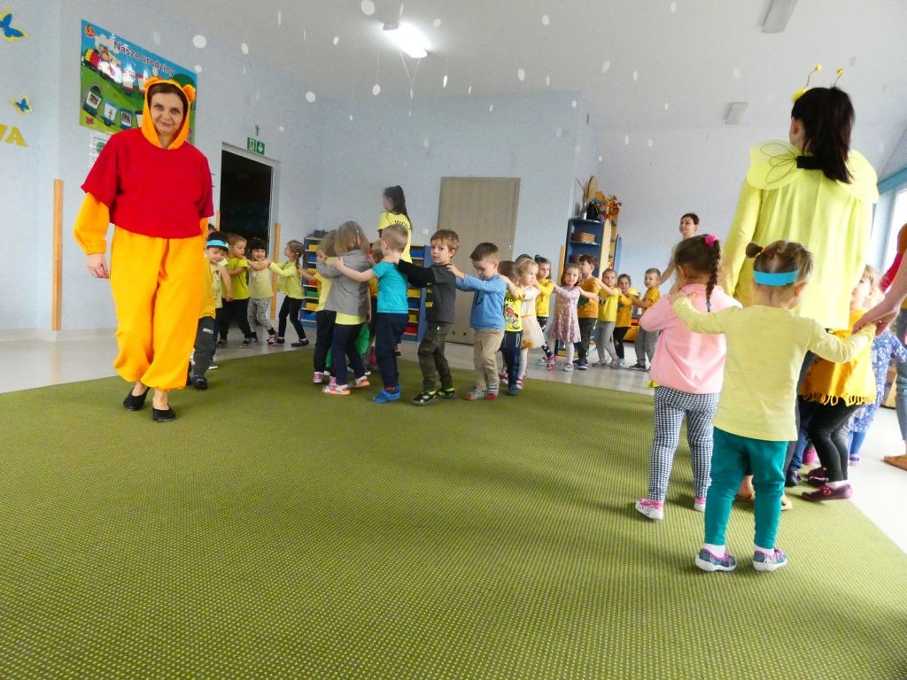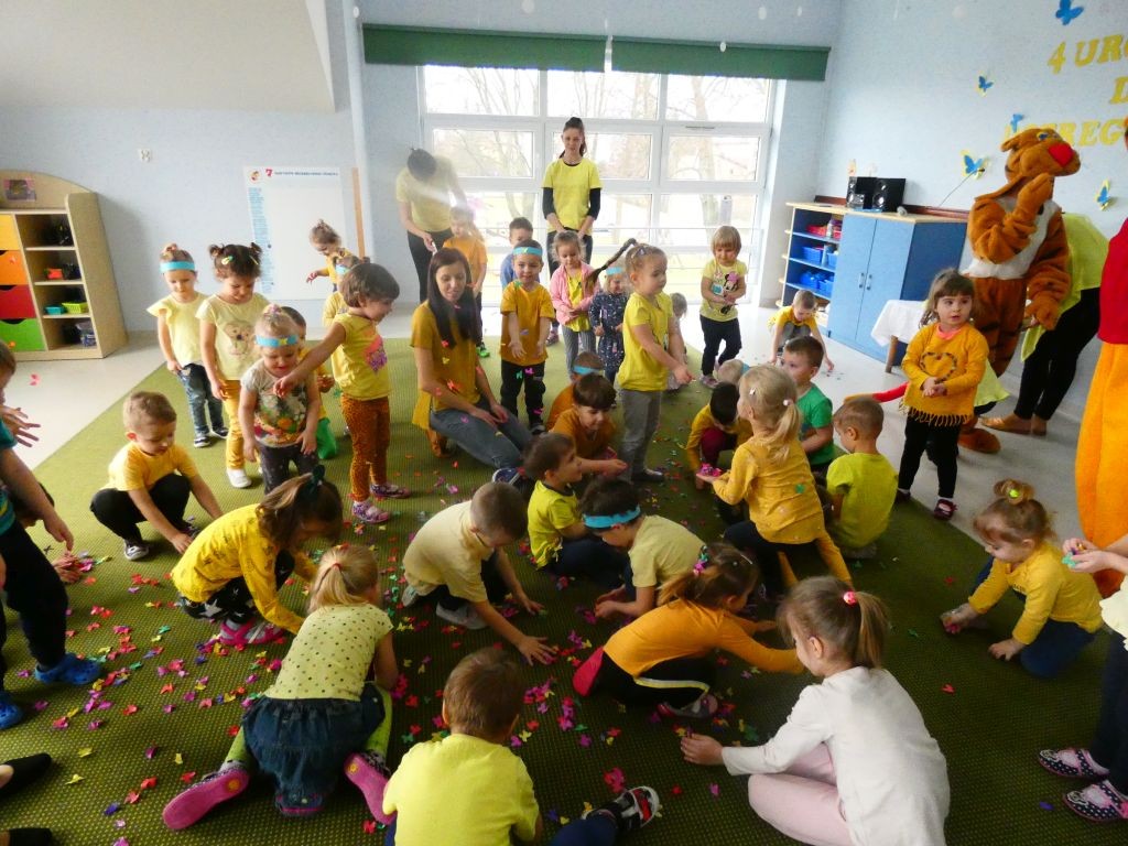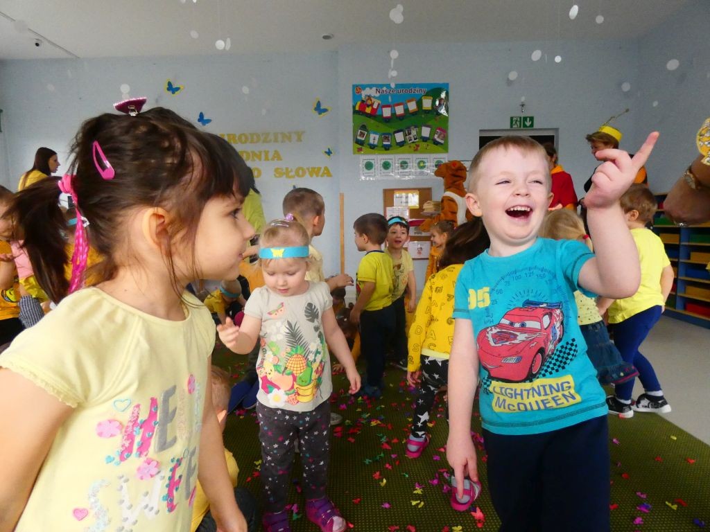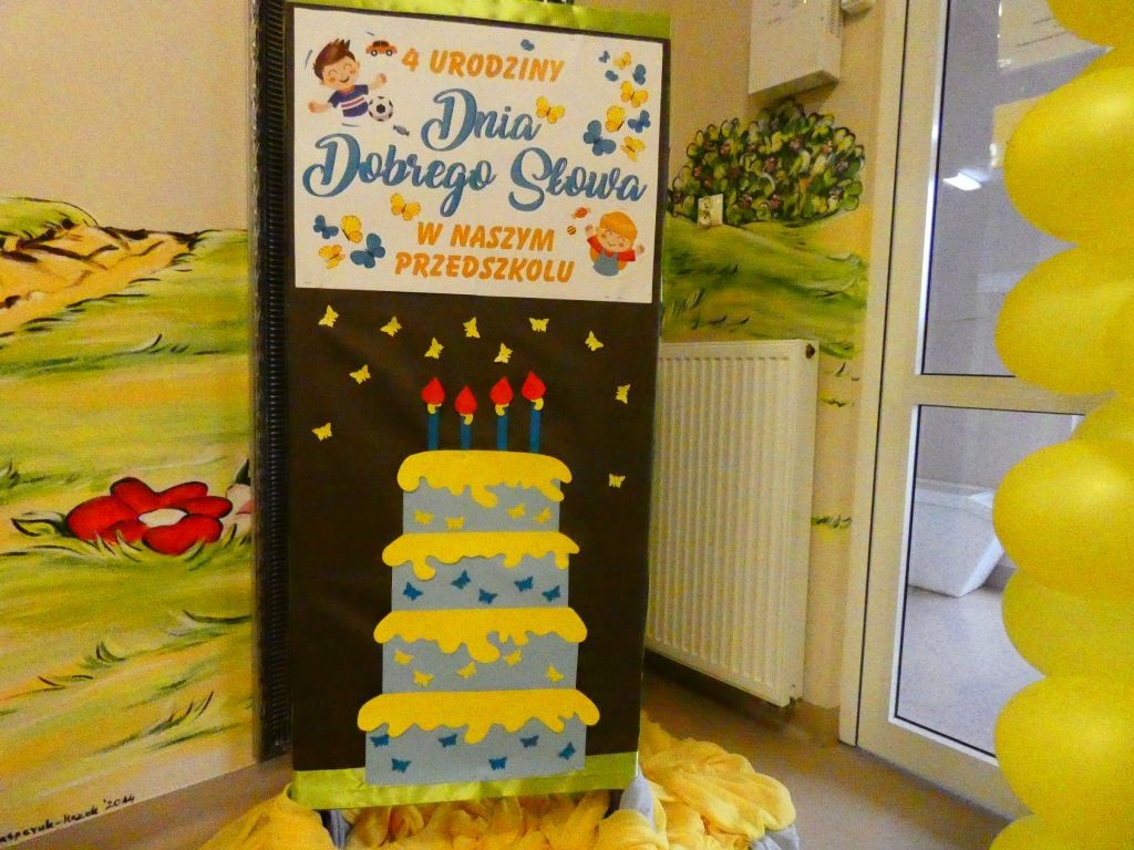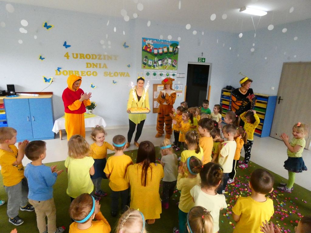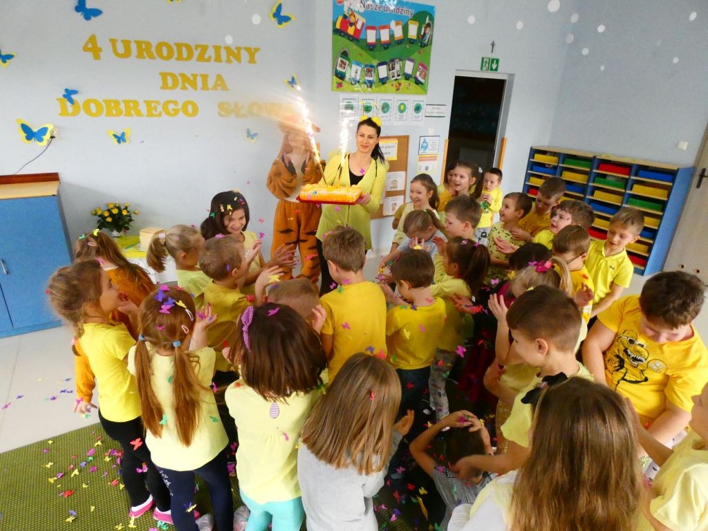 Dzień Dobrego Słowa w lutym stanowi czwartą rocznicę przystąpienia naszego przedszkola do realizacji projektu edukacyjnego zapoczątkowanego w 2010 roku przez Panią Iwonę Majewską-Opiełkę. Nie zabrakło zatem radosnych zabaw przy muzyce w towarzystwie Kubusia, Tygryska oraz oczywiście Motylka. Nasi wyjątkowi Goście z okazji 4. urodzin Dnia Dobrego Słowa sprawili nam ogromną niespodziankę w postaci efektownego żółtego tortu z racami. Na tablicach przy salach zaś pojawiły się wspaniałe babeczki z czterema dobrymi słowami, pokolorowane przez dzieci, a wyeksponowane w formie babeczkowych tortów z czterema świeczkami.