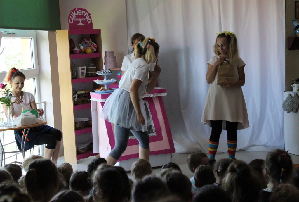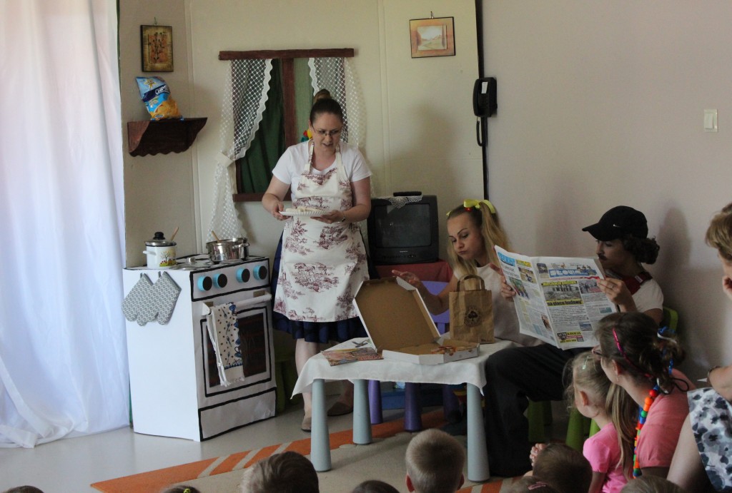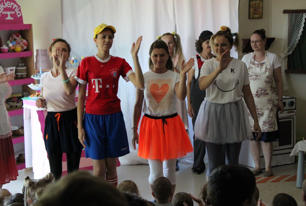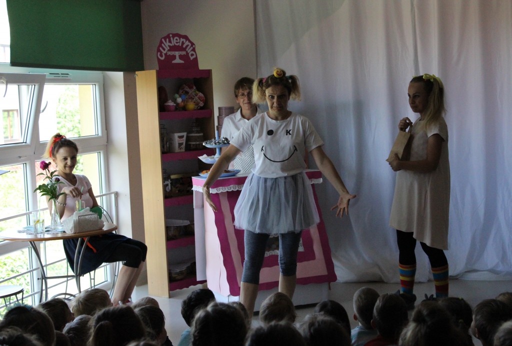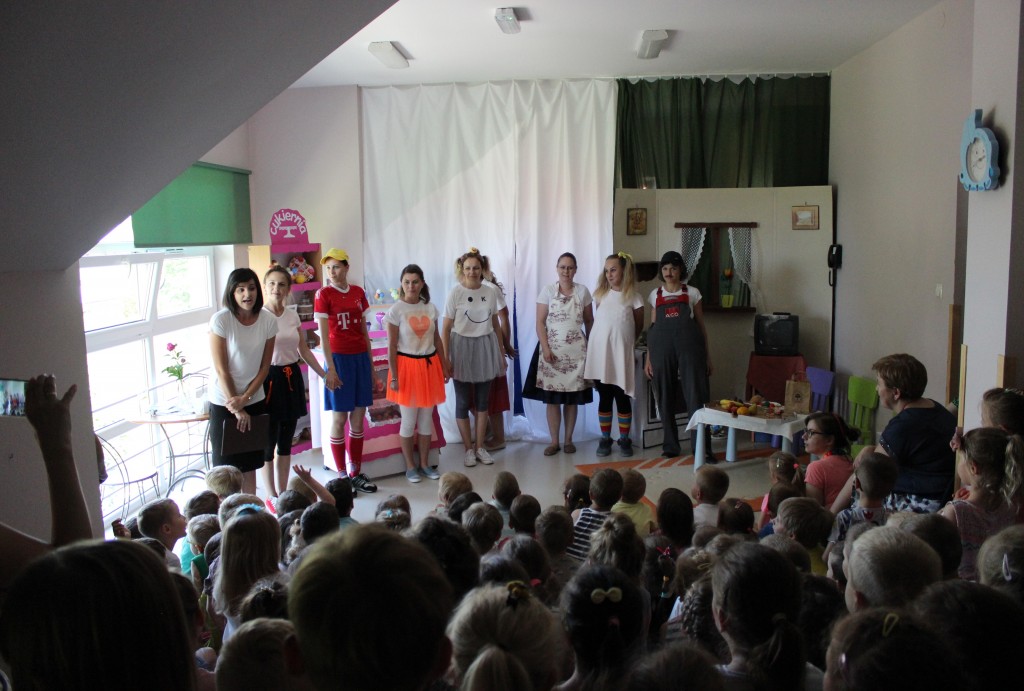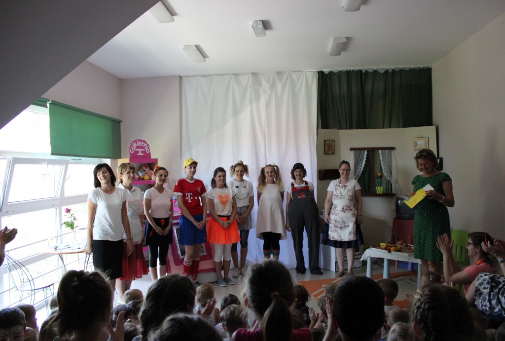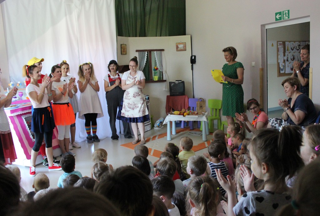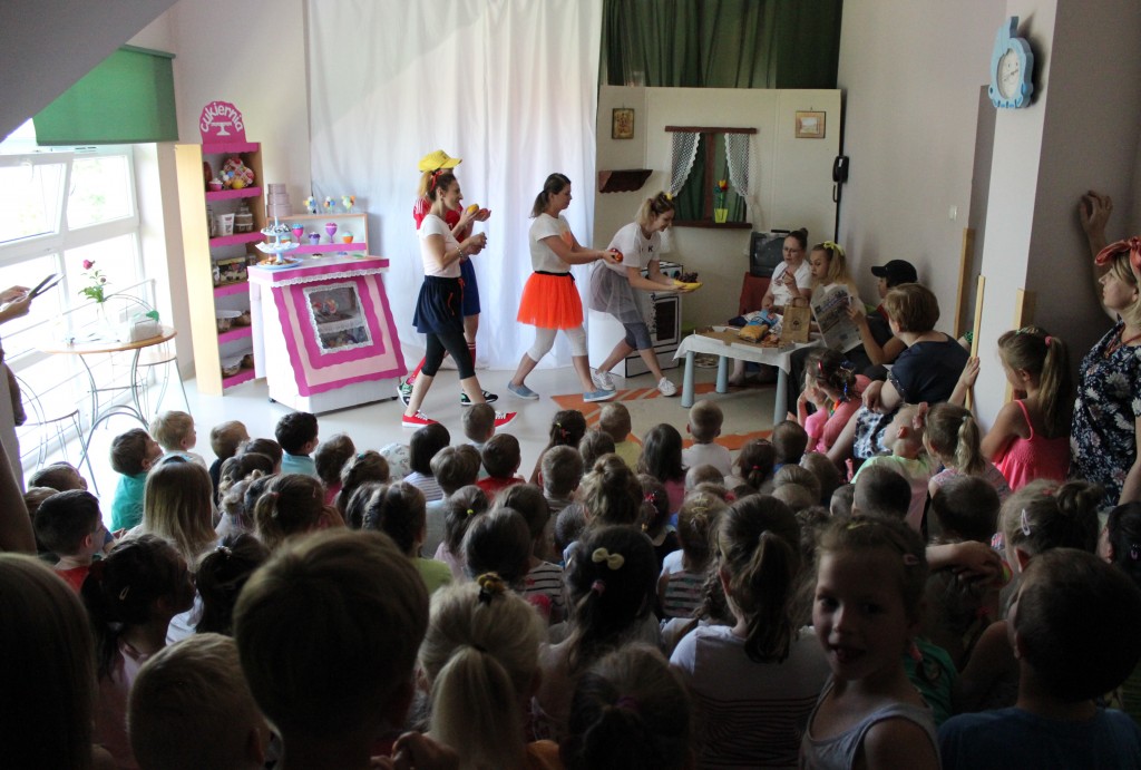 Na dzień dobry każdy Przedszkolak mógł poddać się malowaniu twarzy zgodnie z własnymi upodobaniami. Jeszcze przed śniadaniem sale wypełniły zwierzątka, bohaterowie bajek, warzywa, owoce i inne postacie. Oficjalnego rozpoczęcia Dnia Dziecka dokonała Pani Dyrektor zapraszając jednocześnie Dzieci do obejrzenia przedstawienia o przygodach Marlenki. Zabawny teatrzyk w wykonaniu Pań wprowadził wszystkich w jeszcze lepszy nastrój i na wesoło przypomniał o tym, jak ważne jest zdrowe odżywianie. Na koniec występu Przedszkolaki mogły poczęstować się zdrowym co nieco i wszyscy w pełni sił ruszyli do samodzielnej wędrówki po salach.