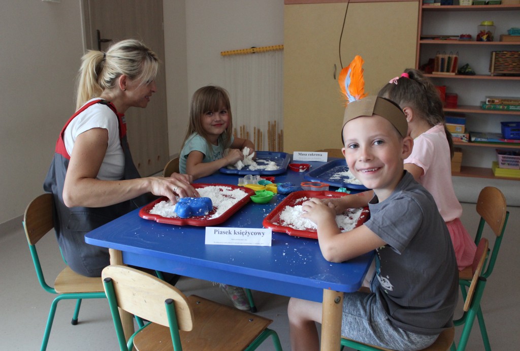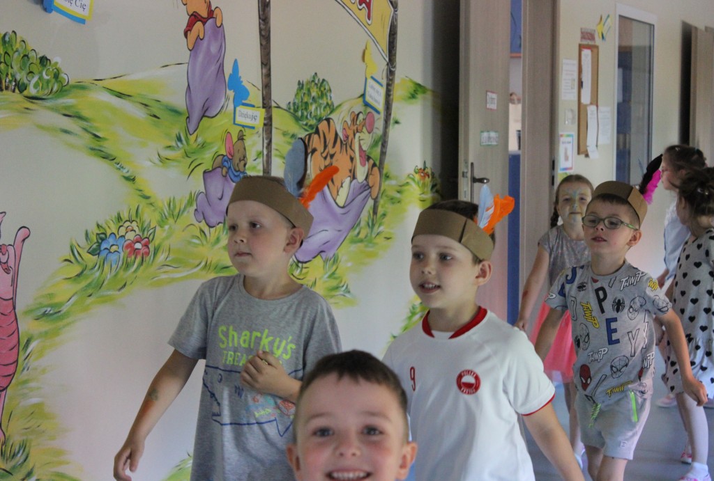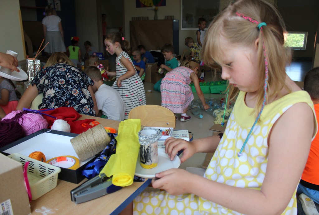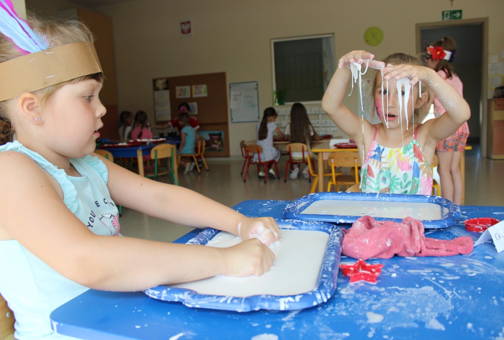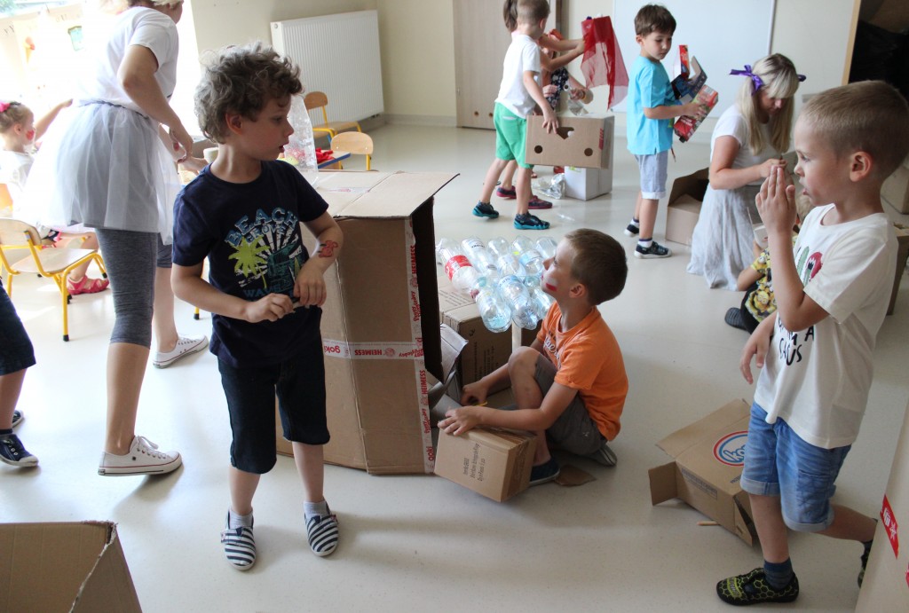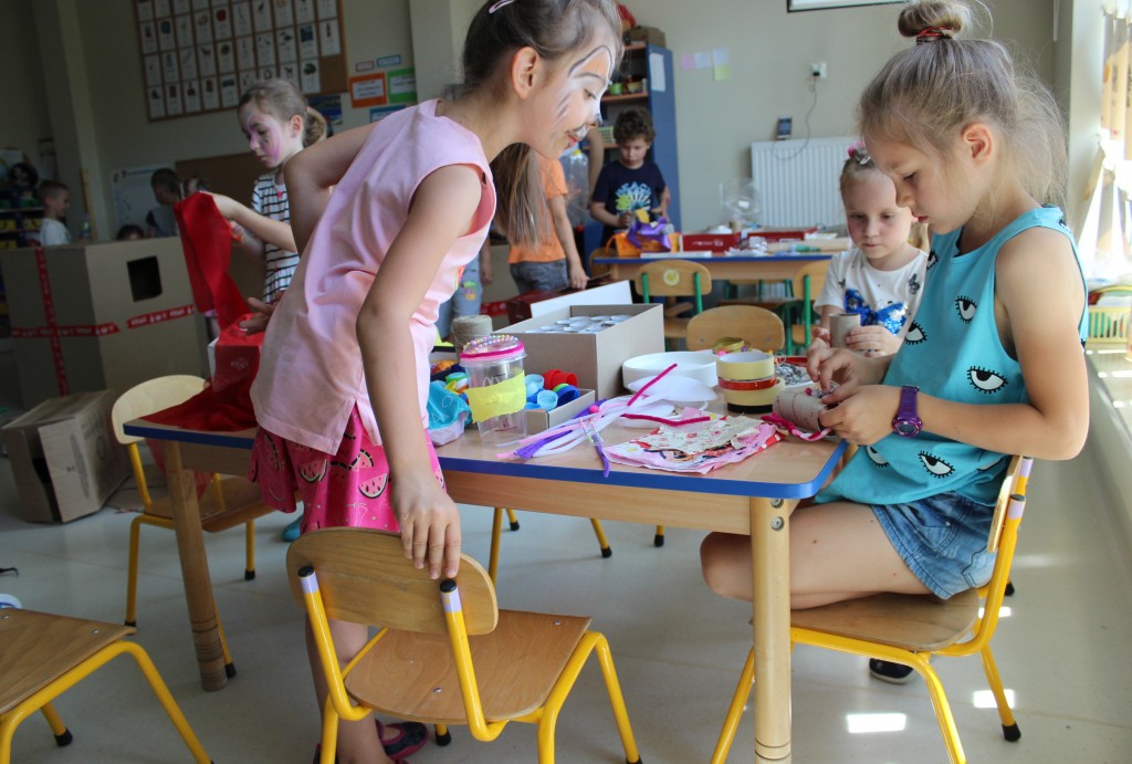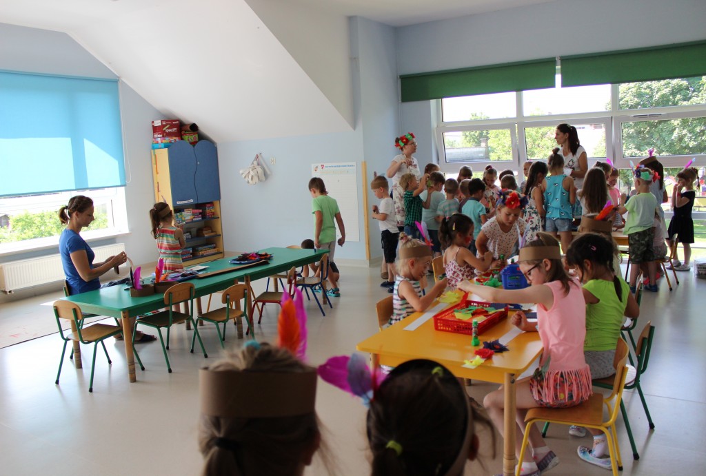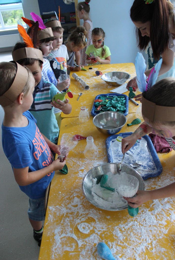 W każdej z nich czekała na nich inna atrakcja. W sali plastycznej dzieci tworzyły wianki i pióropusze, ale także słynne „gniotki”. Dodatkową atrakcją było rysowanie po szarym papierze, które jak zawsze przyciągnęło wielu chętnych. Tuż za ścianą znajdowała się sala bez zabawek, za to pełna kartonowych pudełek, plastikowych butelek itp. Obserwując inwencję twórczą Dzieci w tej sali, trzeba przyznać, że ich wyobraźnia zdecydowanie nie ma granic. Roboty, samochody, kapsuły kosmiczne a wszystko to zbudowane z pozornie zbędnych artykułów. W sali 6-latków Kubusiowi Przyjaciele mogli zamienić się w małych chemików i badaczy testując rozmaite masy plastyczne oraz uczestnicząc w eksperymentach z wykorzystaniem produktów spożywczych dostępnych w każdej kuchni. Sale 4-latków oferowały naszym Zuchom mnóstwo aktywności ruchowej! Tory przeszkód oraz zabawy taneczne zaabsorbowały szczególnie młodszych Milusińskich.