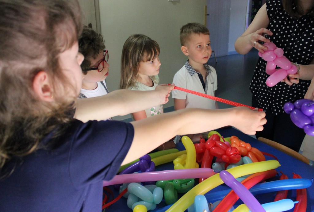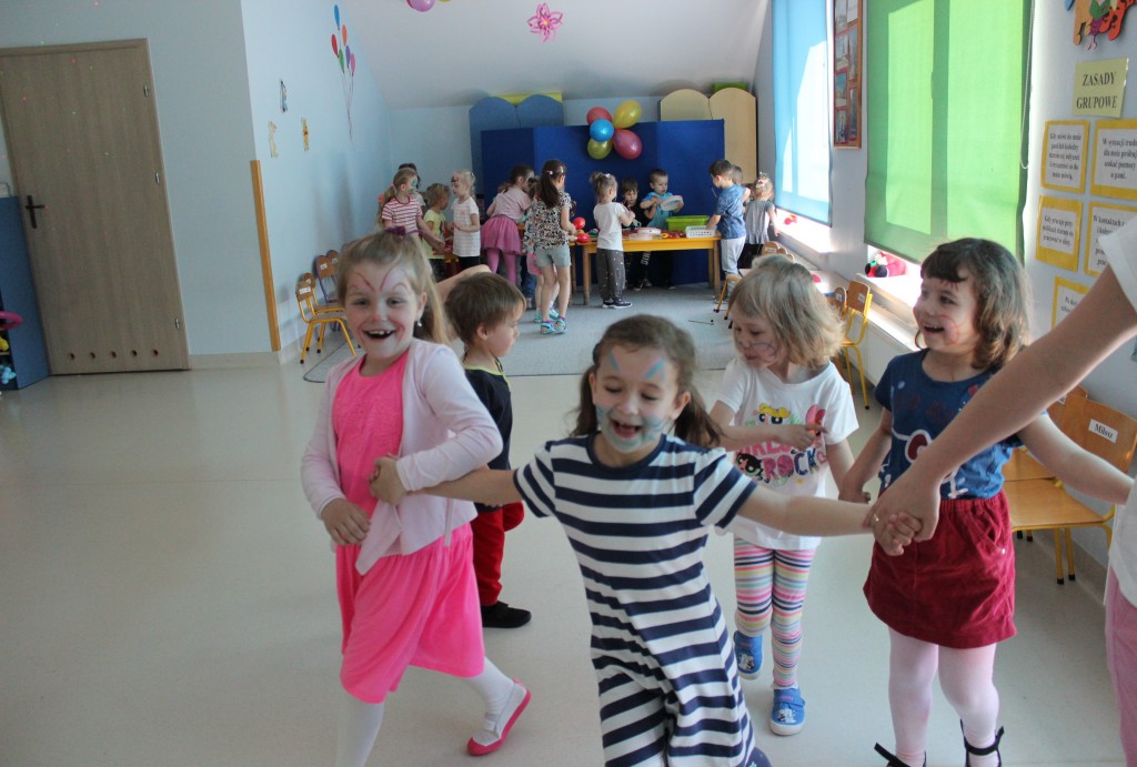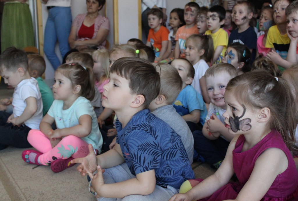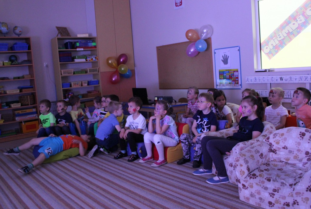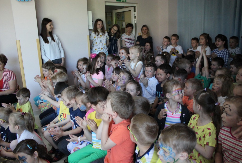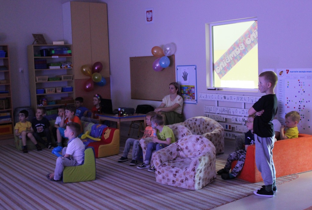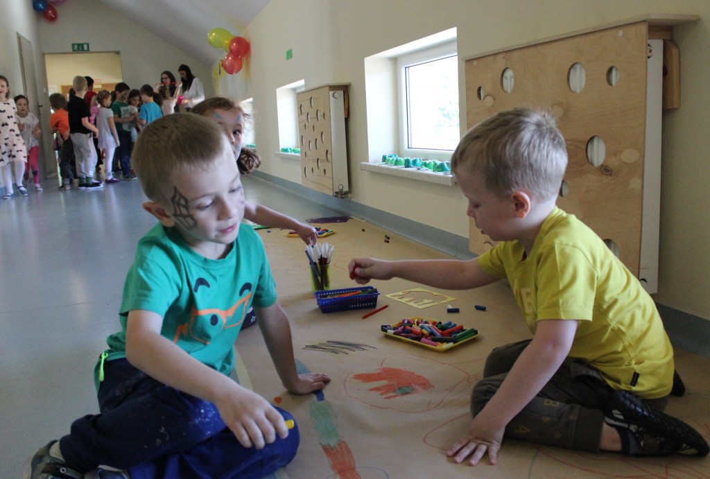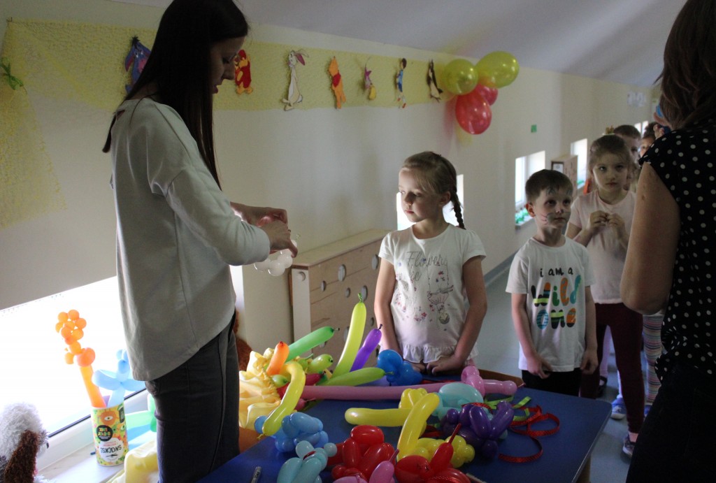 Kubusiowi przyjaciele również doczekali się swojego święta. W przeddzień 1 czerwca, przedszkole zamieniło się w wielką salę zabaw, tańców i kolebkę pięknych wspomnień. Zaraz po śniadaniu wszyscy zgromadziliśmy się w sali teatralnej, gdzie Pani Dyrektor wspólnie ze swoimi małymi pomocnikami zapoznała nas z nowymi przygodami przyjaciół z Krainy Siedmiu Dębów. Następnie wszyscy udali się na samodzielne zwiedzanie sali przedszkolnych. W każdej z nich czekała na dzieci inna atrakcja. Było kino bambino, sala muzyczna, ruchowa, konstrukcyjna a także zabawy z masami plastycznymi, rysowanie, balonowe cuda i malowanie twarzy.