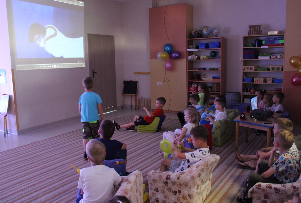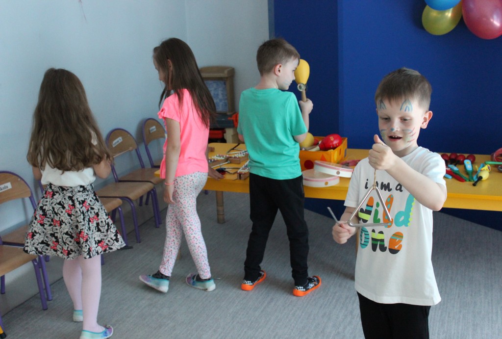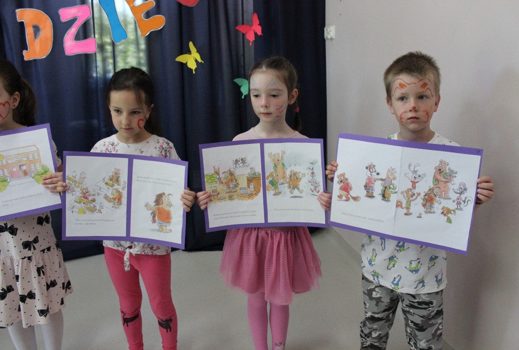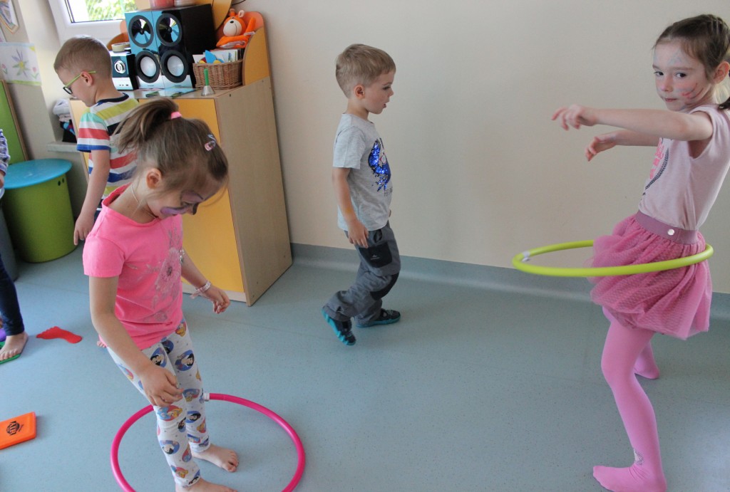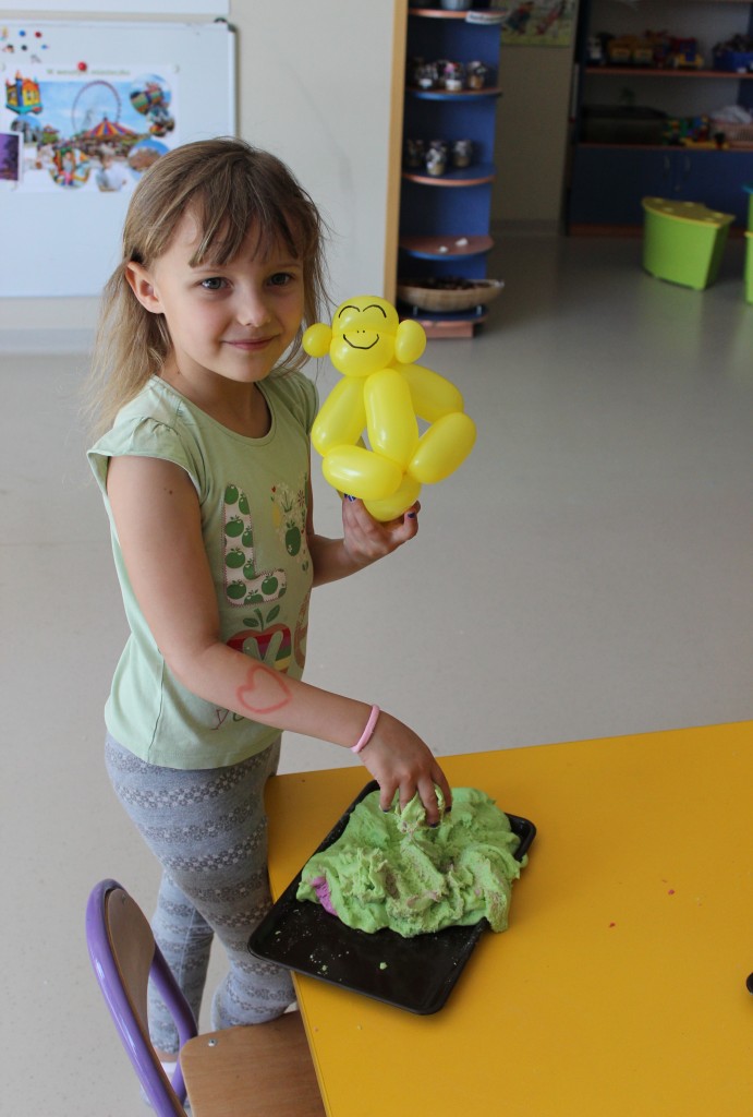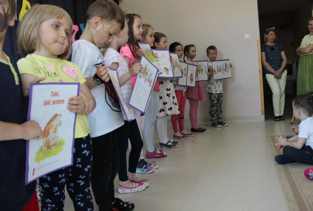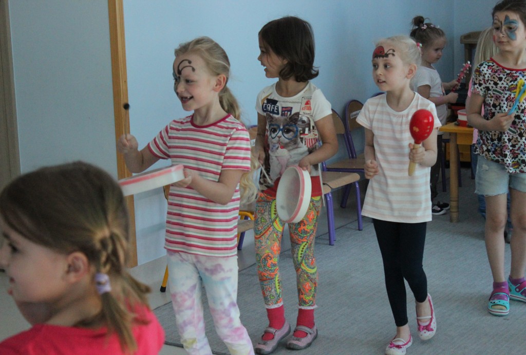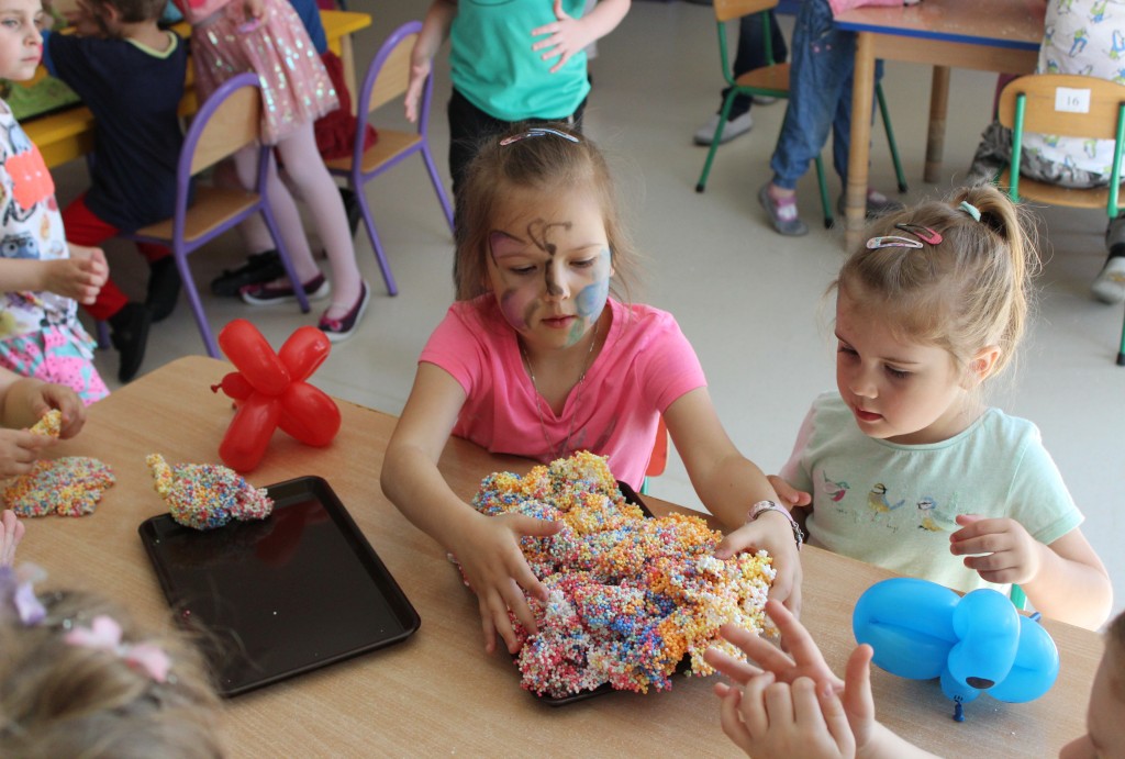 Kubusiowi przyjaciele również doczekali się swojego święta. W przeddzień 1 czerwca, przedszkole zamieniło się w wielką salę zabaw, tańców i kolebkę pięknych wspomnień. Zaraz po śniadaniu wszyscy zgromadziliśmy się w sali teatralnej, gdzie Pani Dyrektor wspólnie ze swoimi małymi pomocnikami zapoznała nas z nowymi przygodami przyjaciół z Krainy Siedmiu Dębów. Następnie wszyscy udali się na samodzielne zwiedzanie sali przedszkolnych. W każdej z nich czekała na dzieci inna atrakcja. Było kino bambino, sala muzyczna, ruchowa, konstrukcyjna a także zabawy z masami plastycznymi, rysowanie, balonowe cuda i malowanie twarzy.