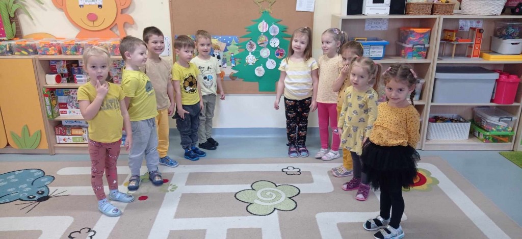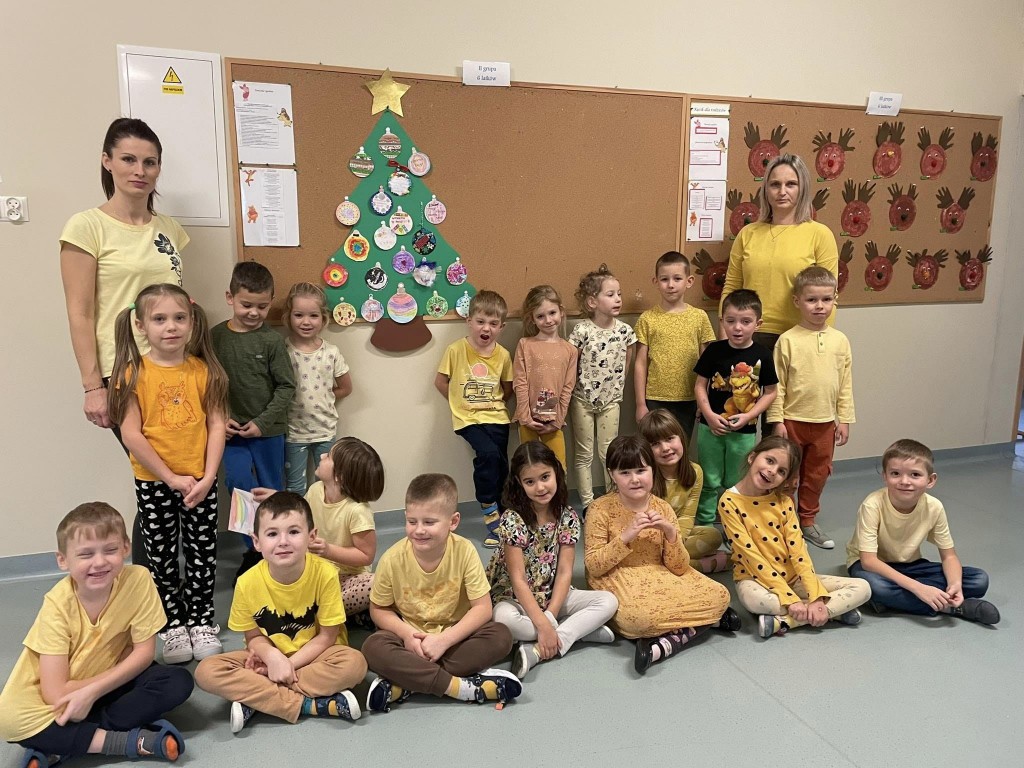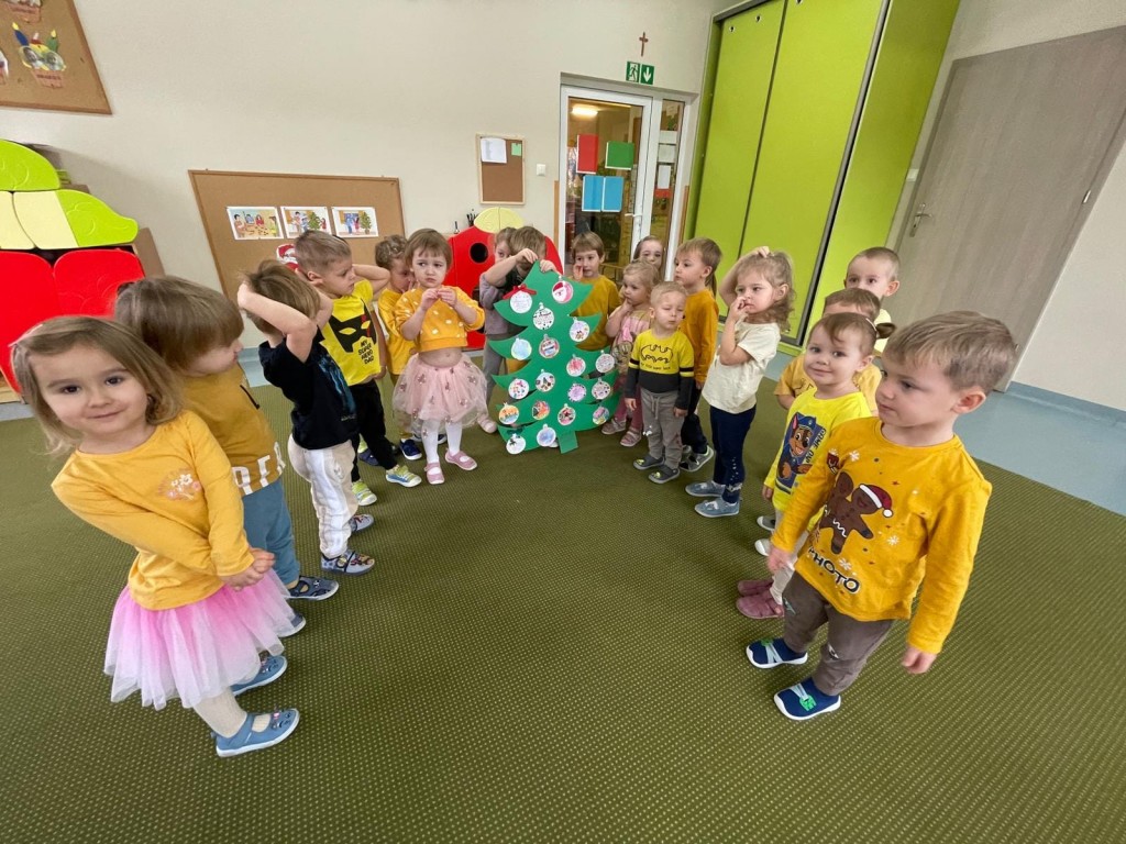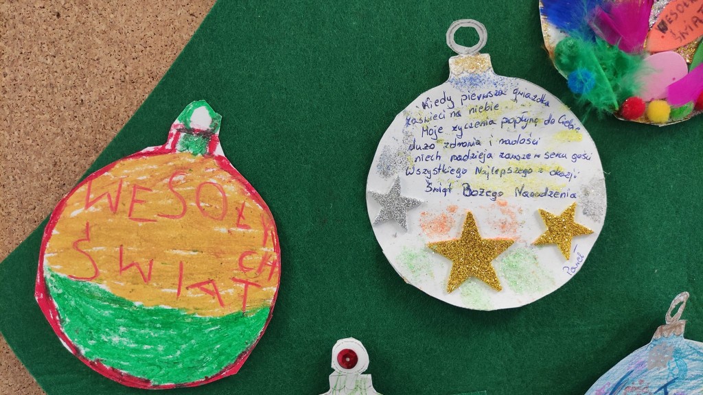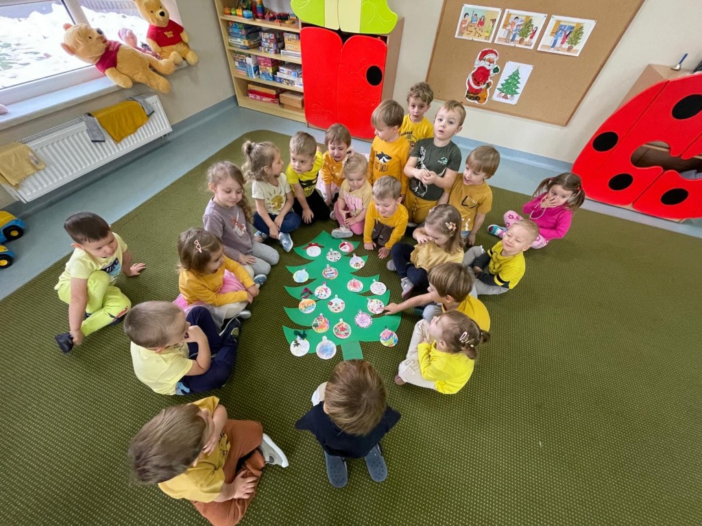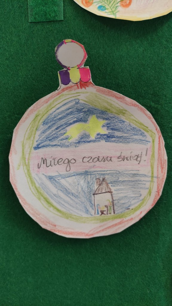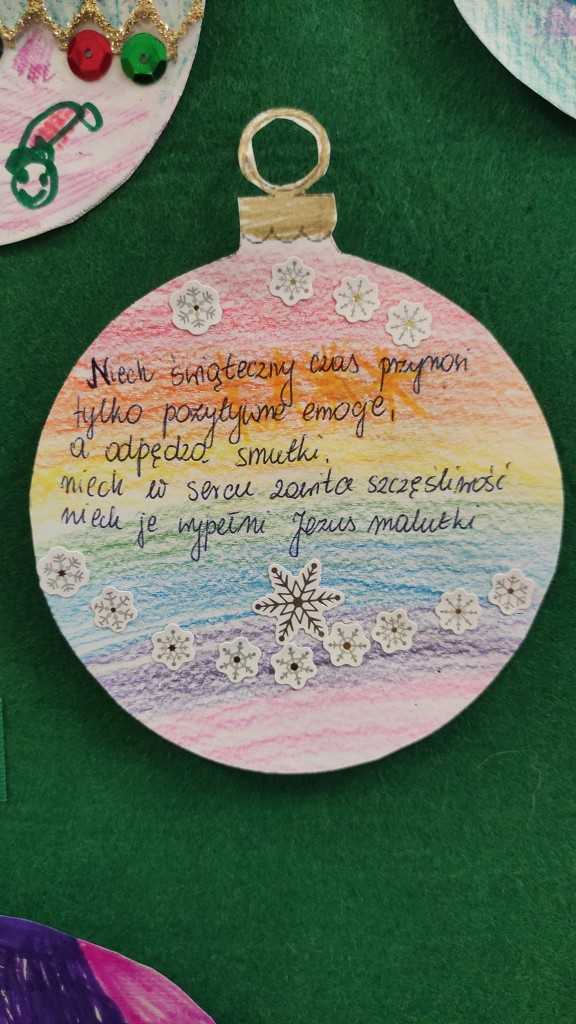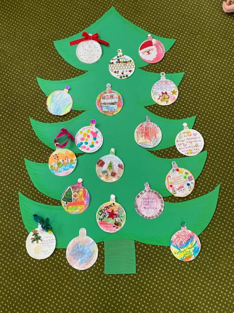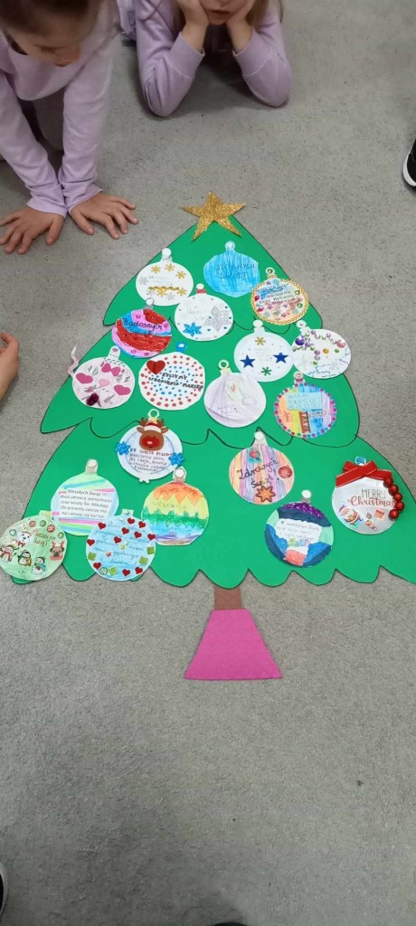 Świętowanie grudniowego Dnia Dobrego Słowa połączyłyśmy z rozwijaniem u dzieci umiejętności składania i przyjmowania życzeń świątecznych. To niezwykle cenna i ważna umiejętność na całe życie. Dziękujemy za wszystkie bombki z życzeniami.