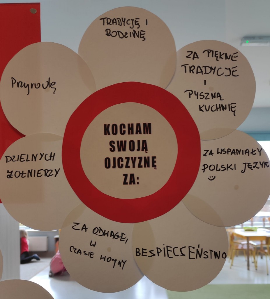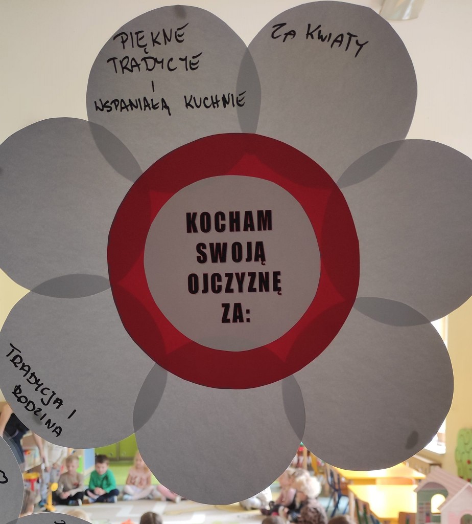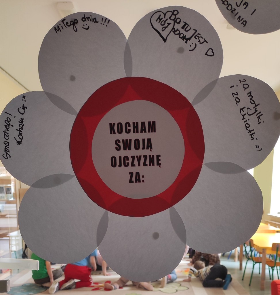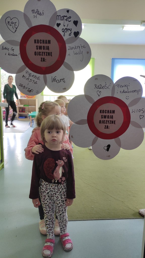 Nie trudno się domyśleć, że listopadowy Dzień Dobrego Słowa nawiązywał do bardzo ważnego dla nas Polaków święta - Święta Niepodległości i wiązał się z wyrabianiem u dzieci postaw patriotycznych szczególnie w zakresie określania tego za co kochamy Polskę.