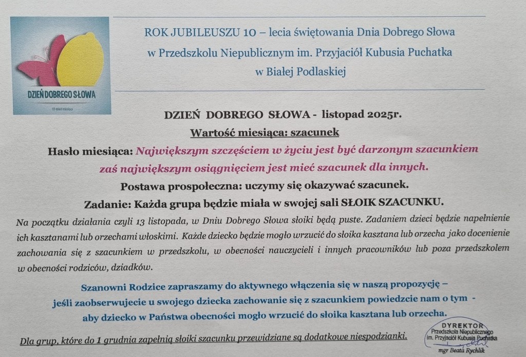 Świętując listopadowy Dzień Dobrego Słowa idziemy dalej ścieżką wyrabiania ważnych postaw prospołecznych. Hasłem przewodnim naszego świętowania są słowa: