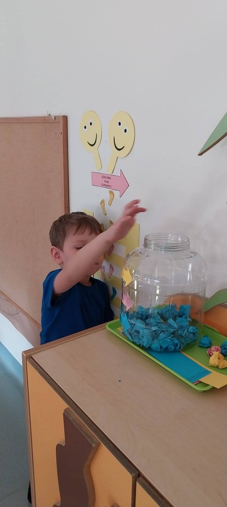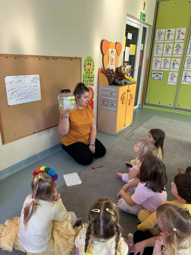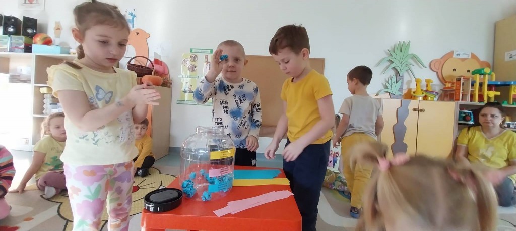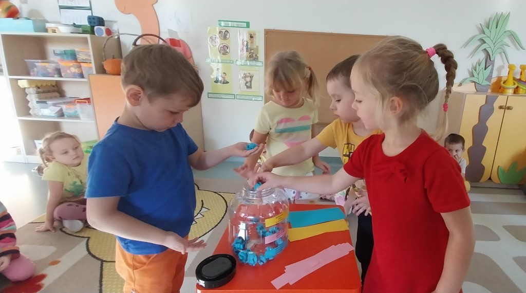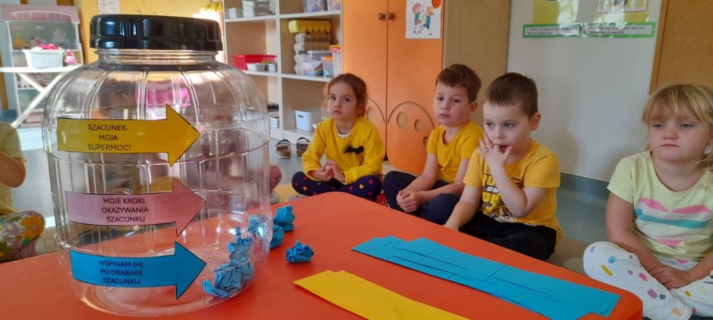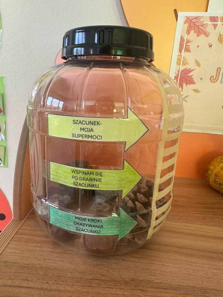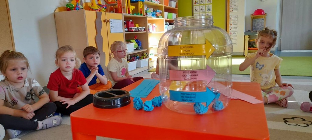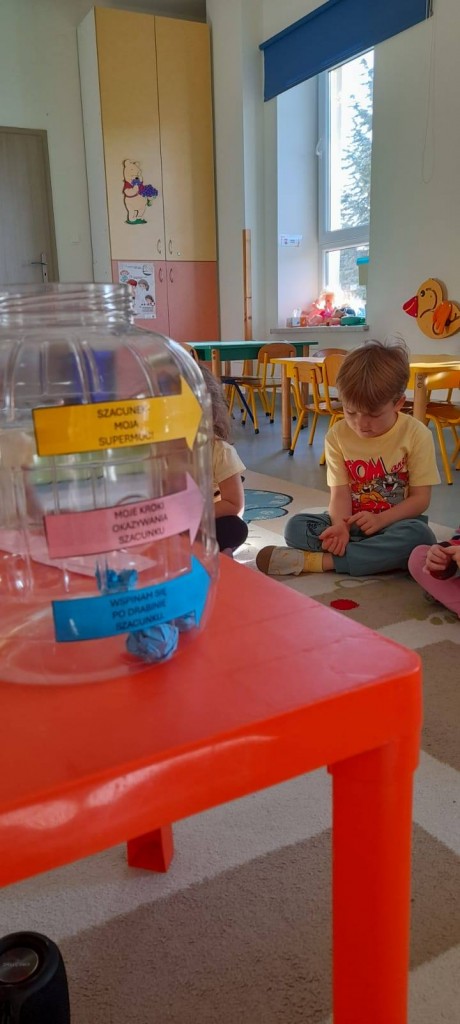 A zatem w tym miesiącu uczymy się okazywać szacunek. Dzieci zostały wprowadzone do tematu szacunku przez zajęcia wychowawczo - dydaktyczne obrazujące szacunek oraz zachowania świadczące o nim. Każda grupa otrzymała specjalne zadanie - za każde zachowanie się z szacunkiem w przedszkolu i poza nim, każdy przedszkolak wrzuca do "Słoika Szacunku" jeden element wybrany przez Panie. A kiedy "Słoiki Szacunku" się zapełnią.....