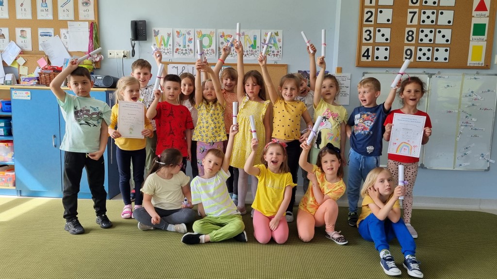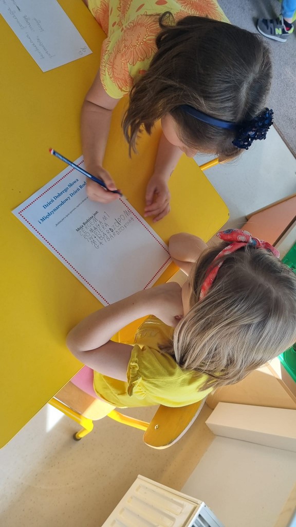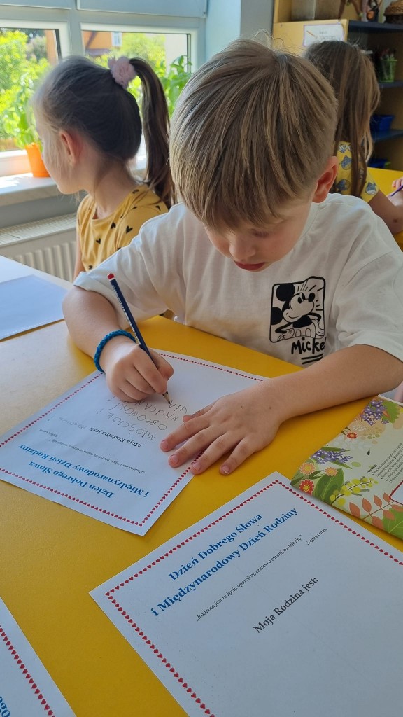 Jako wyraz wdzięczności za miłość rodzicielską, za oparcie i siłę jaką daje Rodzina dzieci wykonały laurki - listy do Rodziców. Dzieci młodsze kolorowały serce z kwiatami zaś starszacy sami rysowali swoją rodzinę oraz sami pisali to jaka jest ich Rodzina. Zaangażowanie dzieci w to działanie oraz radość obdarowanych rodziców i tych, ktorzy ten dar wykonali i podarowali razem z dobrym słowem są dla nas potwierdzeniem tego, że to był dobry pomysł na świętowanie kolejnego Dnia Dobrego Słowa. Każde kolejne świętowanie pokazuje nam cenne owoce wdrażania tego projektu.
