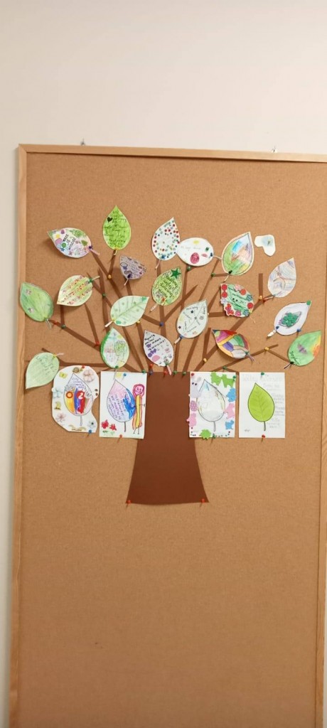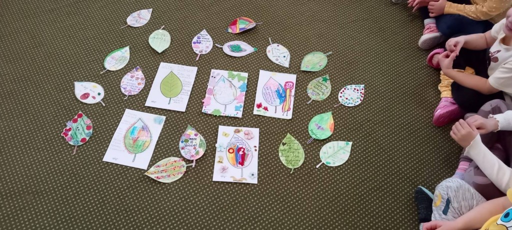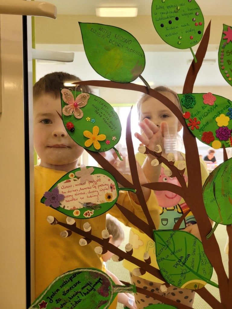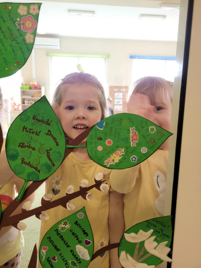 Wiosenne drzewka z listkami zawierającymi dobre słowa, wykonane przez dzieci wspólnie z rodzicami