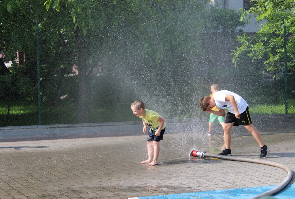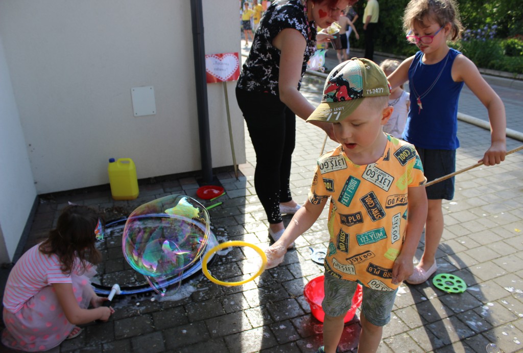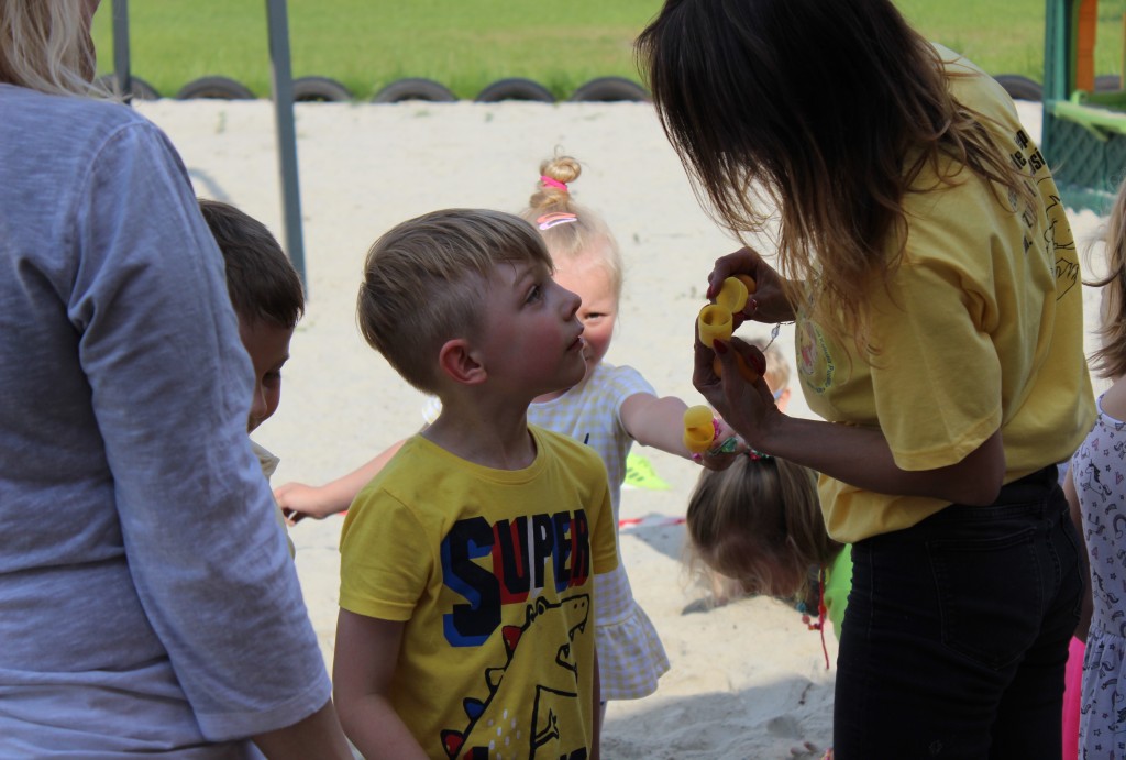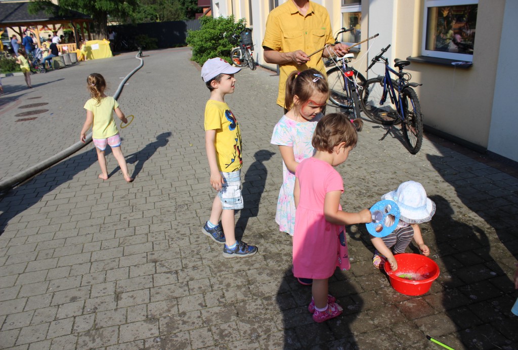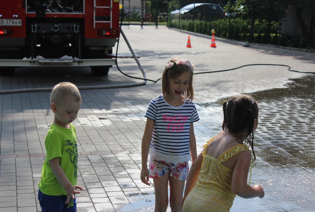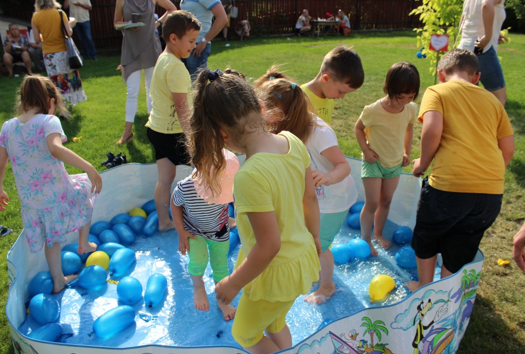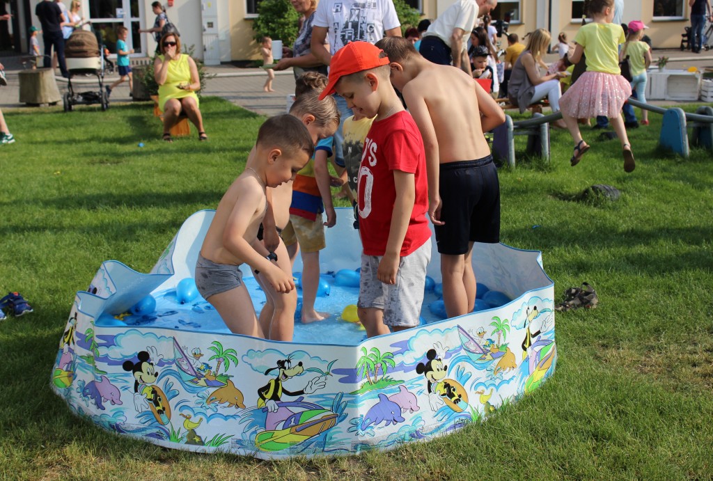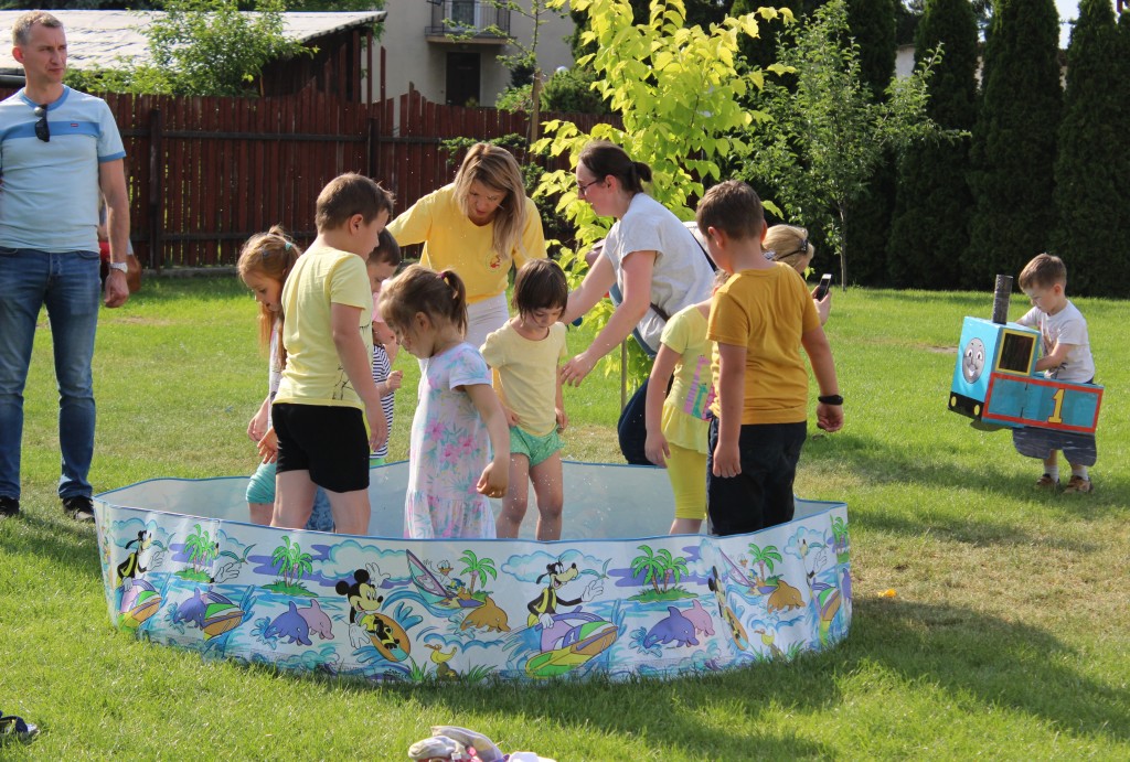 Po części oficjalnej, teren naszego przedszkola zamienił się w prawdziwy rodzinny piknik. Każdy mógł tam znaleźć coś dla siebie, od działań plastycznych po konkurencje ruchowe, stoisko z książkami i ścieżkę sensoryczną. Największą atrakcją niewątpliwie okazała się kurtyna wodna przygotowana przez straż pożarną, która dzięki dopisującej pogodzie zapewniła niesamowitą zabawę. Dzięki wsparciu rodziców nie zabrakło oczywiście małego co nieco w naszej kubusiowej kawiarence