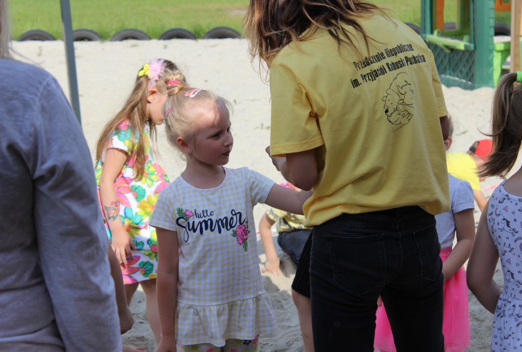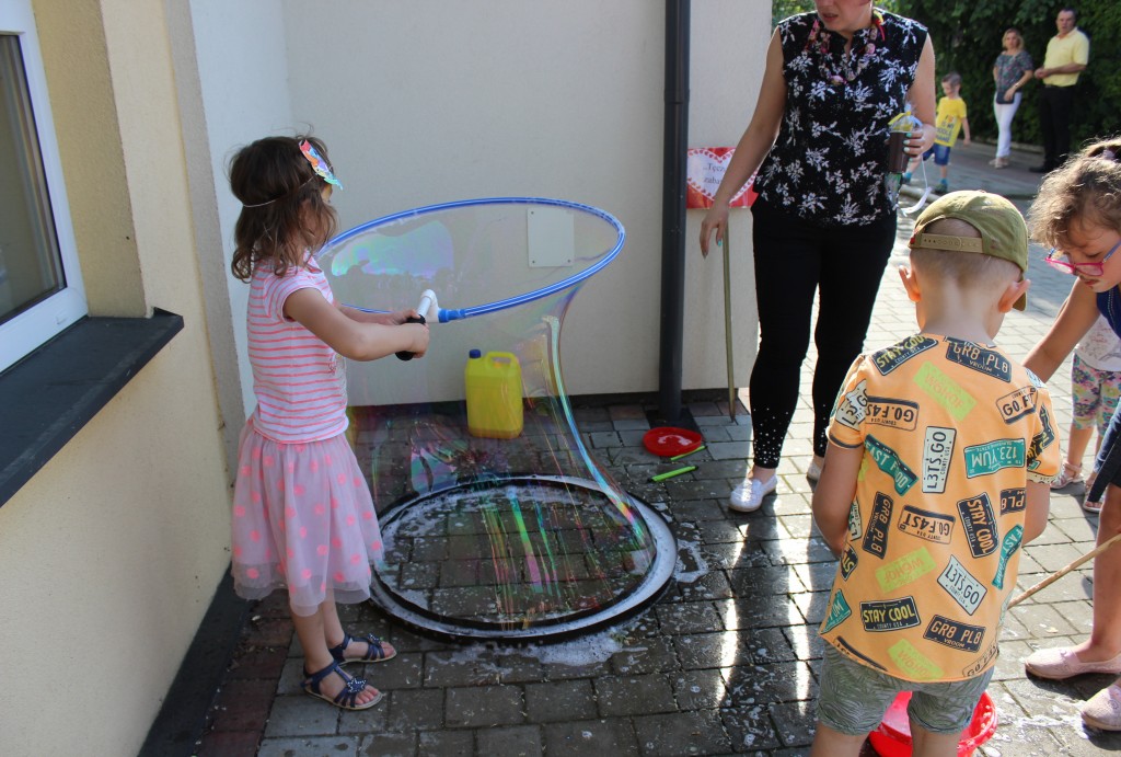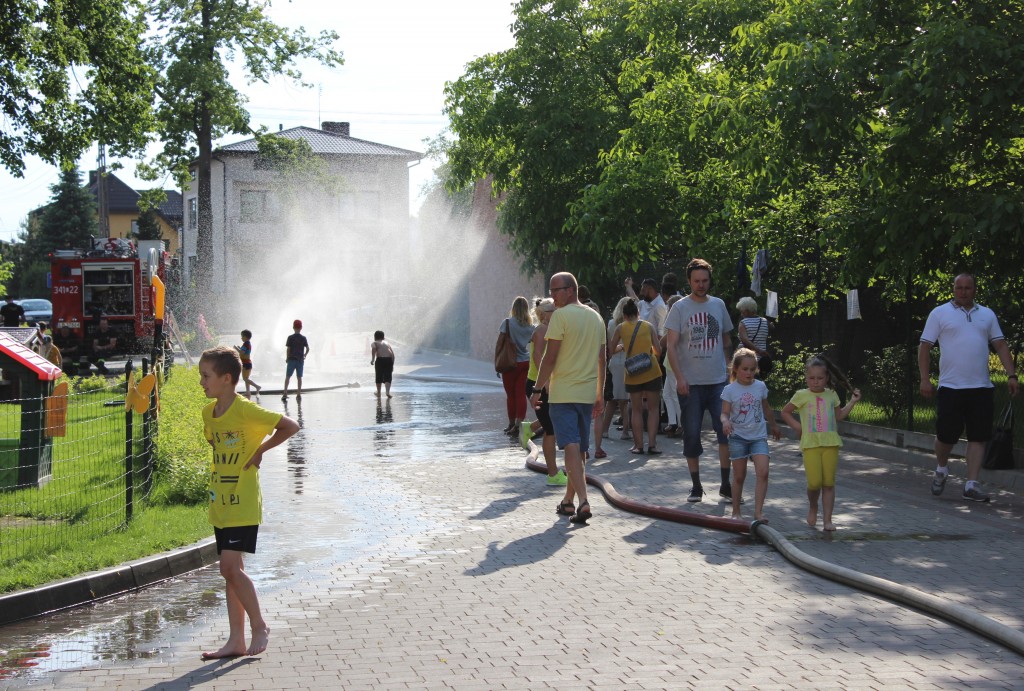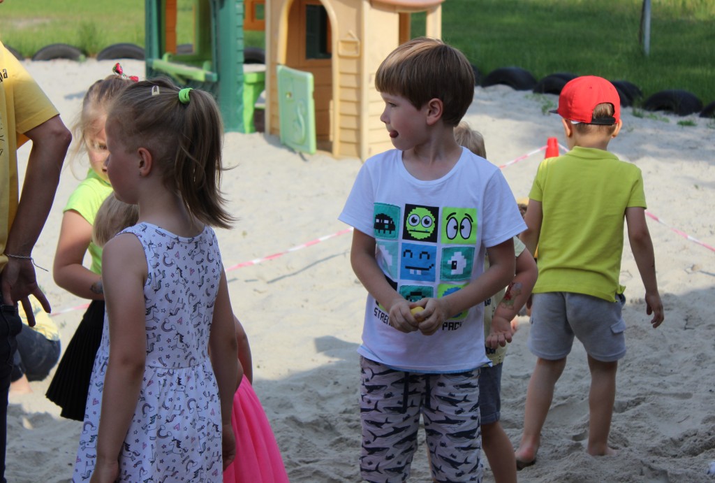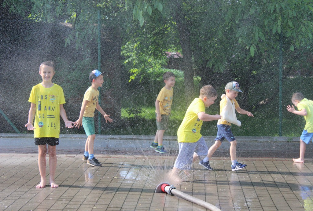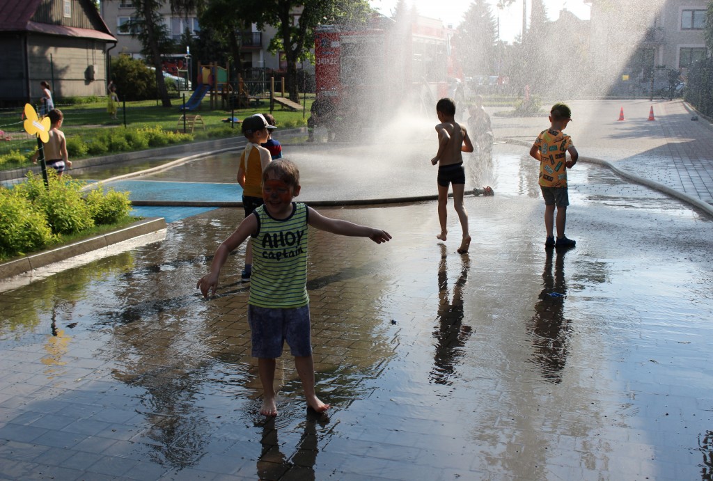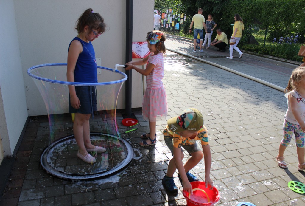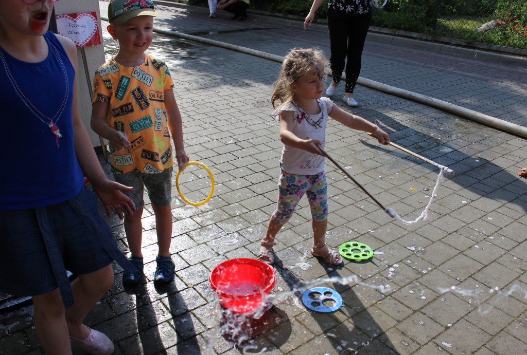 Po części oficjalnej, teren naszego przedszkola zamienił się w prawdziwy rodzinny piknik. Każdy mógł tam znaleźć coś dla siebie, od działań plastycznych po konkurencje ruchowe, stoisko z książkami i ścieżkę sensoryczną. Największą atrakcją niewątpliwie okazała się kurtyna wodna przygotowana przez straż pożarną, która dzięki dopisującej pogodzie zapewniła niesamowitą zabawę. Dzięki wsparciu rodziców nie zabrakło oczywiście małego co nieco w naszej kubusiowej kawiarence