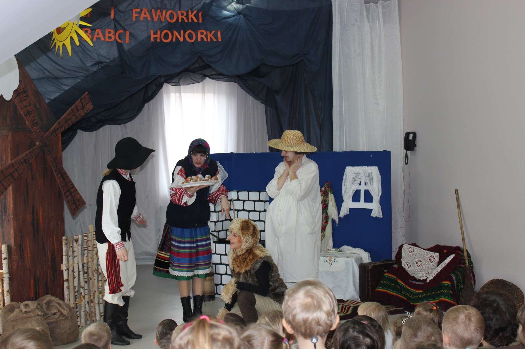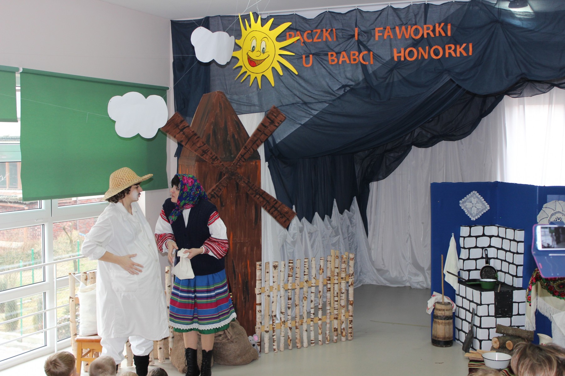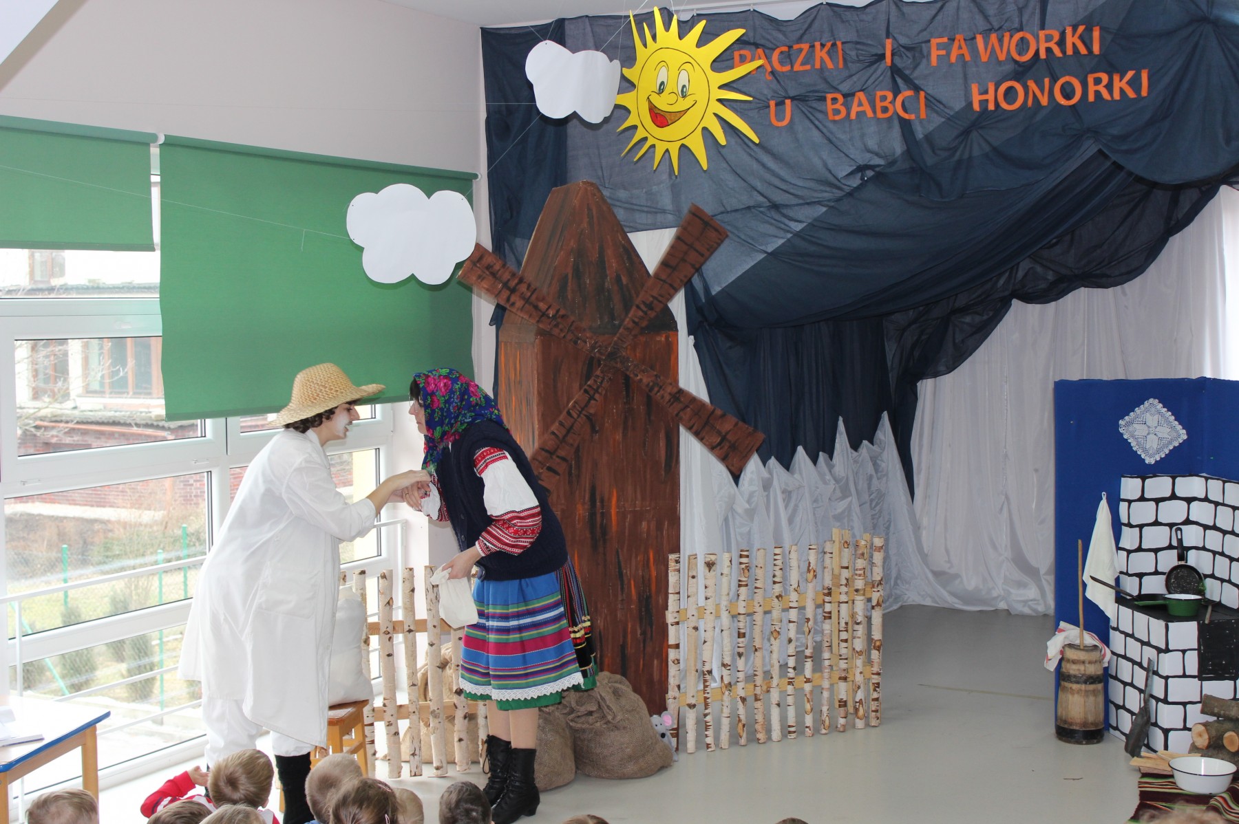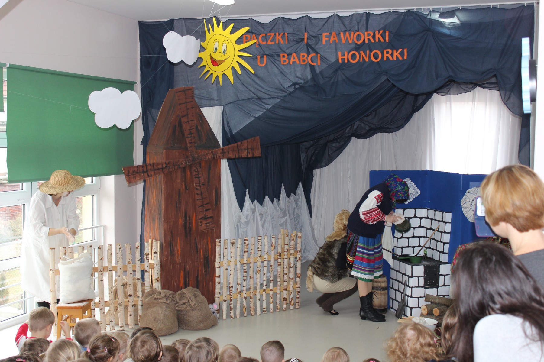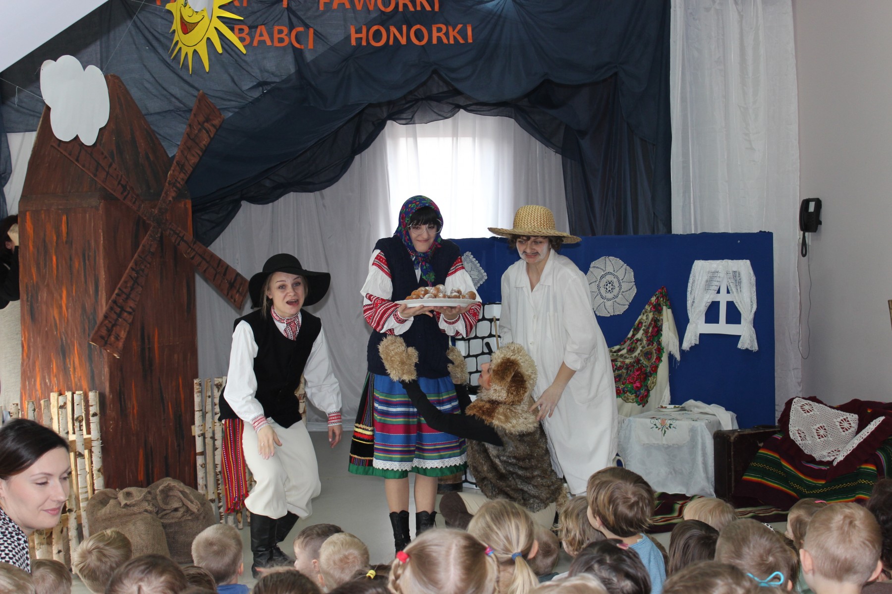 Scena stylizowana była na wnętrze wiejskiej chaty. Obok niej stanął duży młyn, którego skrzydła, dzięki specjalnej konstrukcji, można było wprawić w ruch. Uroku i ludowego klimatu dostarczały stroje z epoki, a sugestywna gra aktorska sprawiły, że mali widzowie oglądali przedstawienie z wielką ciekawością. Na zakończenie babcia Honorka poczęstowała małych widzów pysznymi pączkami a wszystkie przedszkolne grupy z chęcią sfotografowały się z całą ekipą aktorską.