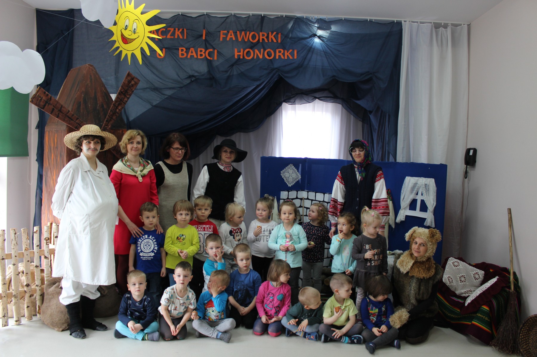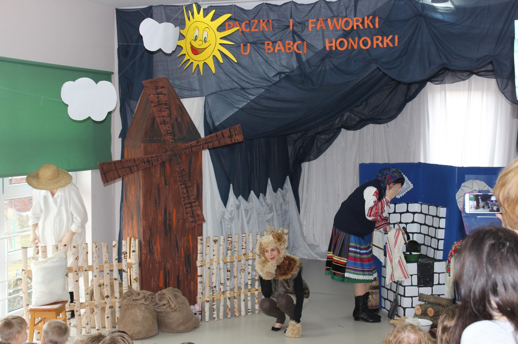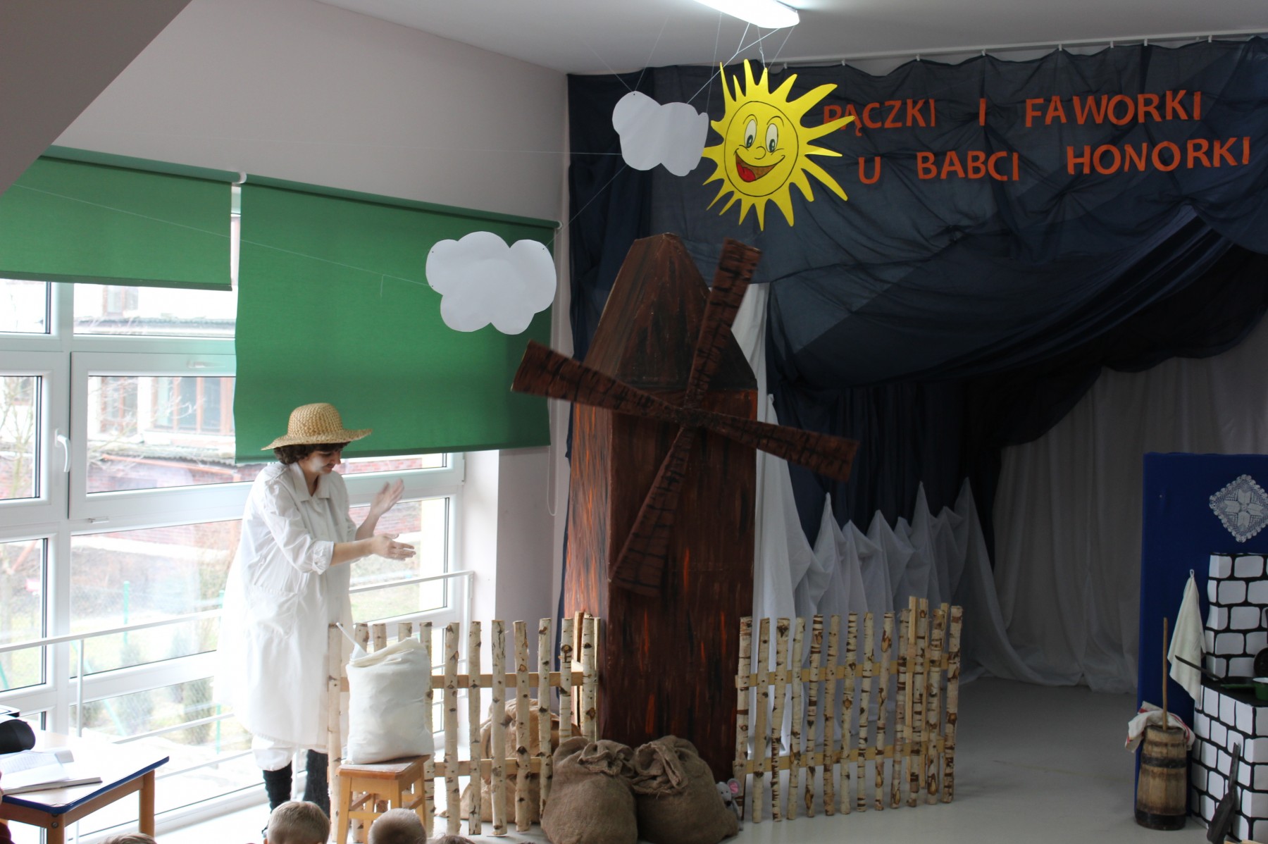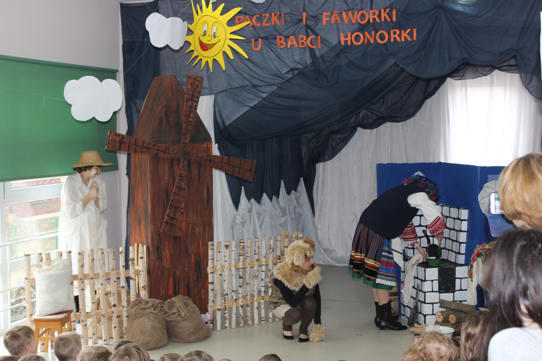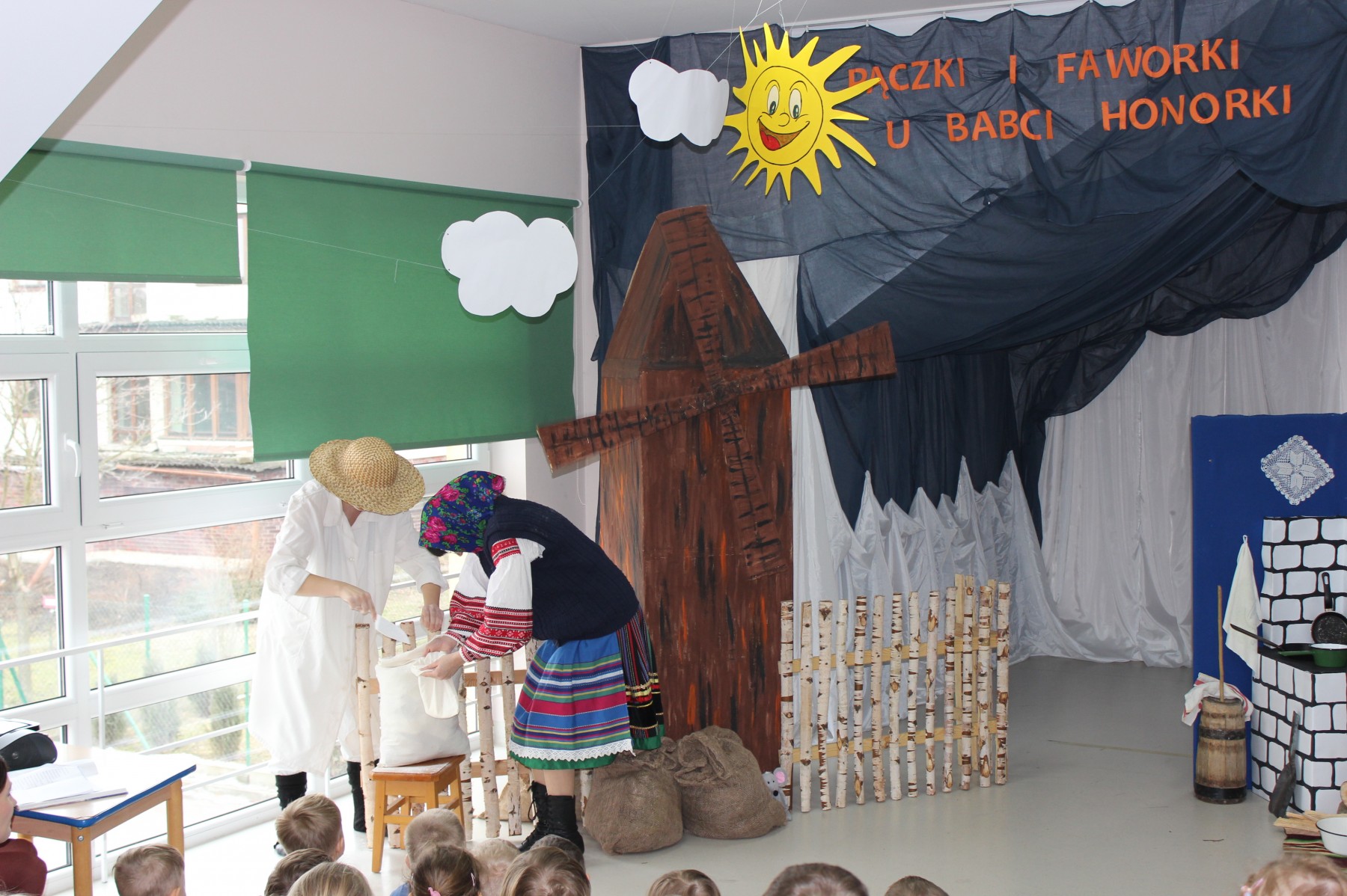 Scena stylizowana była na wnętrze wiejskiej chaty. Obok niej stanął duży młyn, którego skrzydła, dzięki specjalnej konstrukcji, można było wprawić w ruch. Uroku i ludowego klimatu dostarczały stroje z epoki, a sugestywna gra aktorska sprawiły, że mali widzowie oglądali przedstawienie z wielką ciekawością. Na zakończenie babcia Honorka poczęstowała małych widzów pysznymi pączkami a wszystkie przedszkolne grupy z chęcią sfotografowały się z całą ekipą aktorską.