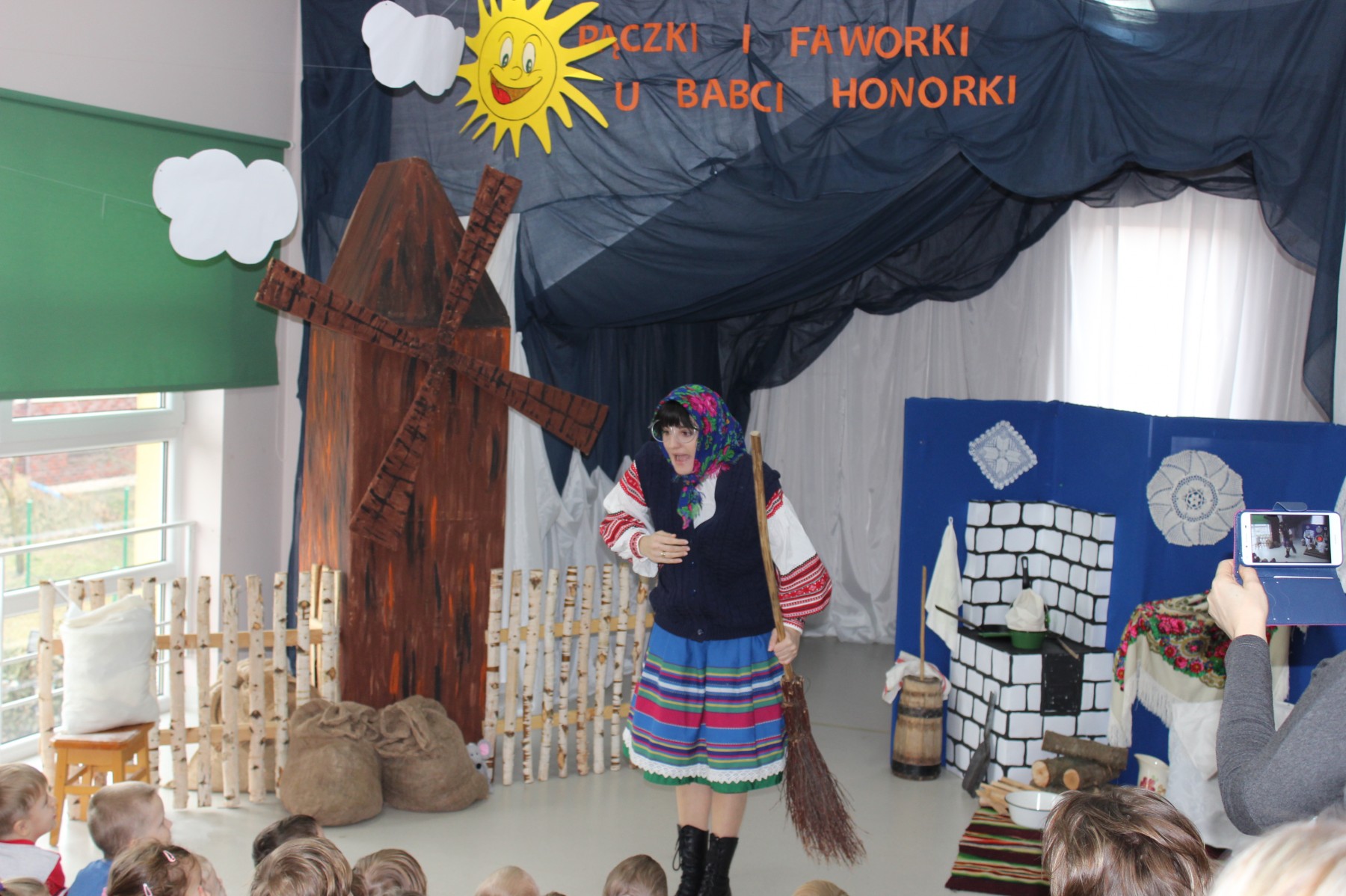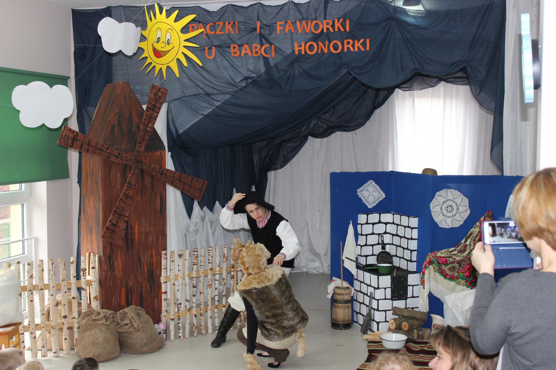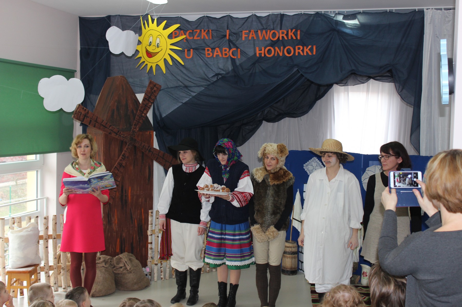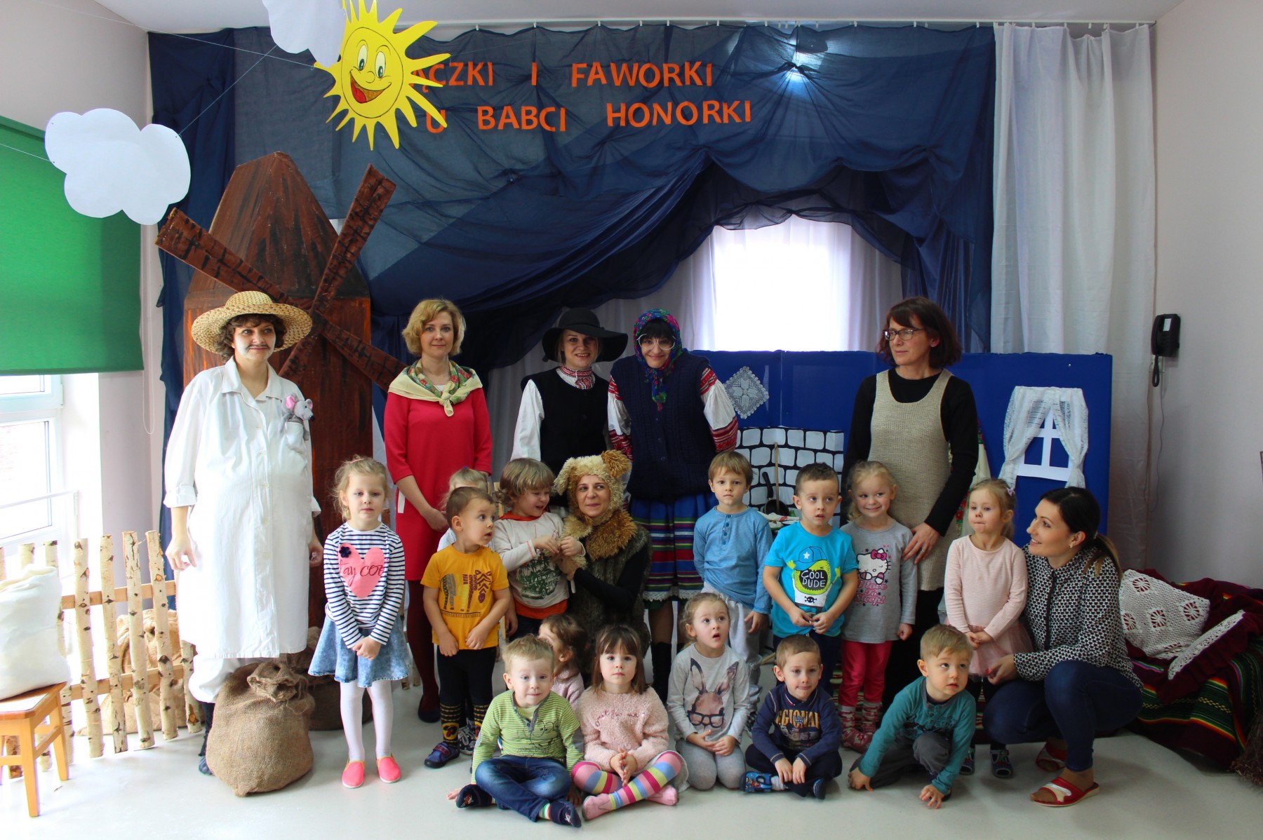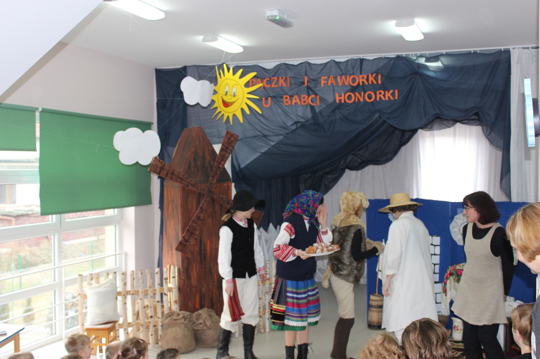 Scena stylizowana była na wnętrze wiejskiej chaty. Obok niej stanął duży młyn, którego skrzydła, dzięki specjalnej konstrukcji, można było wprawić w ruch. Uroku i ludowego klimatu dostarczały stroje z epoki, a sugestywna gra aktorska sprawiły, że mali widzowie oglądali przedstawienie z wielką ciekawością. Na zakończenie babcia Honorka poczęstowała małych widzów pysznymi pączkami a wszystkie przedszkolne grupy z chęcią sfotografowały się z całą ekipą aktorską.
