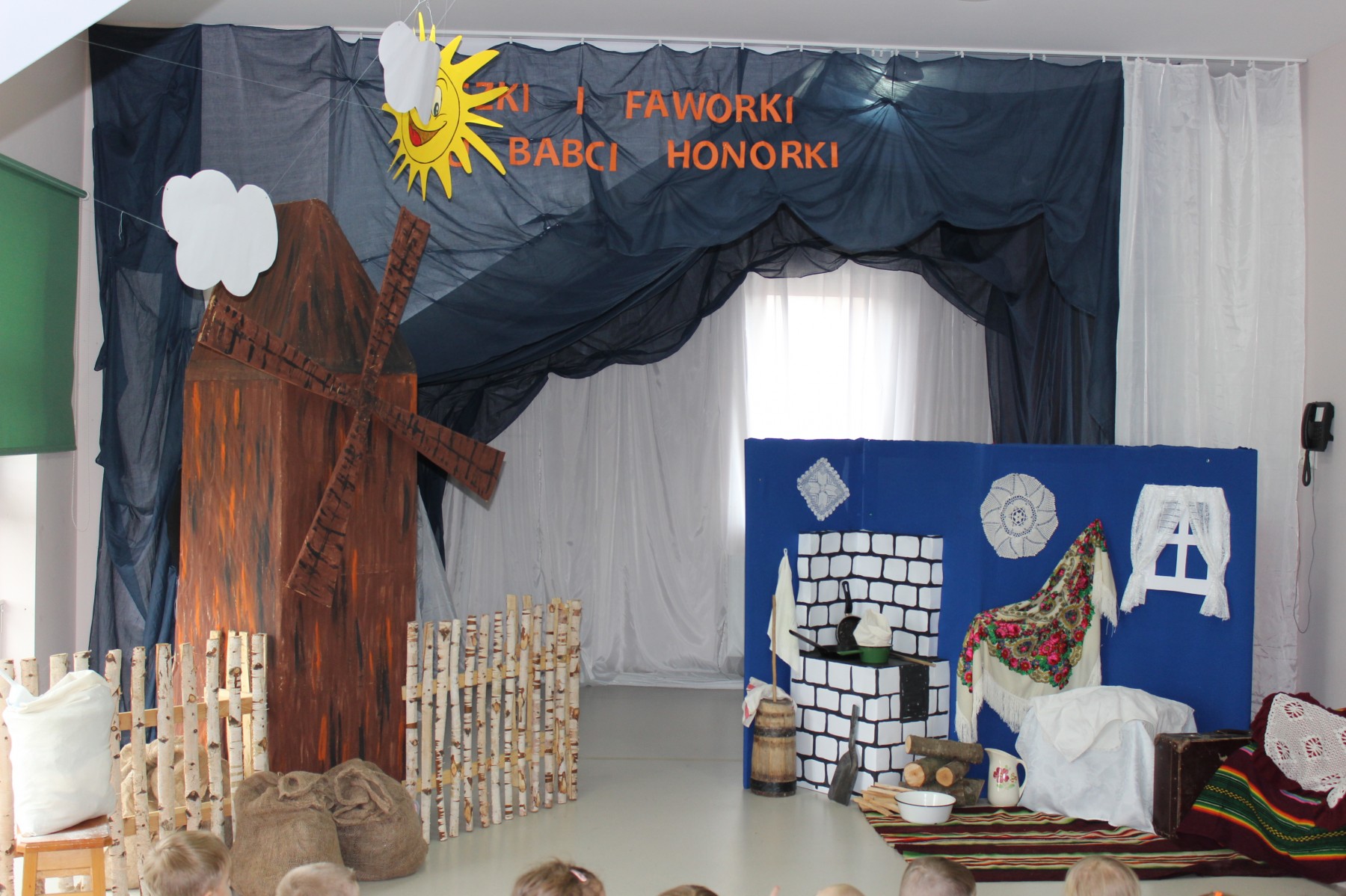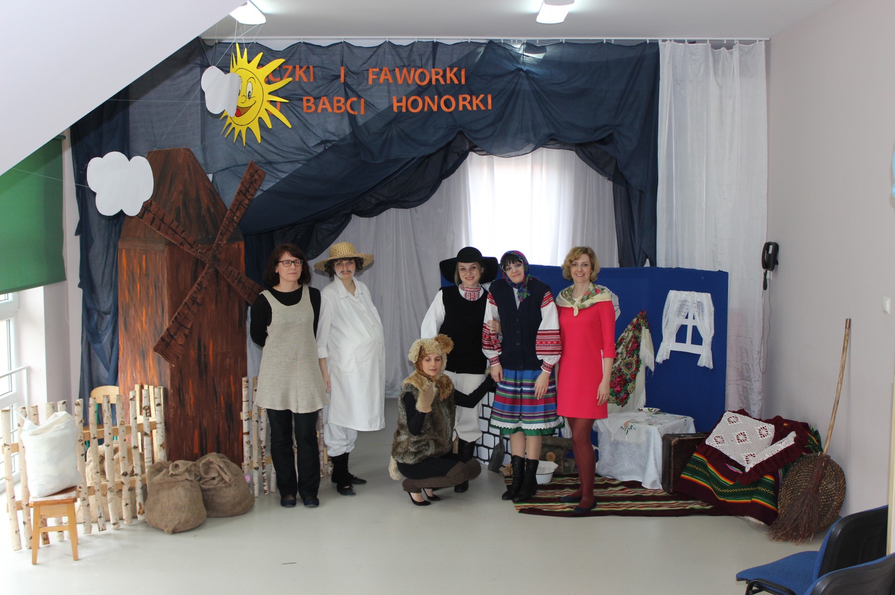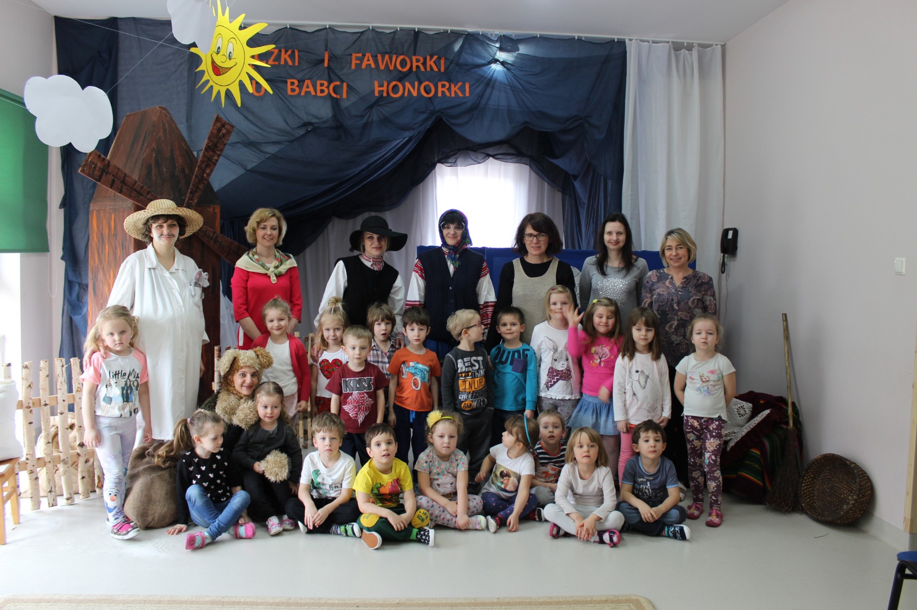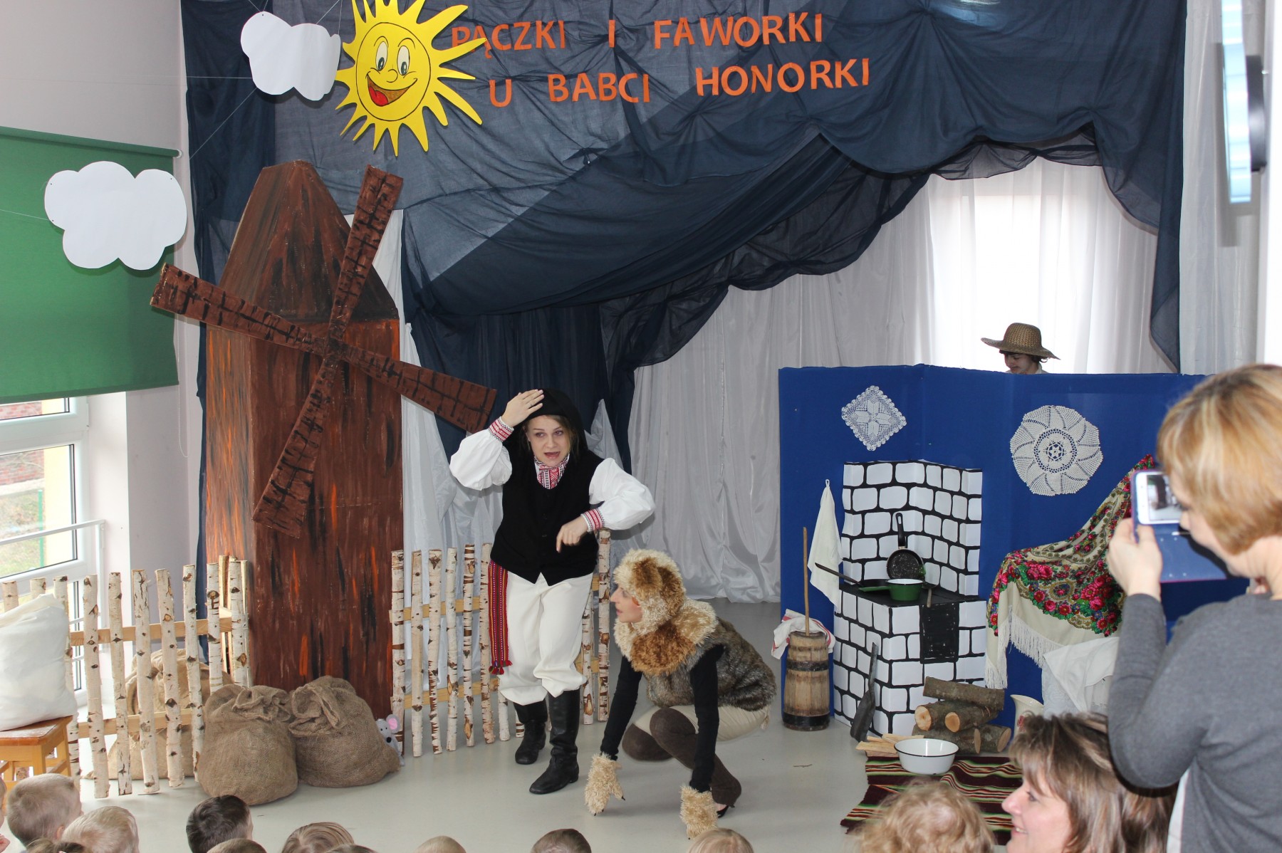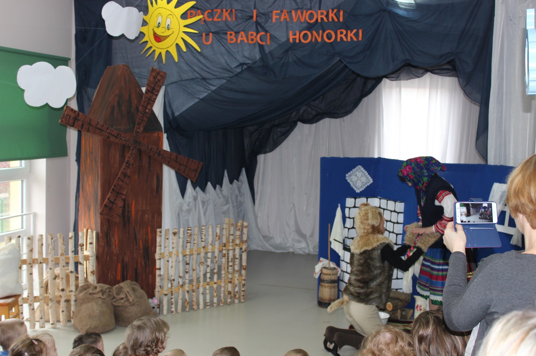 Scena stylizowana była na wnętrze wiejskiej chaty. Obok niej stanął duży młyn, którego skrzydła, dzięki specjalnej konstrukcji, można było wprawić w ruch. Uroku i ludowego klimatu dostarczały stroje z epoki, a sugestywna gra aktorska sprawiły, że mali widzowie oglądali przedstawienie z wielką ciekawością. Na zakończenie babcia Honorka poczęstowała małych widzów pysznymi pączkami a wszystkie przedszkolne grupy z chęcią sfotografowały się z całą ekipą aktorską.