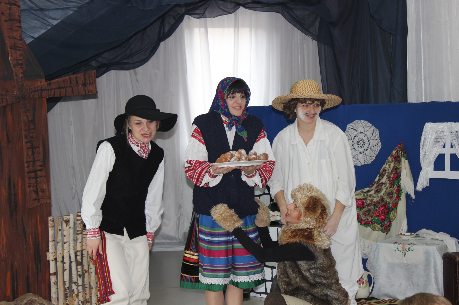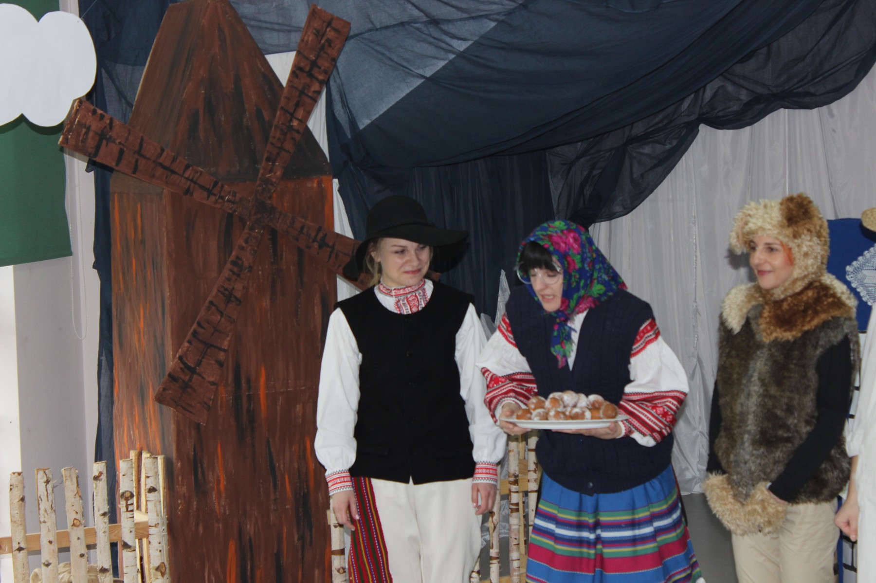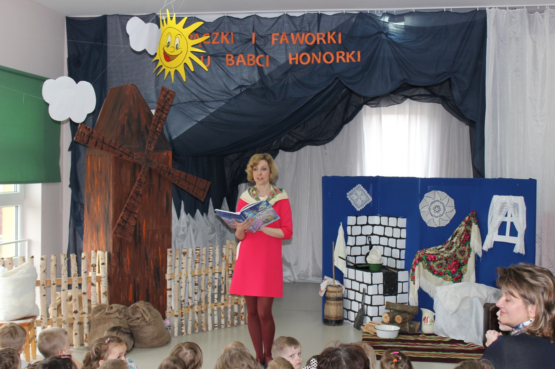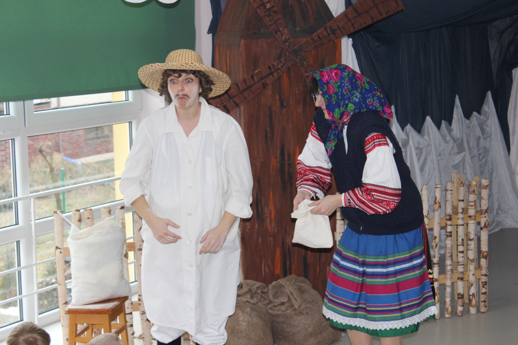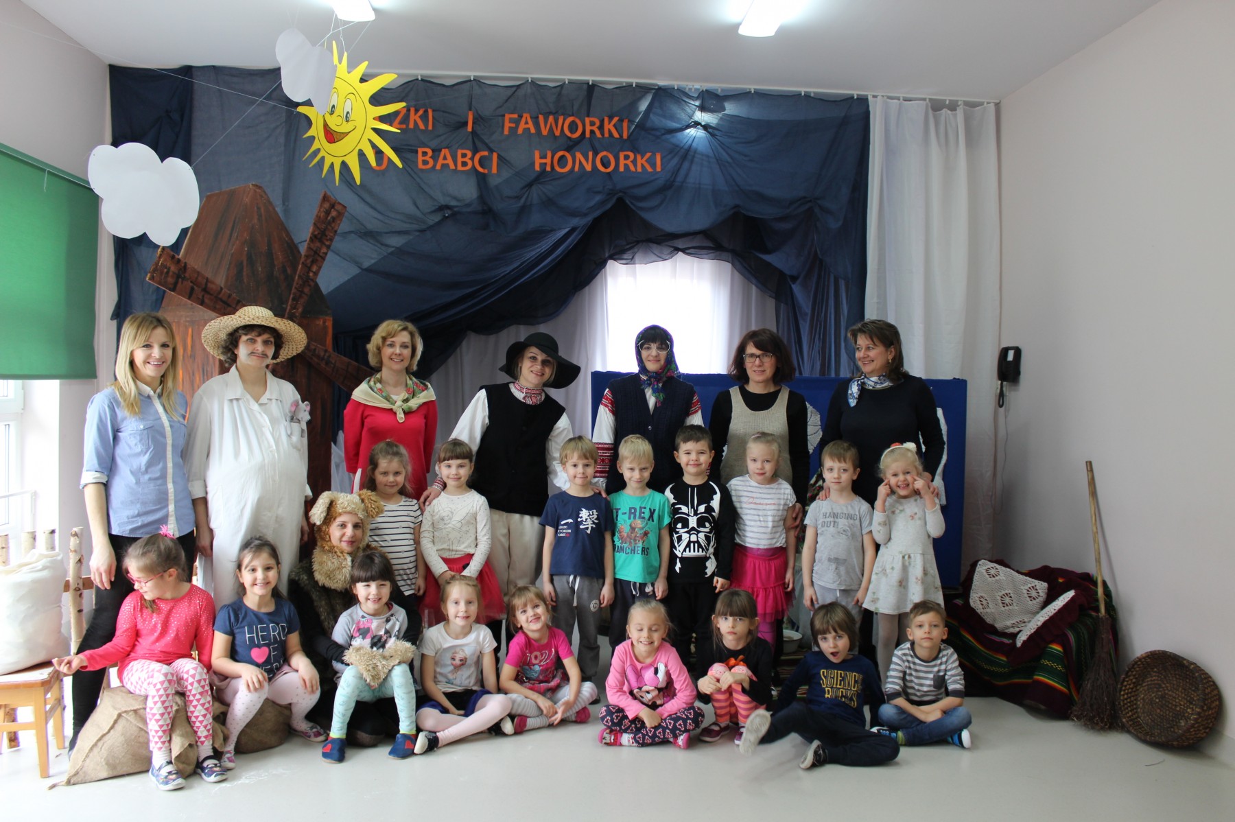 Scena stylizowana była na wnętrze wiejskiej chaty. Obok niej stanął duży młyn, którego skrzydła, dzięki specjalnej konstrukcji, można było wprawić w ruch. Uroku i ludowego klimatu dostarczały stroje z epoki, a sugestywna gra aktorska sprawiły, że mali widzowie oglądali przedstawienie z wielką ciekawością. Na zakończenie babcia Honorka poczęstowała małych widzów pysznymi pączkami a wszystkie przedszkolne grupy z chęcią sfotografowały się z całą ekipą aktorską.