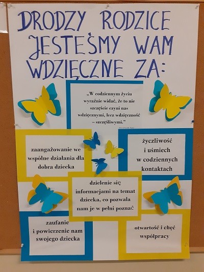 ... z lekkim niepokojem proponowaliśmy Państwu oraz sobie sposób świętowania Dnia Dobrego Słowa w październiku. Naszym zamysłem było połączenie świętowania Dnia Dobrego Słowa z Dniem Komisji Edukacji Narodowej. Zaproponowaliśmy Państwu świętowanie w duchu wdzięczności... Hasłem przewodnim uczyniłyśmy słowa "Wdzięczność wyrasta w szlachetnym sercu". Odpowiedź Państwa na naszą propozycję jest dla nas bardzo budująca. Jesteśmy przekonani o tym, że czas jaki poświęciliście aby wspólnie ze swoimi dziećmi, własnoręcznie wykonać laurki wdzięczności przyniesie dobre owoce w życiu obdarowujących oraz obdarowanych. Wielka była radość dzieci, które biegły obdarować swoje Panie tym co własnoręcznie wykonały. Ileż dobrych emocji było w tym jak opowiadały i pokazywały w jaki sposób wykonywały te laurki oraz w tym jak patrzyły na radość, zachwyt i zadziwienie obdarowanych osób.