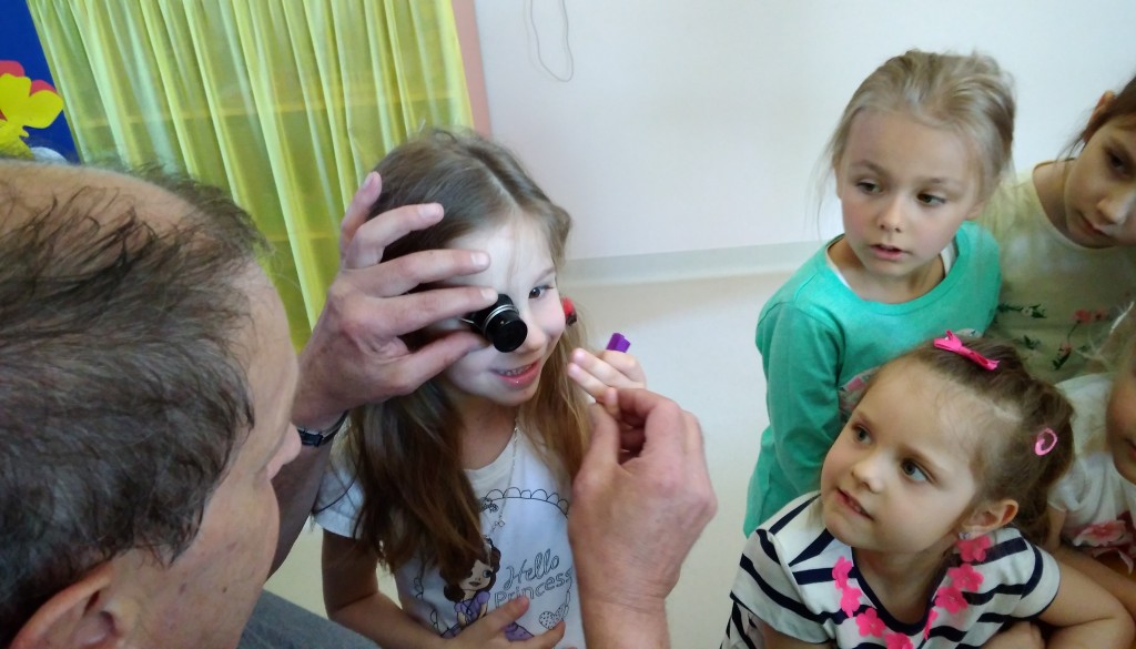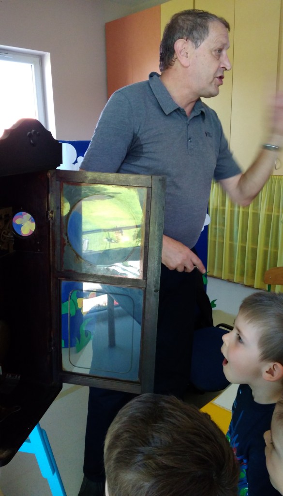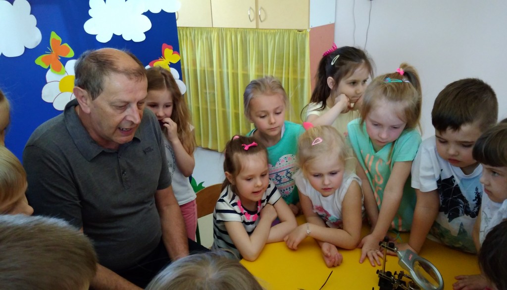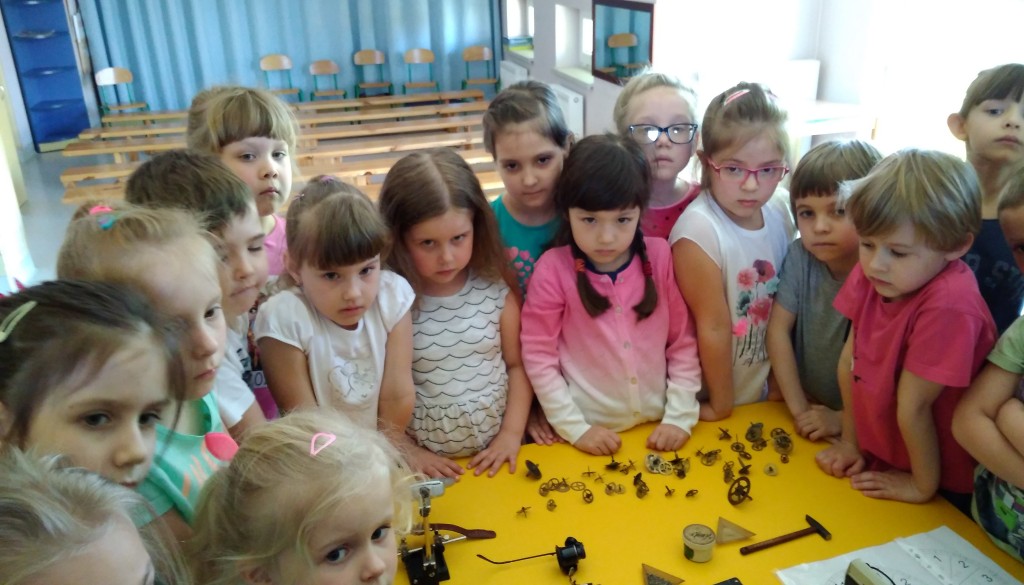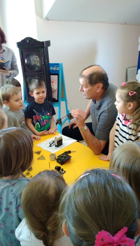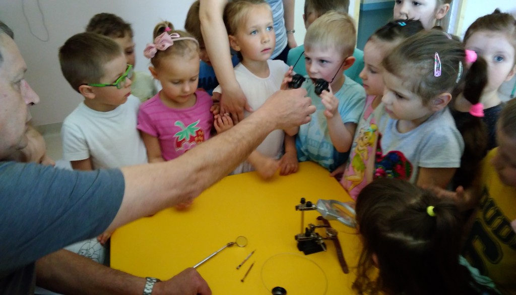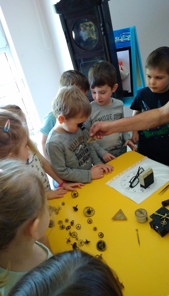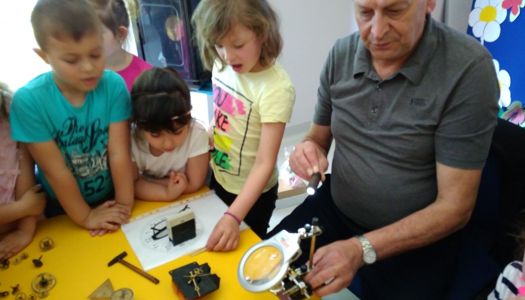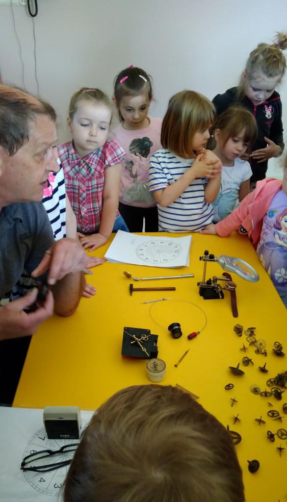 Dzień później, 17 maja dzieci uczestniczyły w spotkaniu z zegarmistrzem, panem Maciejem Sobieszczukiem. Na początku zajęć zaproszony gość porozmawiał z dziećmi o tym czym jest czas i czym możemy go zmierzyć. Następnie poszczególne grupy przedszkolne podchodziły do stolika, na którym rozłożone były części do zegarków i narzędzia zegarmistrza:śrubokręty, szkła i lupy oraz specjalne okulary. Dzieci zadawały wiele pytań, na które pan Maciej z chęcią odpowiadał. Na koniec spotkania, jego asystentka czyli wnuczka Pola, rozdała dzieciom kolorowanki przedstawiające zegarmistrza przy pracy.