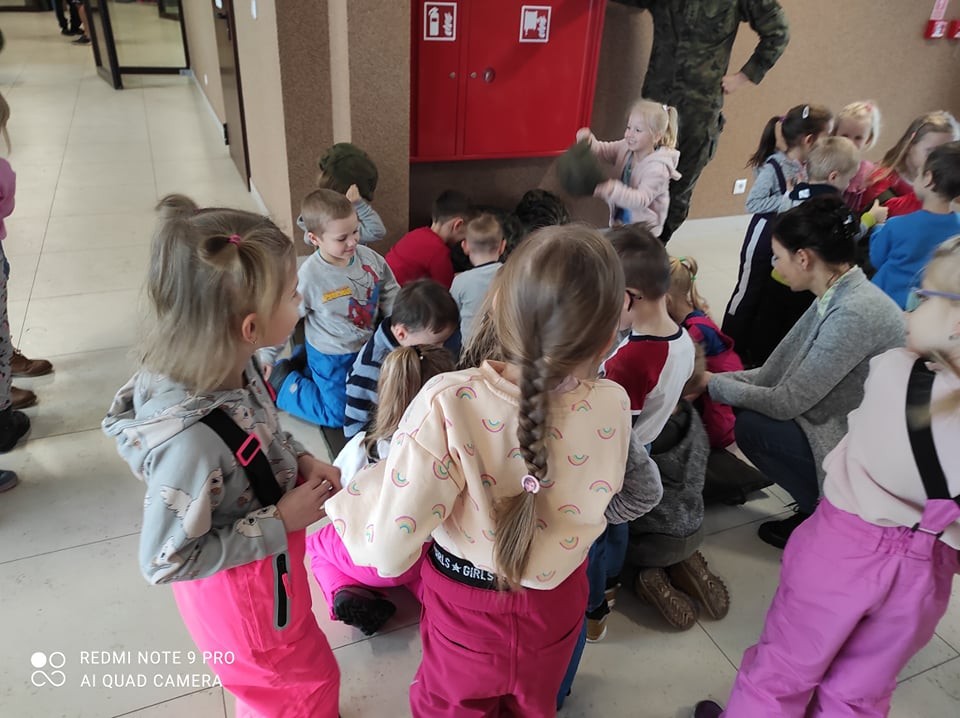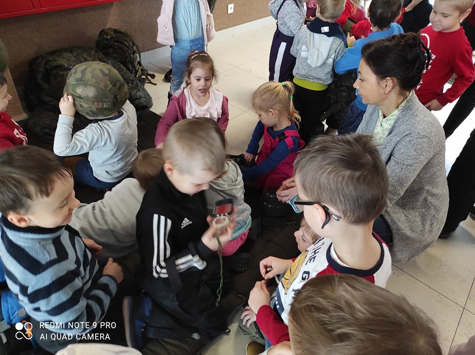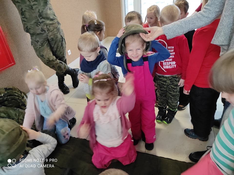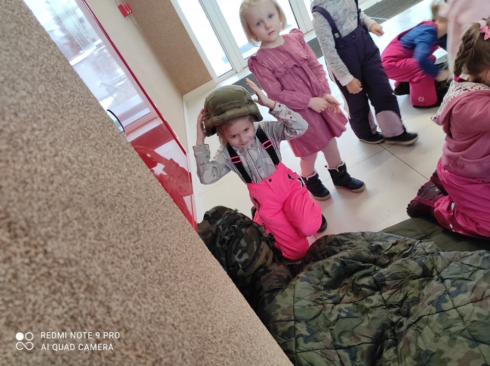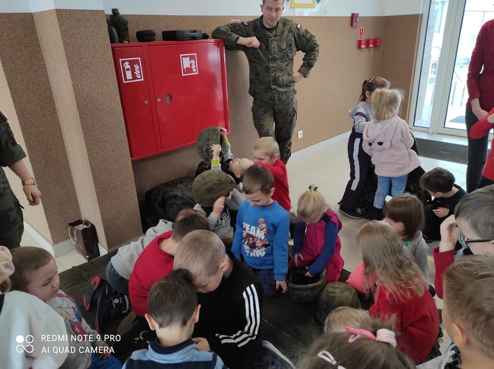 Akcja ta została połączona z akcją „Murem za mundurem”. Podczas pobytu na terenie jednostki wojskowej dzieci poznały pracę żołnierzy, dowiedziały się czym zajmuje się żołnierz, jakie cechy musi posiadać. Przedszkolaki z zaciekawieniem słuchały opowieści o pracy żołnierzy. Zobaczyły również jakimi przedmiotami posługują się żołnierze. Mogły zobaczyć jak wyglądają śpiwory, plecaki, kompasy, przybory do przechowywania żywności. Każdy mógł również przymierzyć hełm, który chroni głowę przed uderzeniem. Przedszkolaki zwiedziły również wojskową stołówkę oraz miejsce do spania. Dzieci zobaczyły plac apelowy oraz pojazdy znajdujące się na terenie jednostki. Dziękujemy serdecznie Pani ppor. M. Siennickiej oraz wszystkim żołnierzom Wojska Obrony Terytorialnej za zorganizowanie spotkania, przekazanie wielu cennych informacji oraz za życzliwość i otwartość jak panowała podczas spotkania.