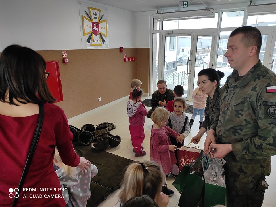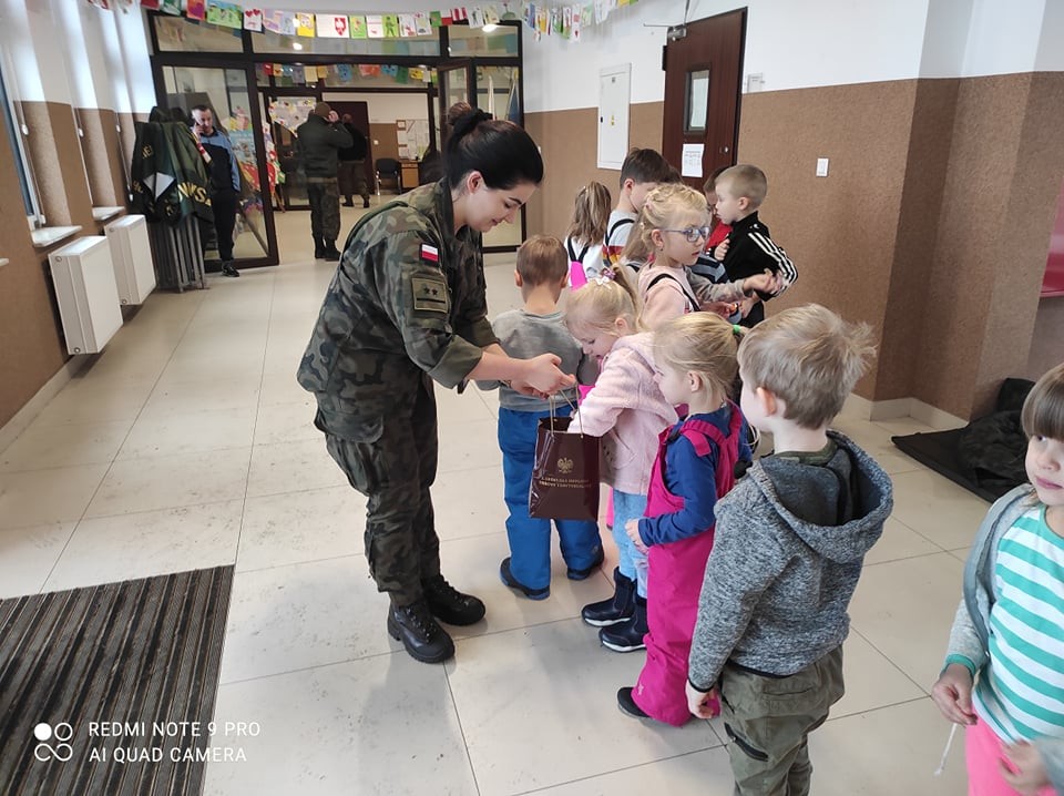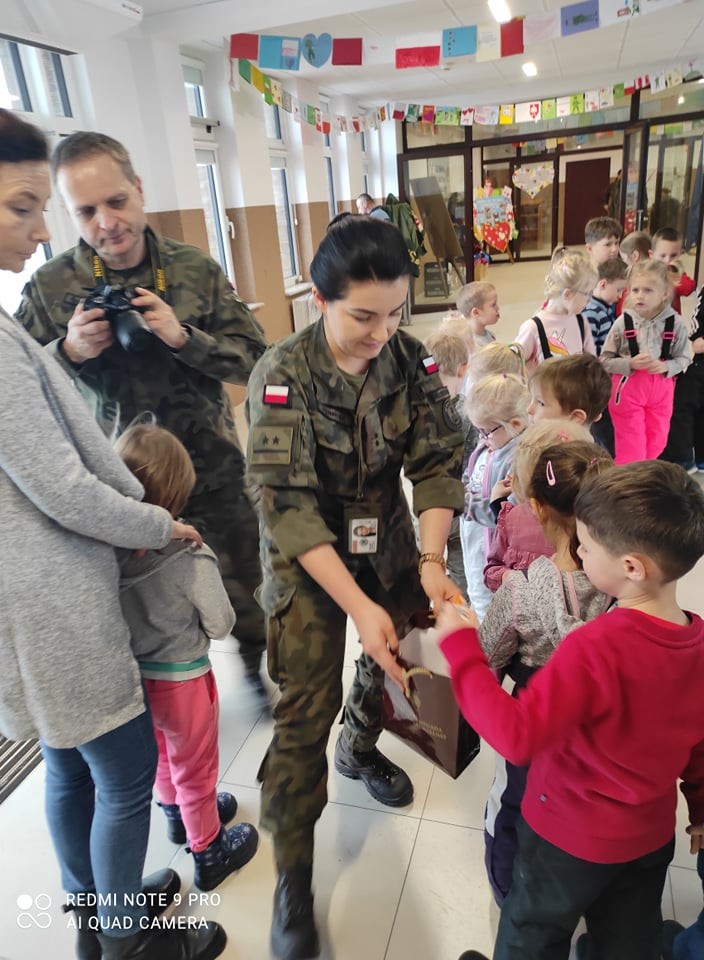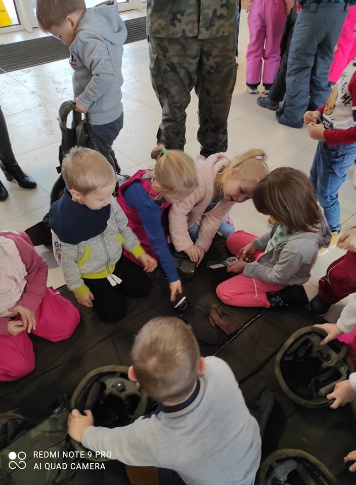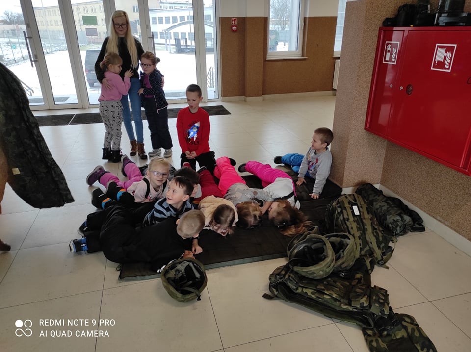 Akcja ta została połączona z akcją „Murem za mundurem”. Podczas pobytu na terenie jednostki wojskowej dzieci poznały pracę żołnierzy, dowiedziały się czym zajmuje się żołnierz, jakie cechy musi posiadać. Przedszkolaki z zaciekawieniem słuchały opowieści o pracy żołnierzy. Zobaczyły również jakimi przedmiotami posługują się żołnierze. Mogły zobaczyć jak wyglądają śpiwory, plecaki, kompasy, przybory do przechowywania żywności. Każdy mógł również przymierzyć hełm, który chroni głowę przed uderzeniem. Przedszkolaki zwiedziły również wojskową stołówkę oraz miejsce do spania. Dzieci zobaczyły plac apelowy oraz pojazdy znajdujące się na terenie jednostki. Dziękujemy serdecznie Pani ppor. M. Siennickiej oraz wszystkim żołnierzom Wojska Obrony Terytorialnej za zorganizowanie spotkania, przekazanie wielu cennych informacji oraz za życzliwość i otwartość jak panowała podczas spotkania.