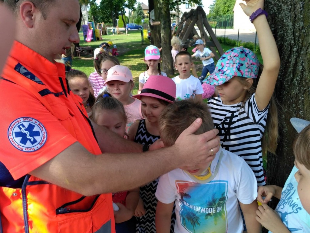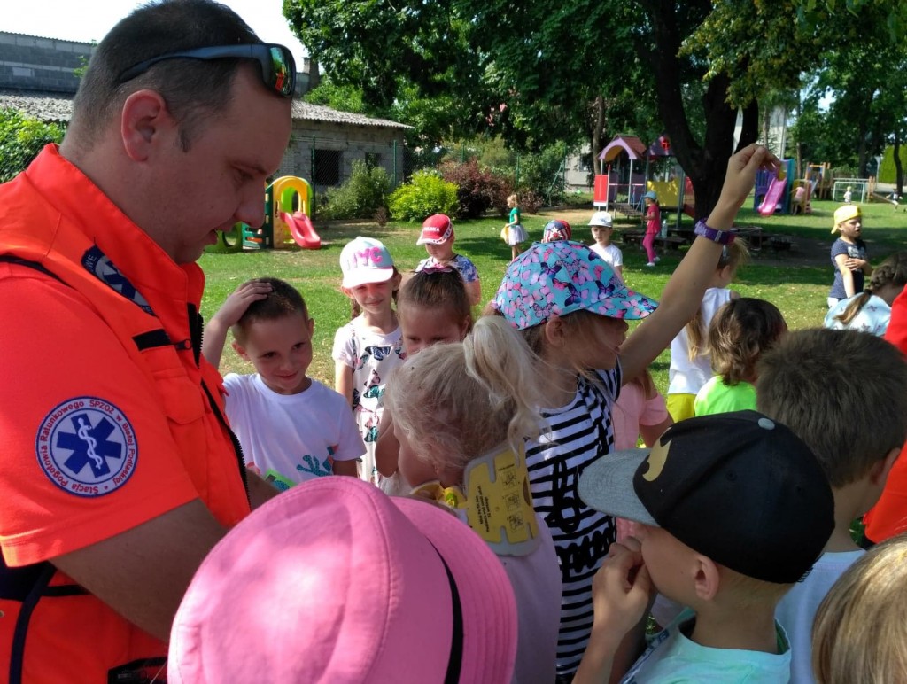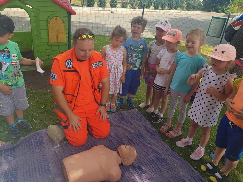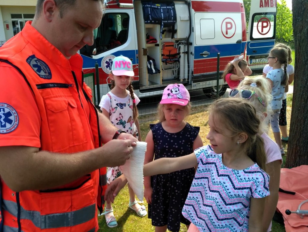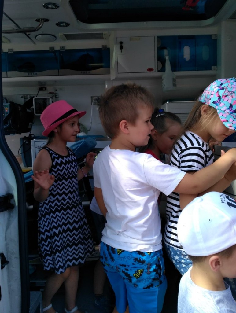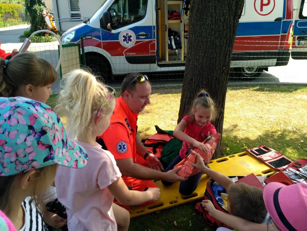 Panowie pozwolili dzieciom zajrzeć do wnętrza karetki, gdzie zaprezentowali w jaki sposób udzielają pierwszej pomocy przedmedycznej. Ochotnicy mogli na własnej skórze doświadczyć niektórych zabiegów. Największym wyzwaniem okazało się prawidłowe wykonanie masażu serca. Dzieci wkładały całe serca żeby tylko uratować fantomowego pacjenta. Na koniec ratownicy pożegnali nas głośnym sygnałem karetki a przedszkolaki bogatsze o nowe doświadczenia powróciły do zabawy na świeżym powietrzu.
